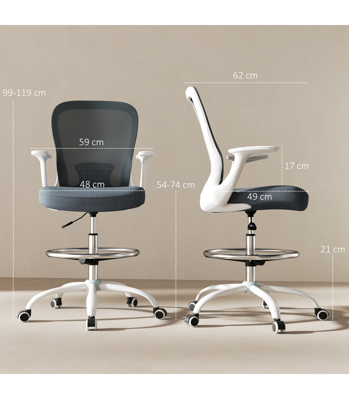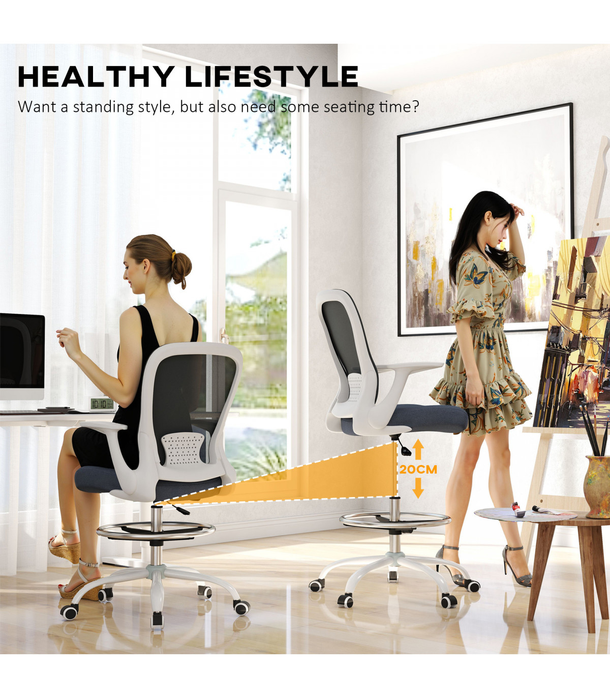 Discover the comfort of the HOMCOM Draughtsman Chair, featuring flip-up armrests that tuck neatly under your desk and an adjustable seat height for tailored positioning. This high office chair includes a foot ring for added support and a breathable mesh cover with lumbar support to keep you cool and comfortable. Suitable as a perching stool or workshop stool, it's the smart choice for any workspace.