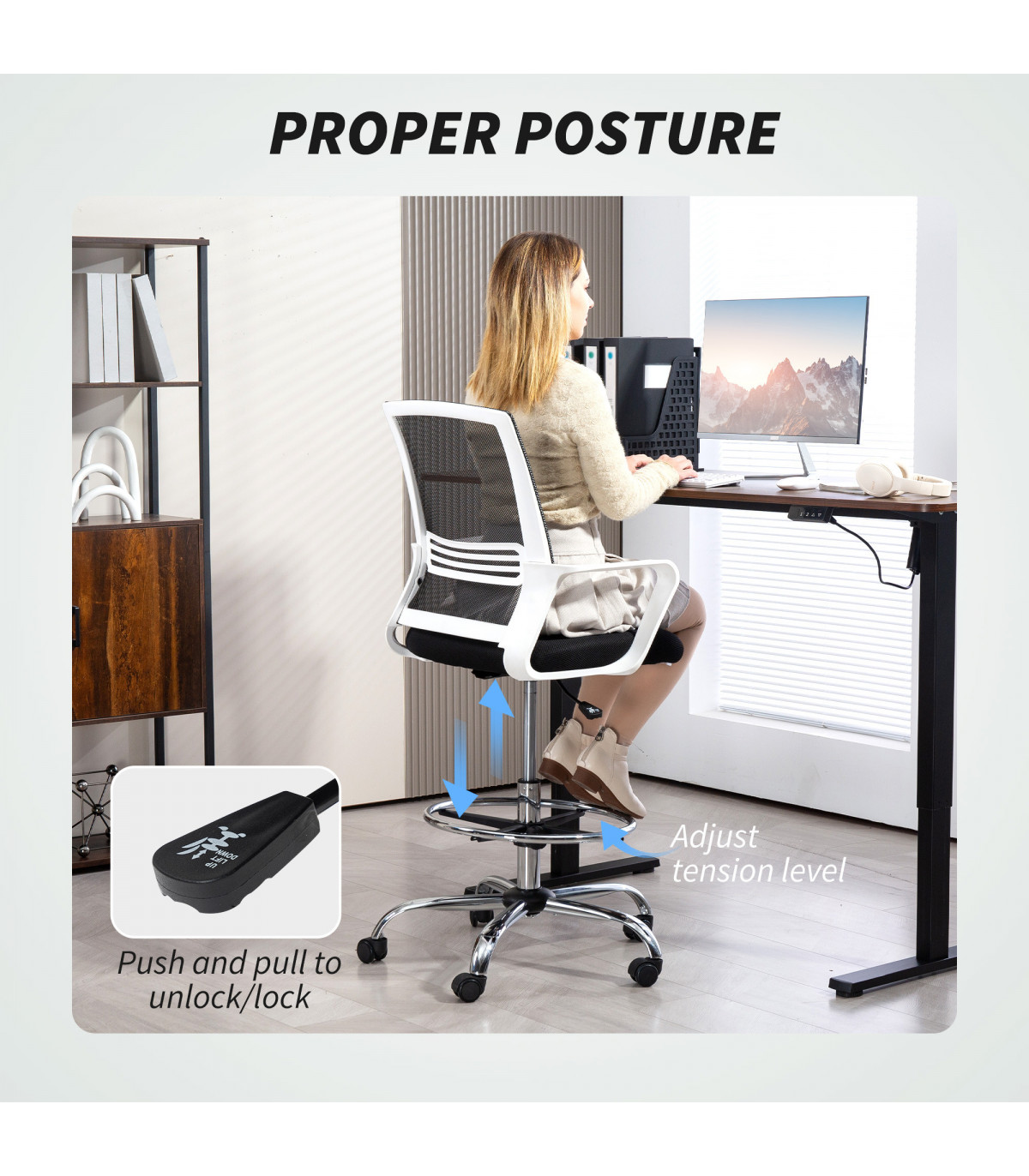 ● Adjustable seat height and foot ring height, enhance comfort and posture