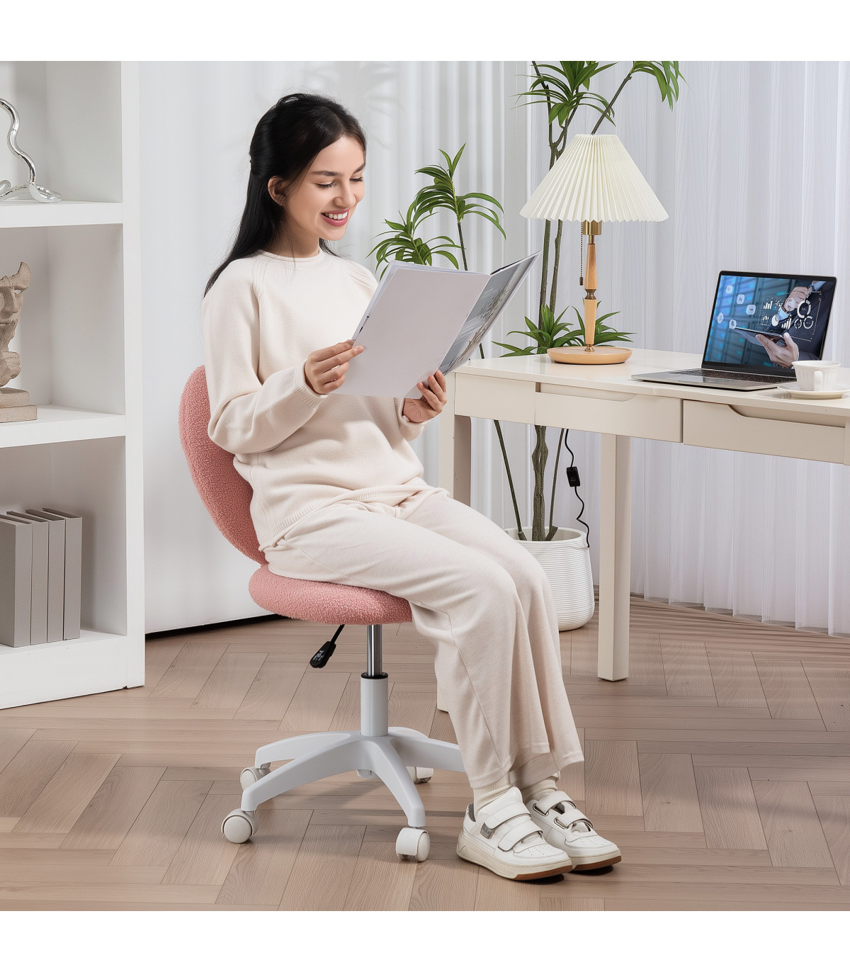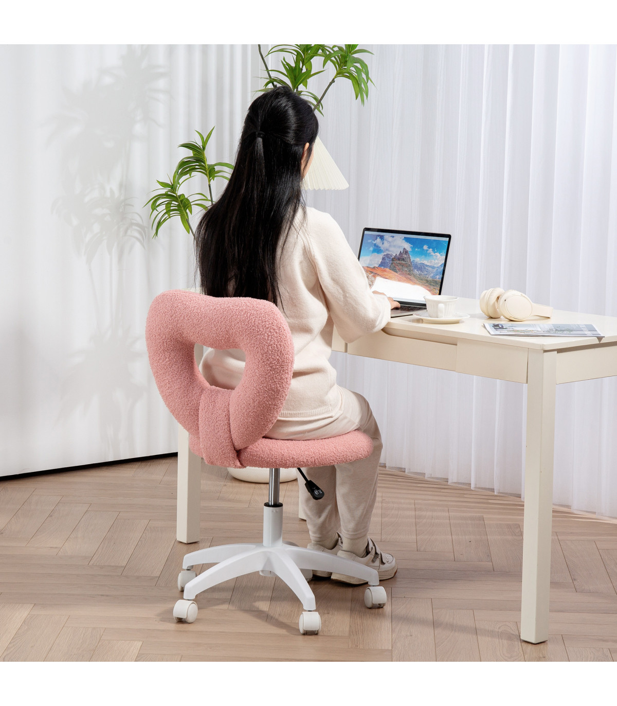 it's a cosy haven with its teddy fleece fabric and plush, high-density foam. Whether used as a home office chair, study chair, or small office chair, its adjustable height and swivel wheels ensure all-day comfort and mobility.