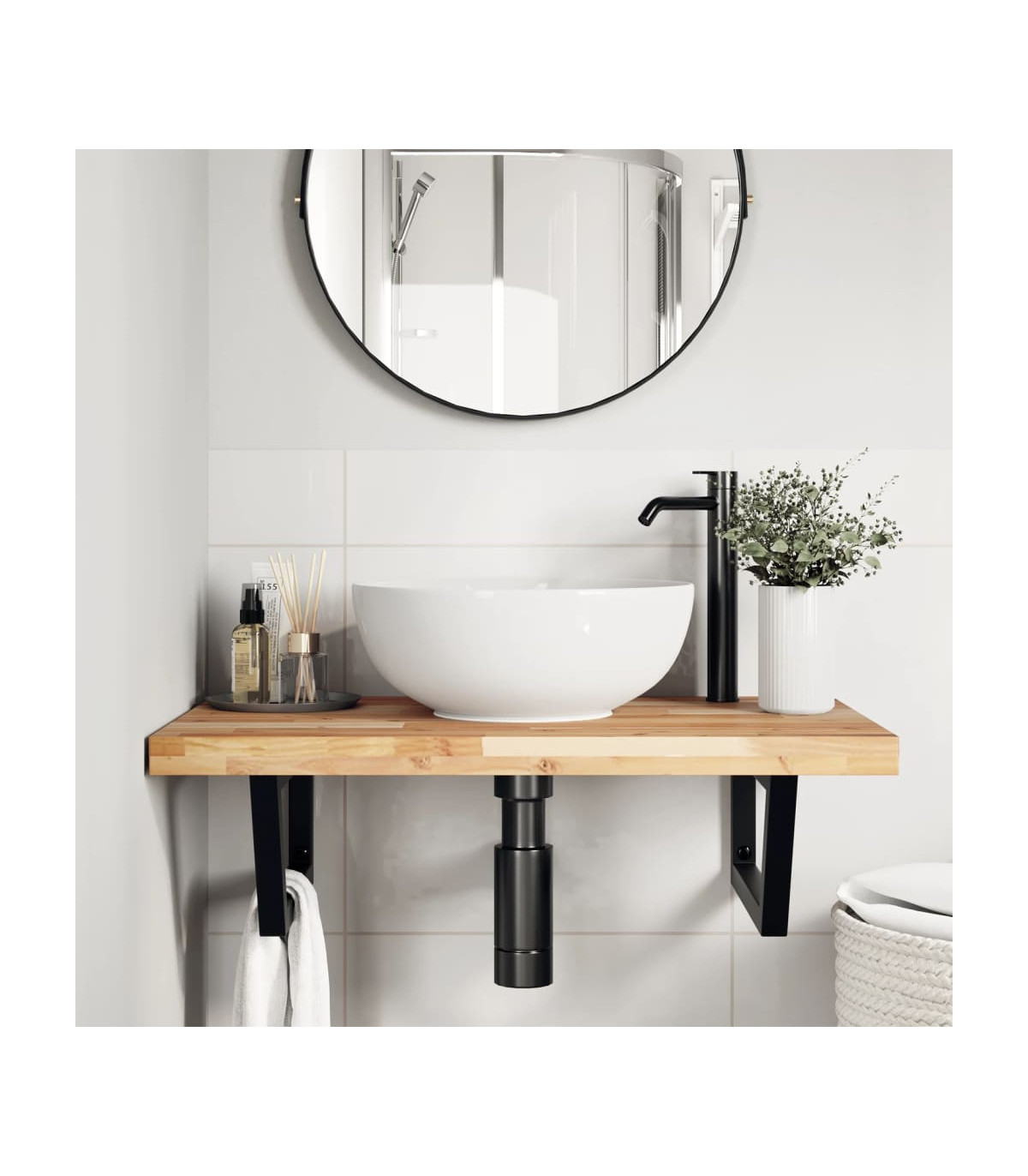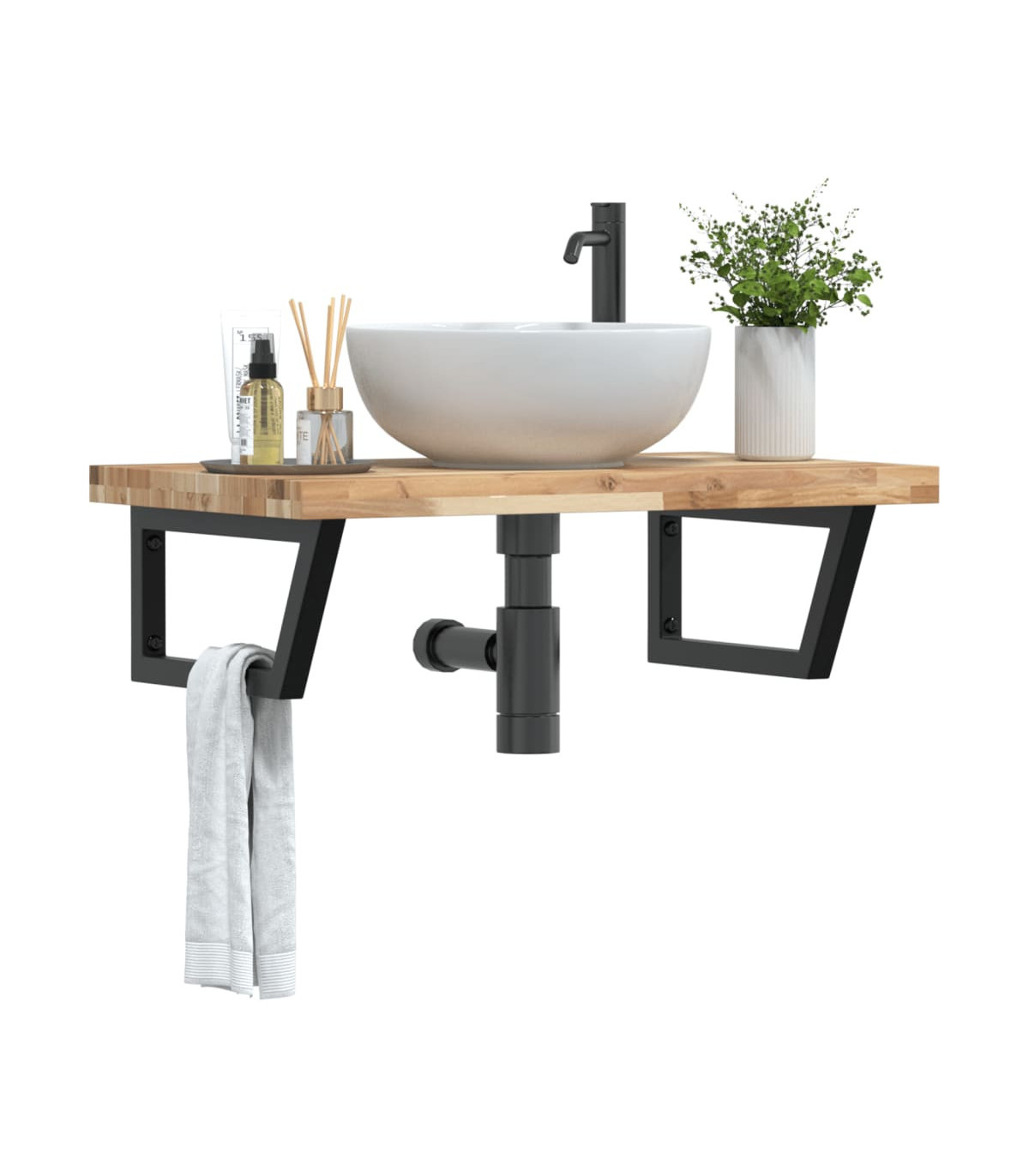 The wall mounted basin shelf securely attaches to the wall, providing an elegant and space-saving solution for your bathroom. Sturdy and long-lasting: This basin shelf is combined with a steel structure and a solid acacia wood top, making it sturdy, stable, and long-lasting.Space-saving: The floating basin shelf has ample space to store creams and small items. Thanks to the rectangular shape, you can hang towels or other things on the support to save space.Easy to use: The countertop comes undrilled to allow the basin to be mounted on the left, right, or in the centre, depending on your room's requirements. Thanks to the pre-drilled holes in the holder, it can be easily assembled with the tabletop and mounted on the wall.Wide applications: Thanks to its modern design, it provides additional space for various types of bathrooms. Good to know:Screws are not included, you can purchase the screws separately based on the information provided below.Wall attachment: 2 pcs M8 expansion screws per bracketWooden top: 2 pcs M5x18 screws (T=2) or 2 pcs M5x20 screws (T=2,5/4cm) per bracket