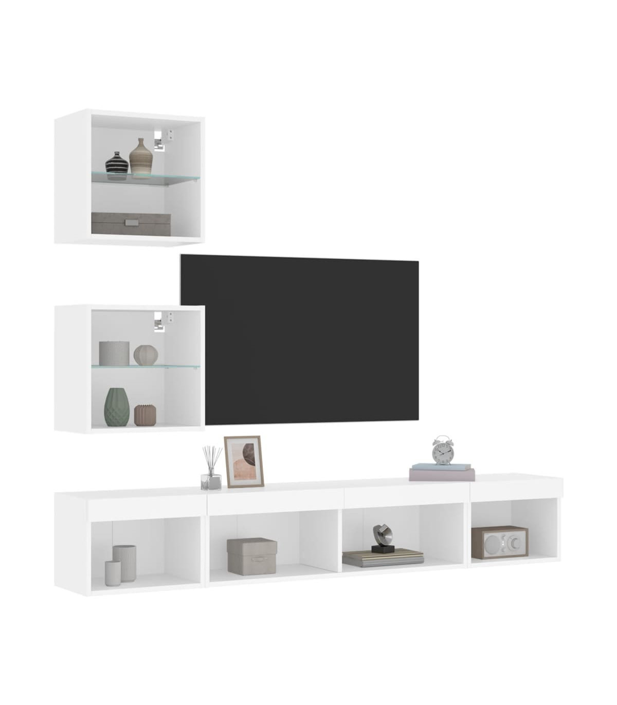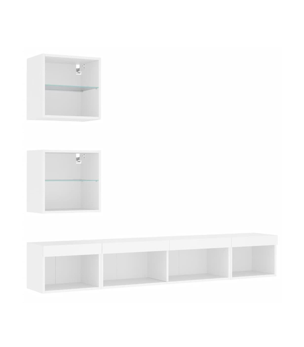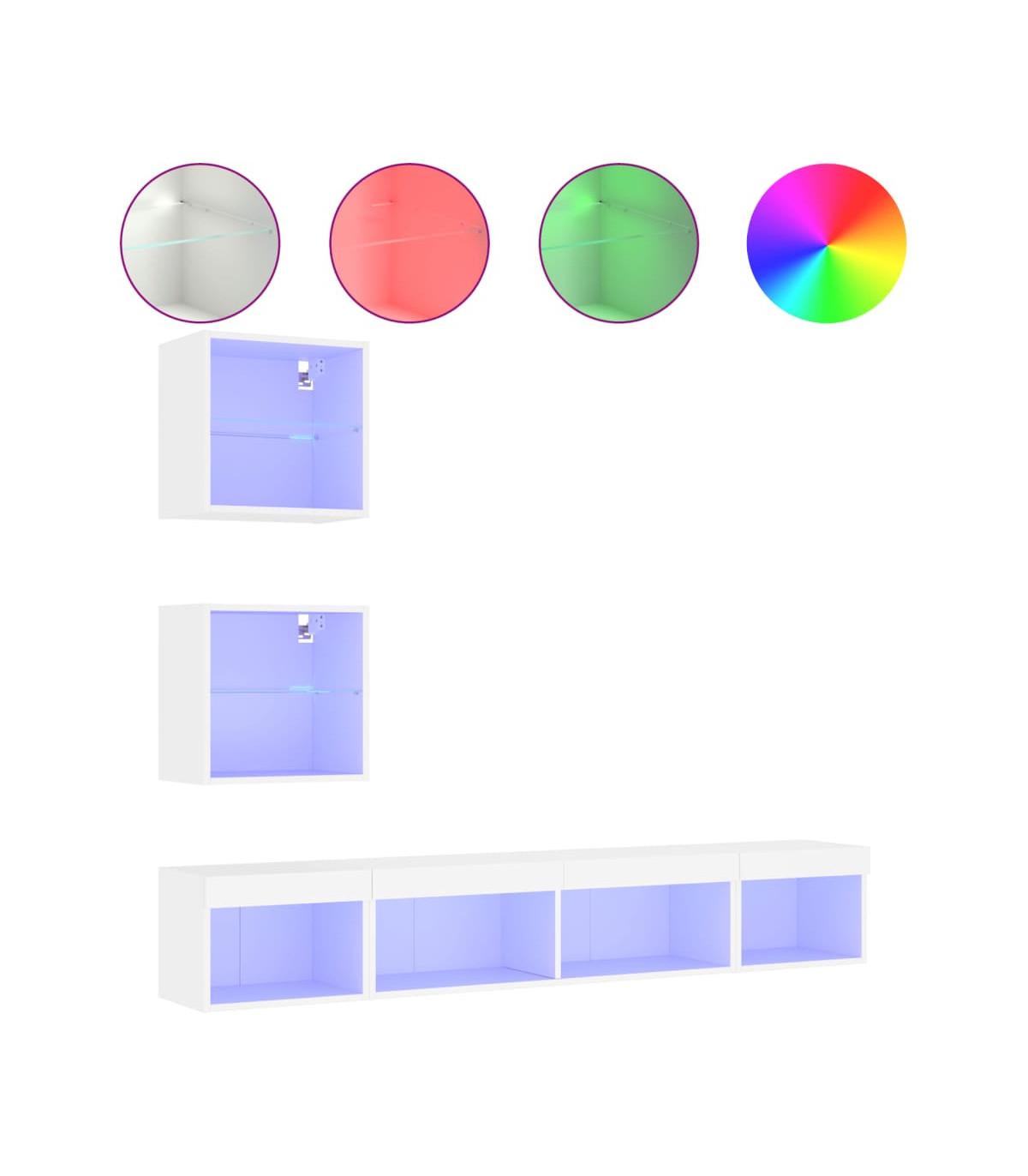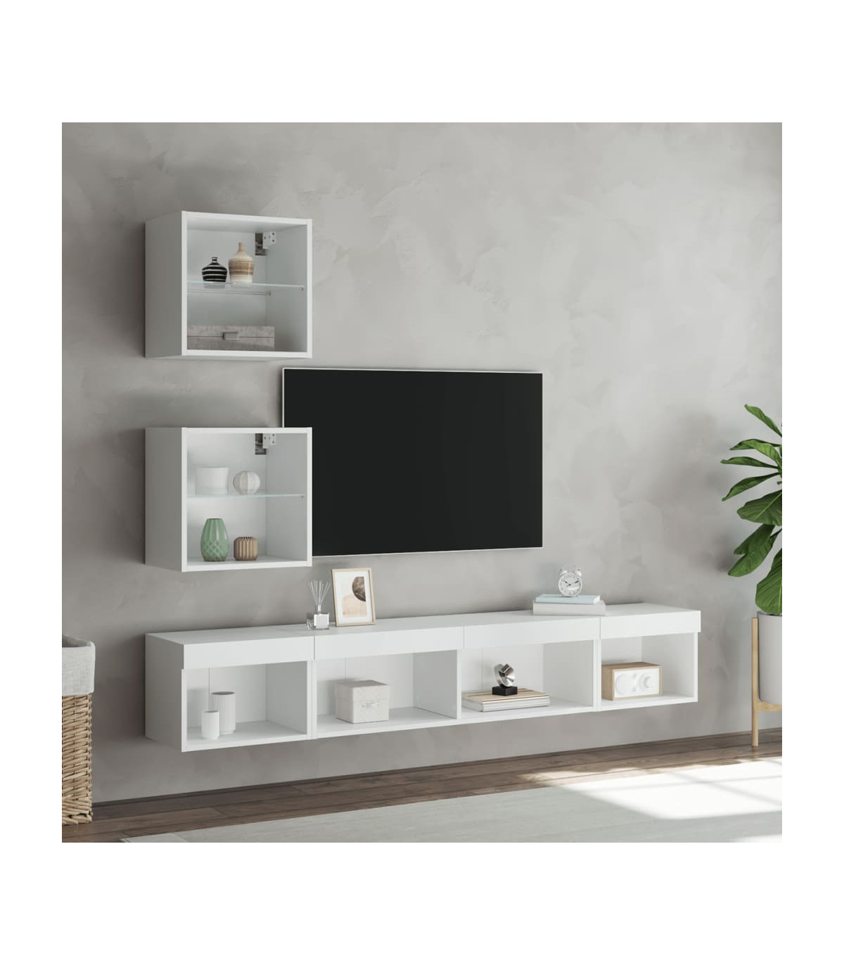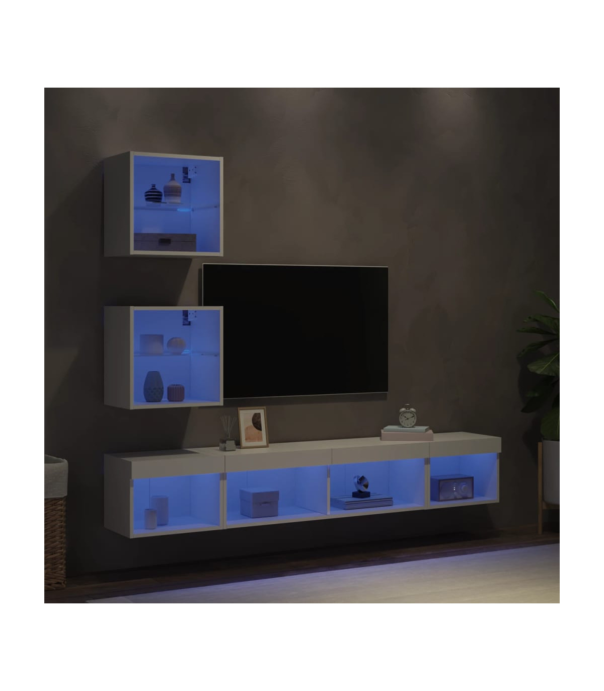 These TV wall units are the perfect solution for your living space to maximise space and keep the floor areas uncluttered. Sturdy material: The engineered wood is of exceptional quality with a smooth surface and also features strength, stability and resistance to moisture.RGB LED lights: The TV unit is equipped with vibrant RGB LED lights. With various customisable menus, you can effortlessly change the colour of the lights and even set them to adjust automatically. These LED lights not only enhance the contemporary look of the floating TV cabinet but also add to its trendy appeal.Wall-mounted design: The television unit can be wall-mounted to add extra storage space. That way, you can maximise your floor space and keep the area clean.Ample storage space: The floating TV unit provides ample space to store your daily essentials such as books, DVDs, magazines, media supplies and other items neatly organised and within easy reach.Versatile design: You can use it as a TV cabinet or mount it on the workplace wall for convenient storage of tools or other miscellaneous items. Also, it transforms an empty wall into a design feature. Good to know:Screws and plugs for inside the wall are not included. We advise to find and use screws and plugs suitable specifically for your walls. If you're not sure, you can consult with a professional. Please read and follow each step of the instructions.The product has a USB connector that requires a certified 5V USB power source (not included).
