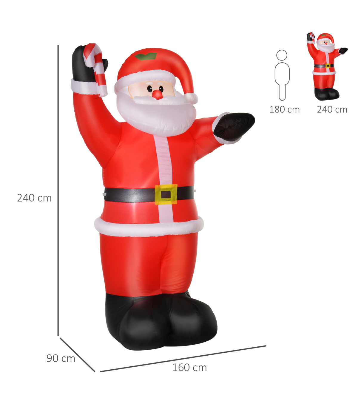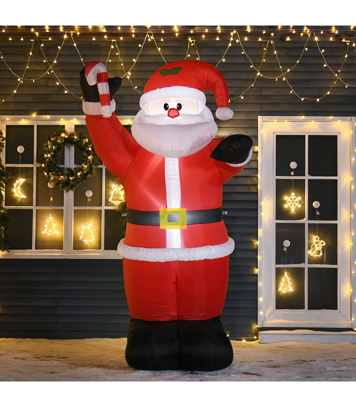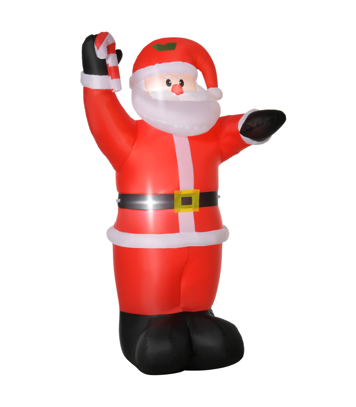 Inflatable Christmas Santa Claus Air Blown Decoration Yard" Description: - Inflatable Santa holding a candy cane - Made with durable and sturdy polyester cloth - Equipped with 2 sets of LED lights for nighttime illumination - Easy to inflate and deflate for storage and display - Water-proof material suitable for any weather conditions - Cloth has passed the EN14362-2 and fire test - Fan certified with ROHS and CE - Transformer certified to BS standards