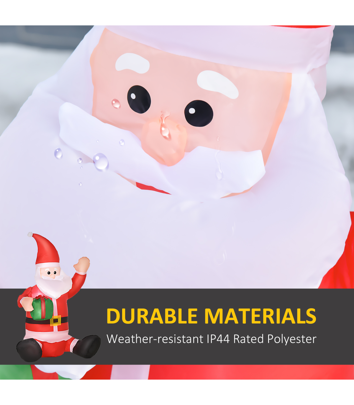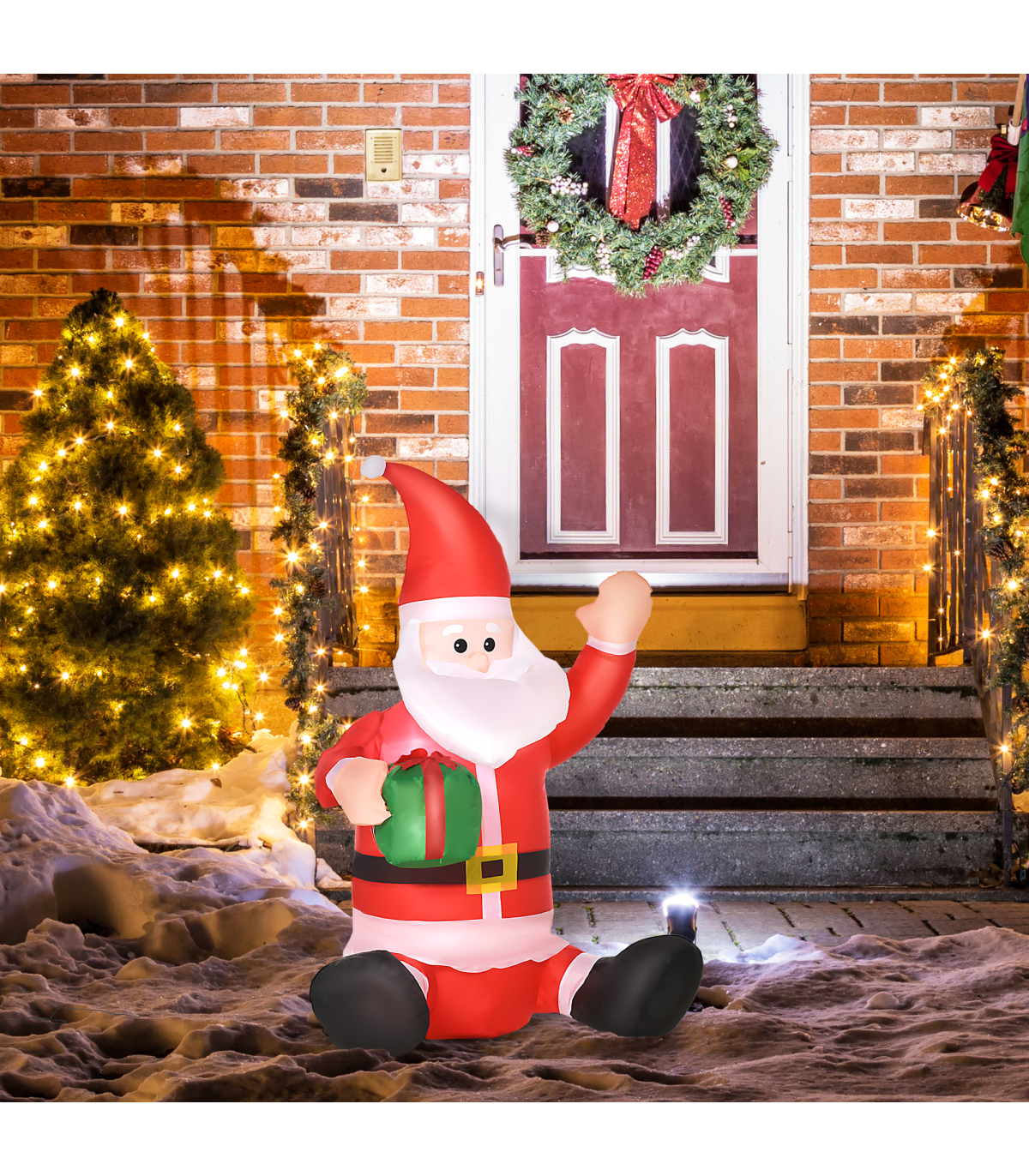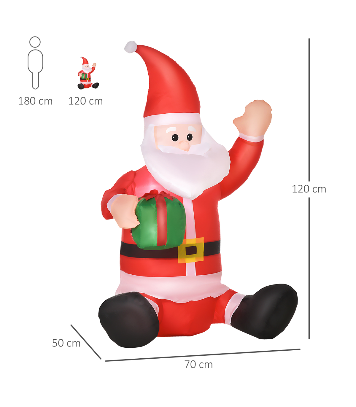 - "4ft Inflatable Christmas Santa Claus Gift with LED Xmas Holiday Outdoor" - Description: - Fun and cheerful sitting Santa holding a present design that moves around with the internal fan - Made from weather-resistant and durable polyester for safe use indoors and outdoors (IP44 rated) - Internal LED lights that illuminate from the inside for a fun feel after dark - Mains powered to inflate and a zip fastening to deflate quickly and easily - Can be used indoors and outdoors - Two tether ropes and two ground stakes included to keep attached to the ground