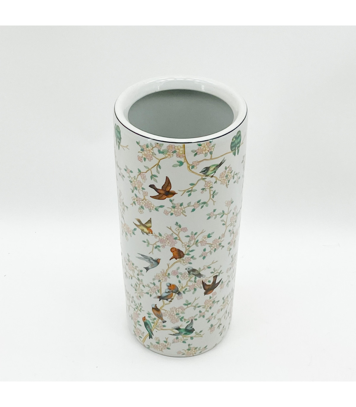 18" ROUND BIRDS & FLORAL UMBRELLA STAND This traditional style umbrella stand can also be used as a large vase for fresh or dried flowers or even ornamental twigs & branches. Slight imperfections to give antique feel Glazed