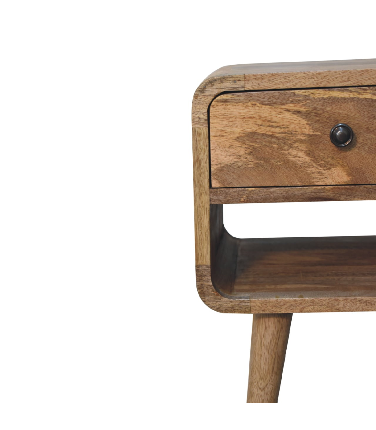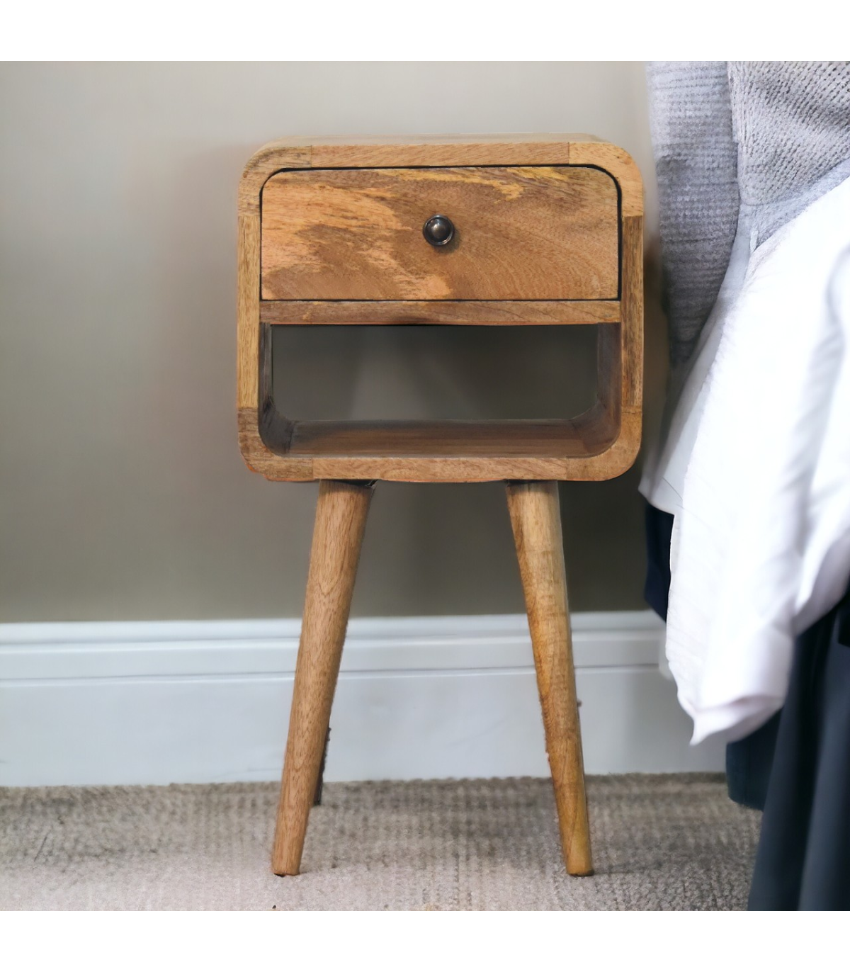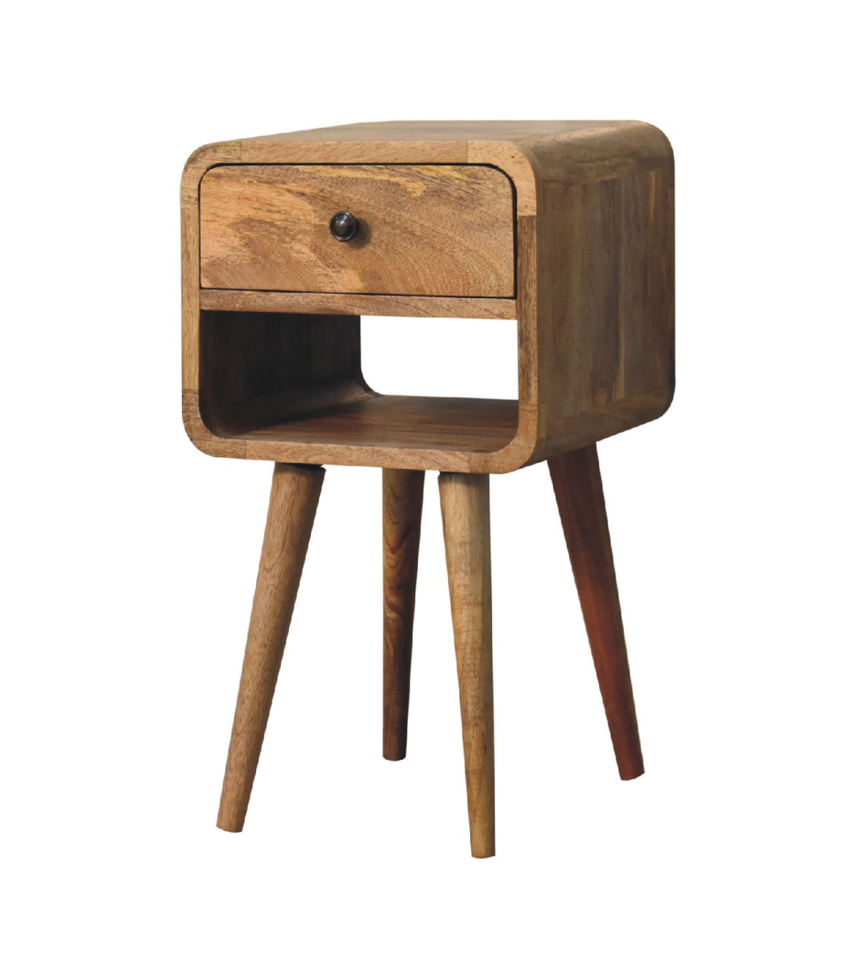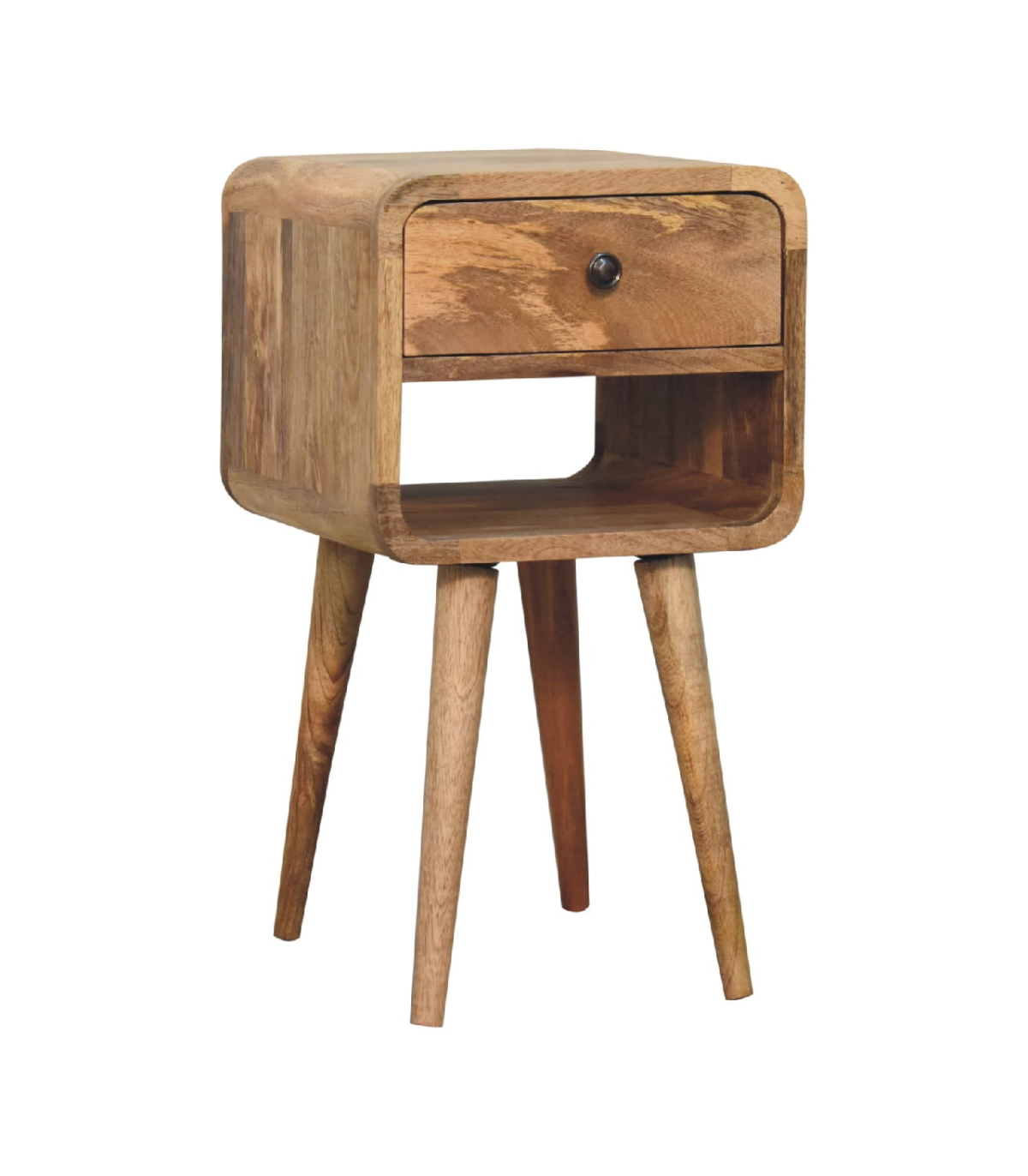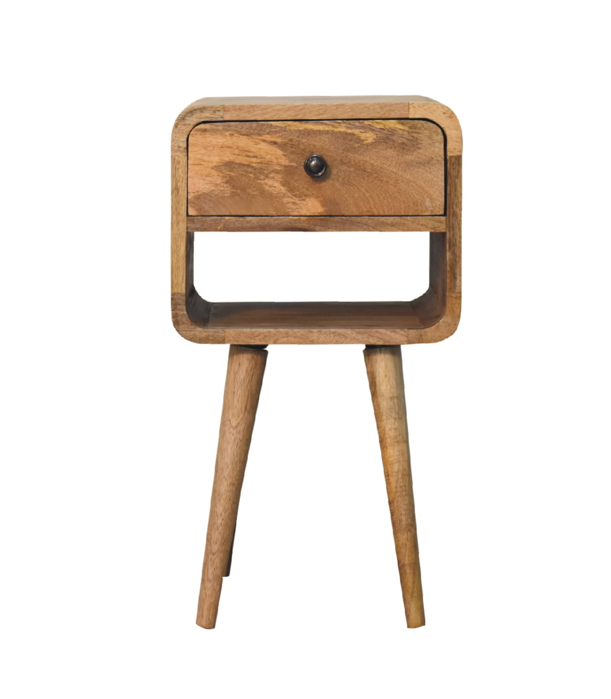 The mini version of our famous IN711, this small but handy bedside makes a perfect stand for nibbles, drinks, or a lamp. It will prove handy all over your home and is made from 100% solid mango wood in a fine oak-ish finish. It has curved edges which will fit into any home/living space. It also comes with 1 drawer, 1 lower open slot and 4 Nordic style legs. This petite product is part of Recession Collection.