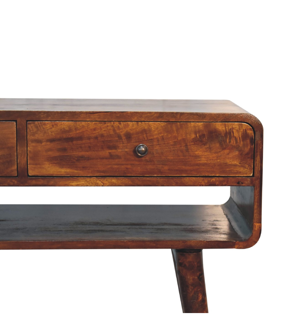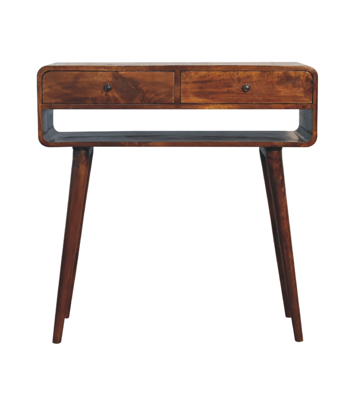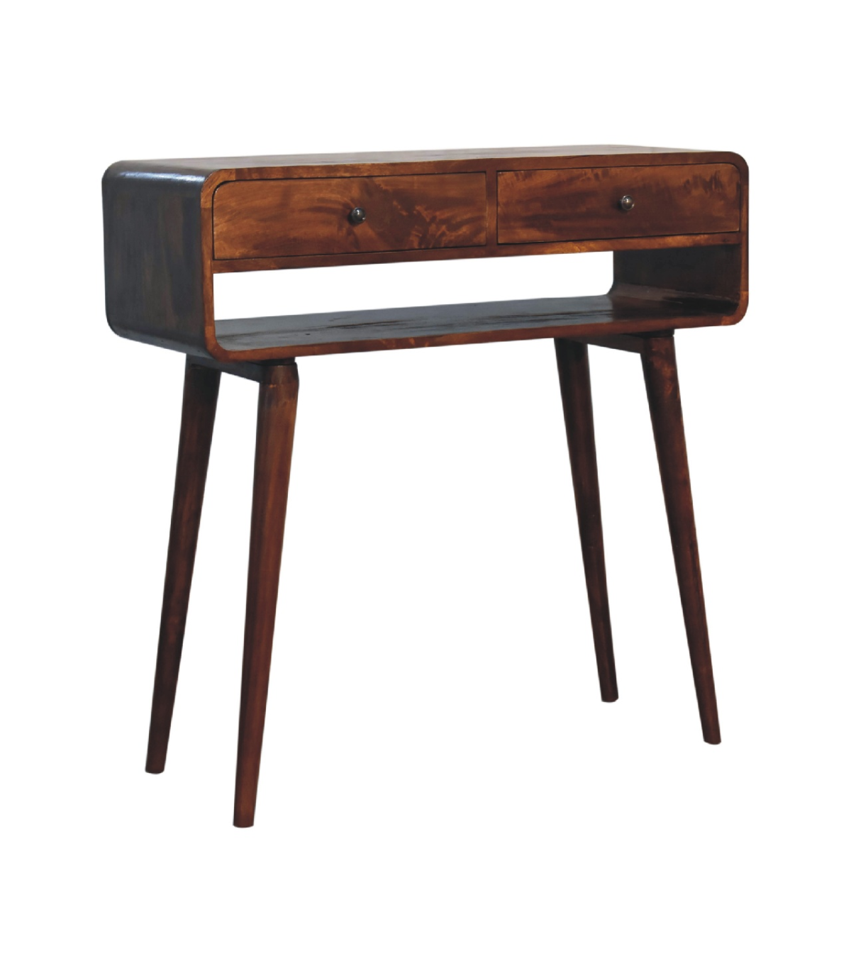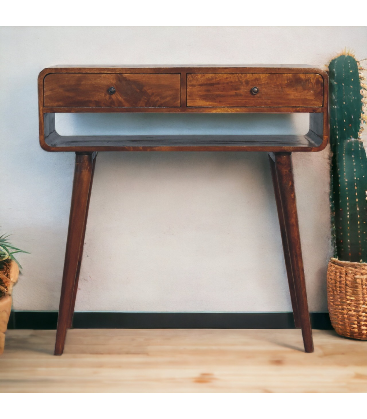 This simple, elegant console table has beautifully curved edges to fit perfectly in any living space, this 100% solid mango wood unit has been built with sustainably sourced timbers and has two drawers and 1 open slot to help you keep your home organized and storing any little household objects. It has shiny knobs and has a fine chestnut finish with 4 Nordic style legs.