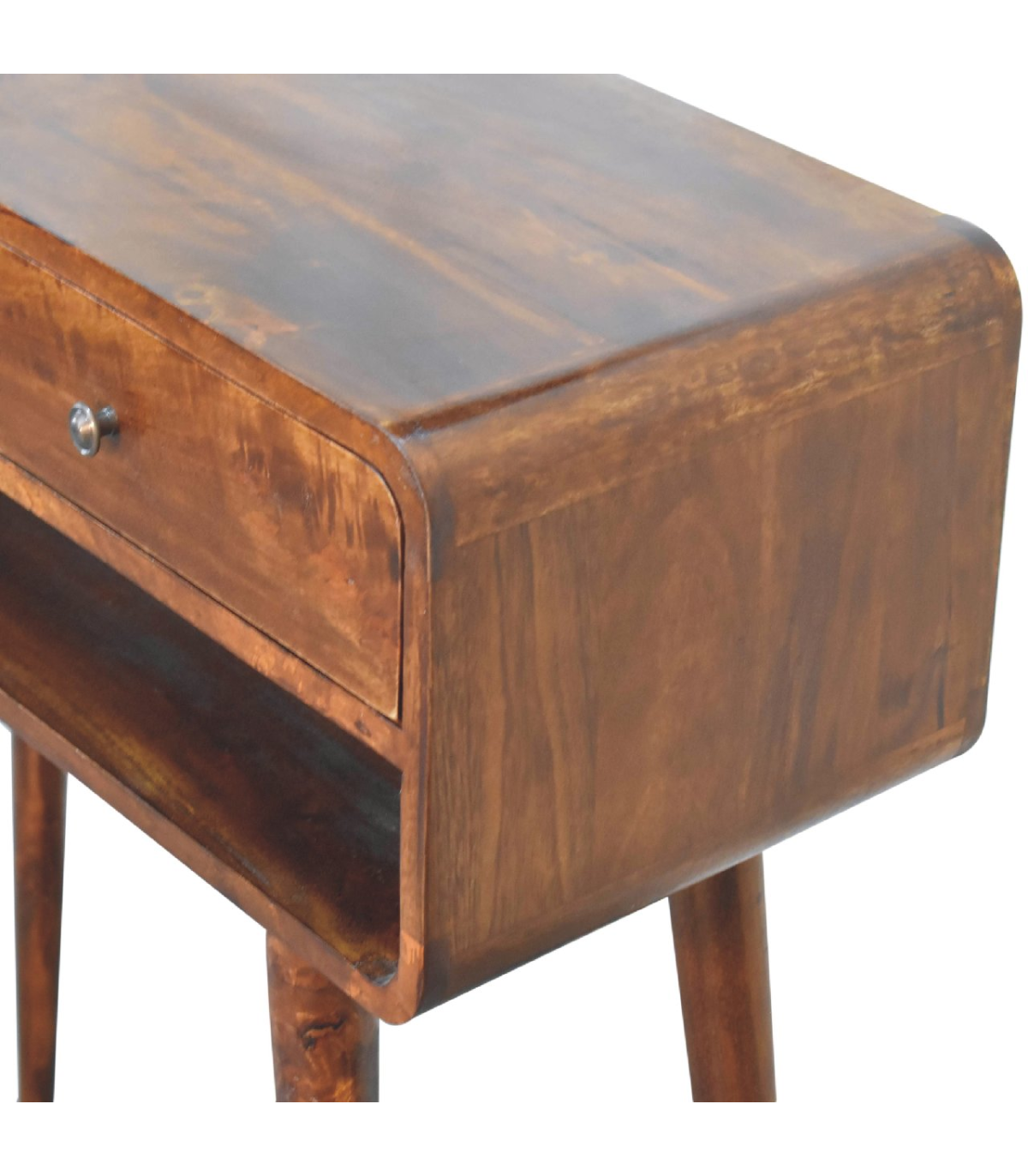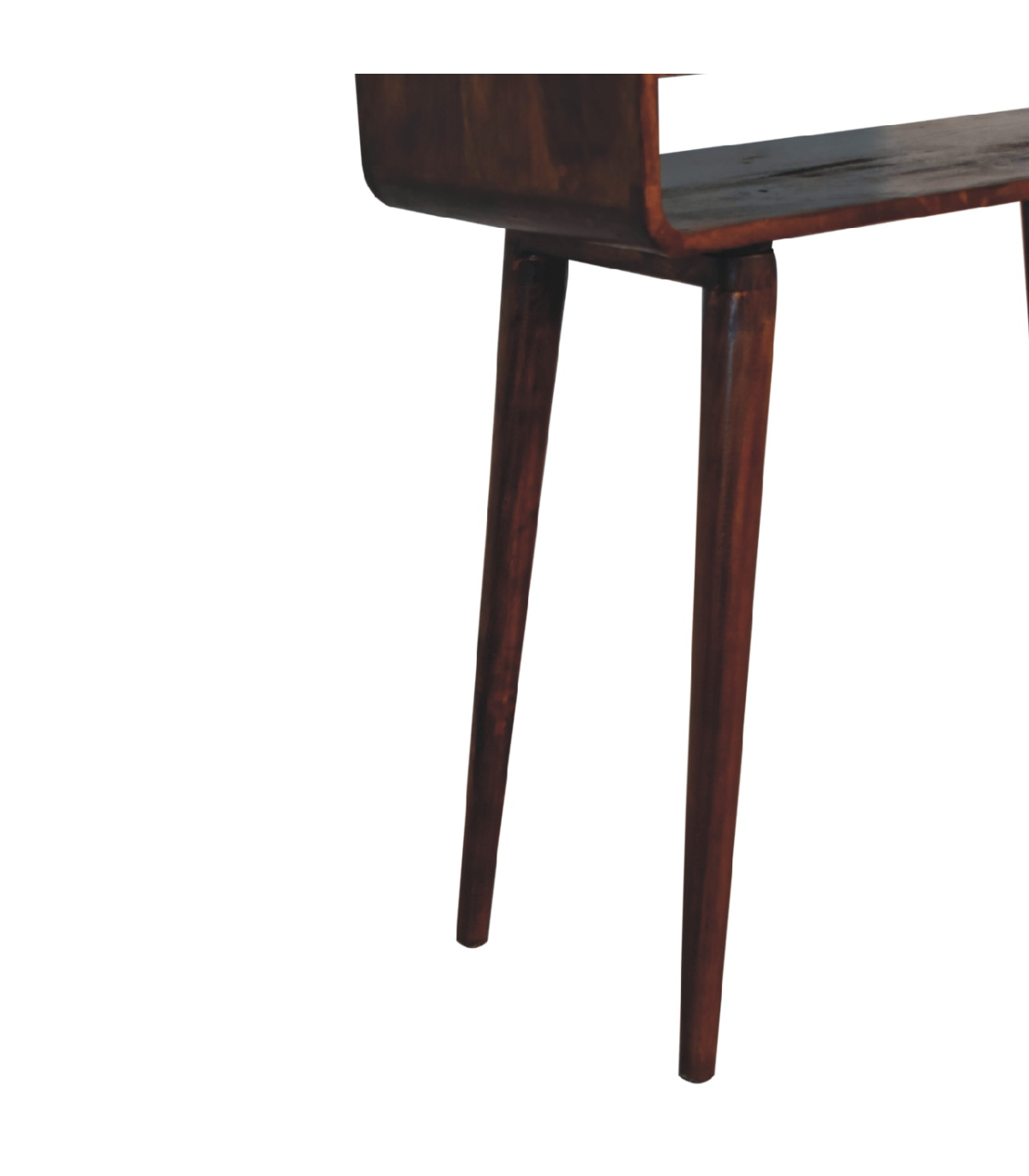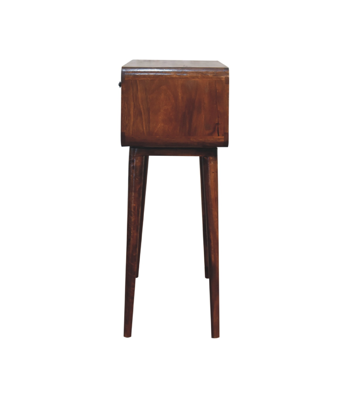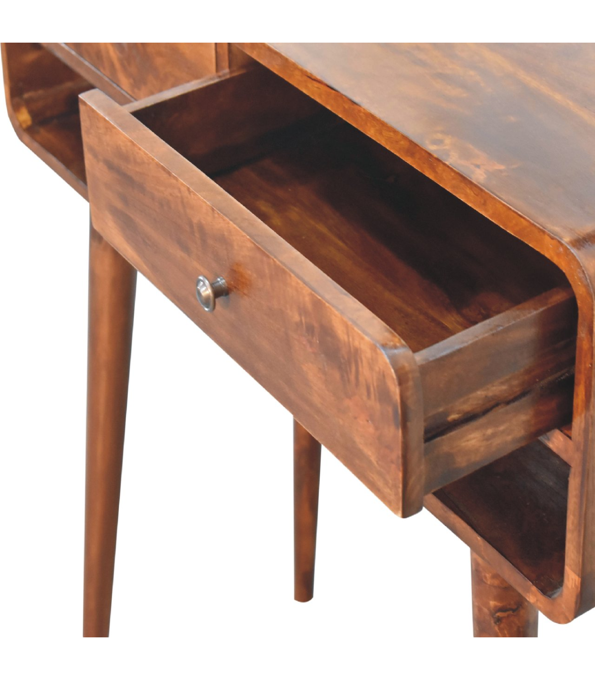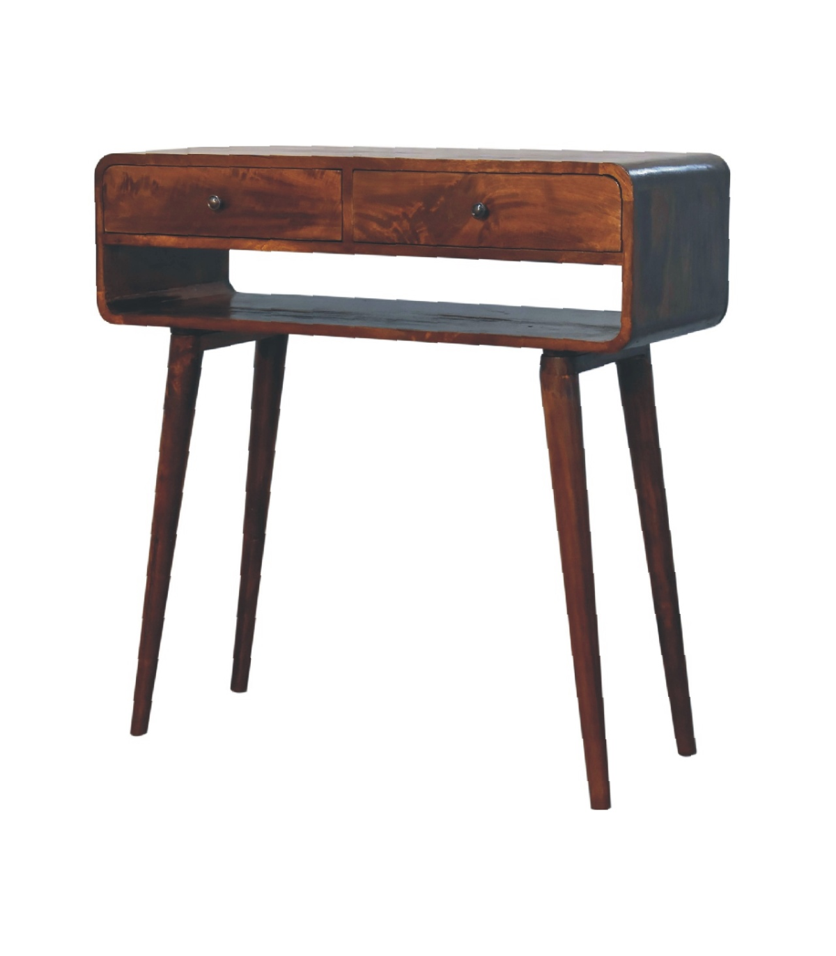 This simple, elegant console table has beautifully curved edges to fit perfectly in any living space, this 100% solid mango wood unit has been built with sustainably sourced timbers and has two drawers and 1 open slot to help you keep your home organized and storing any little household objects. It has shiny knobs and has a fine chestnut finish with 4 Nordic style legs.