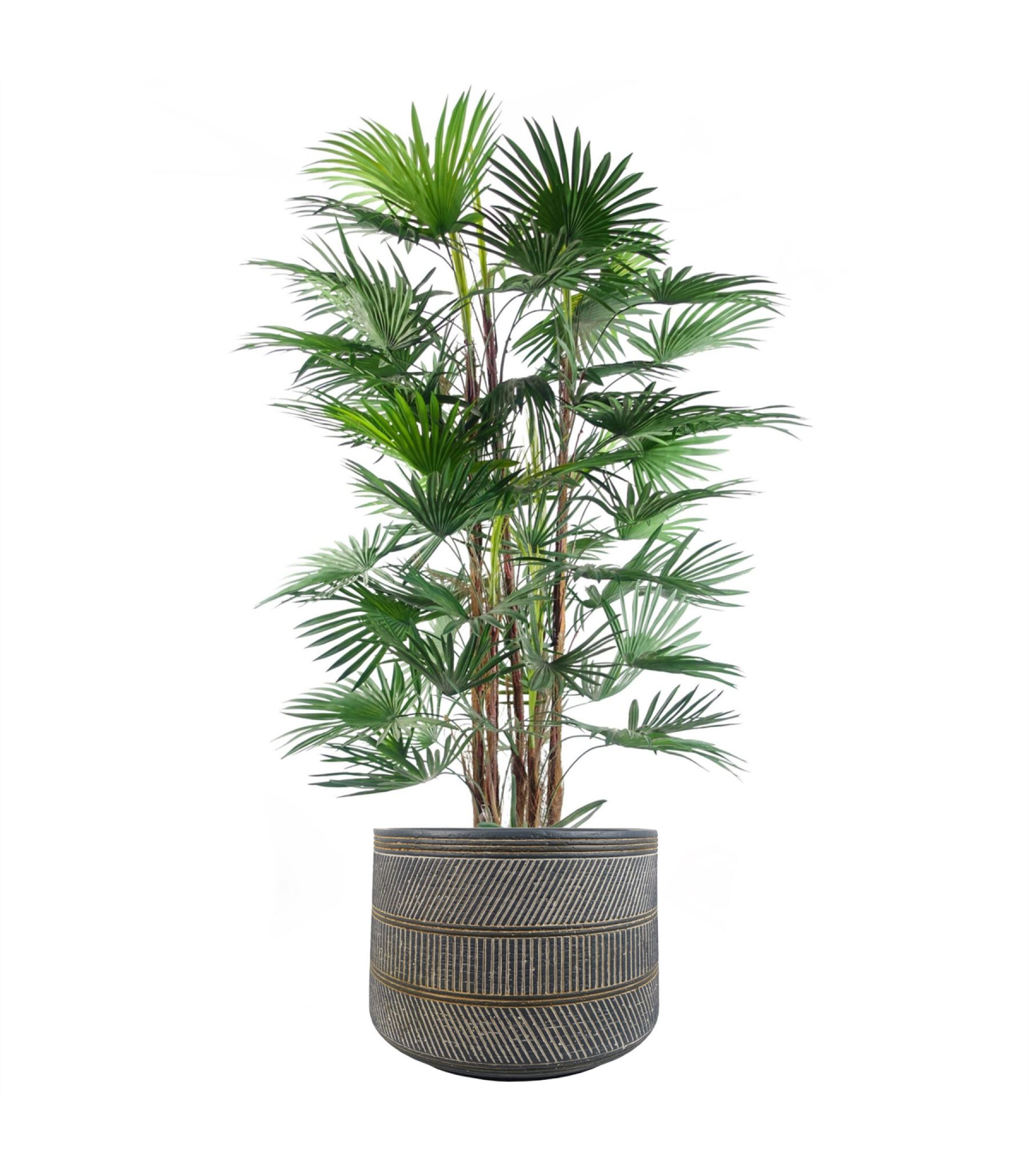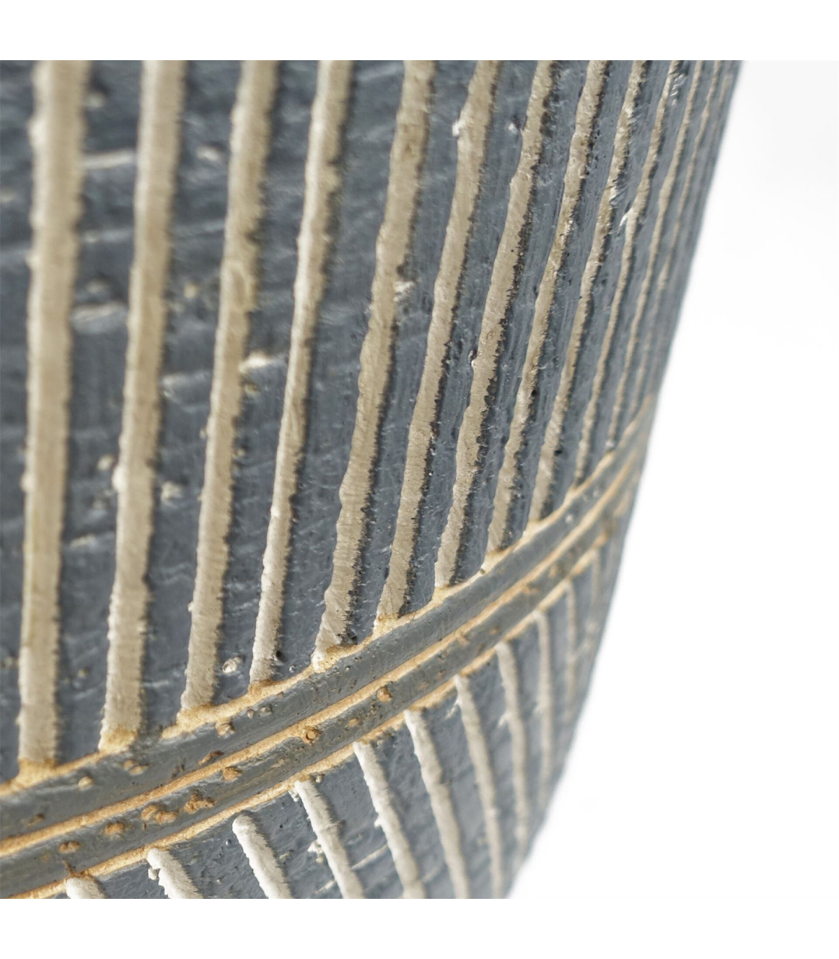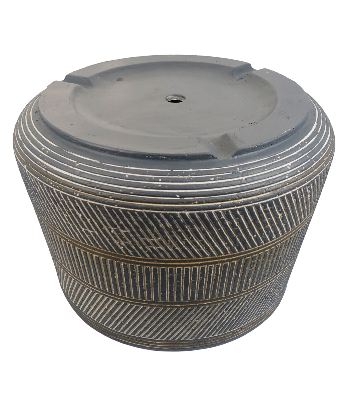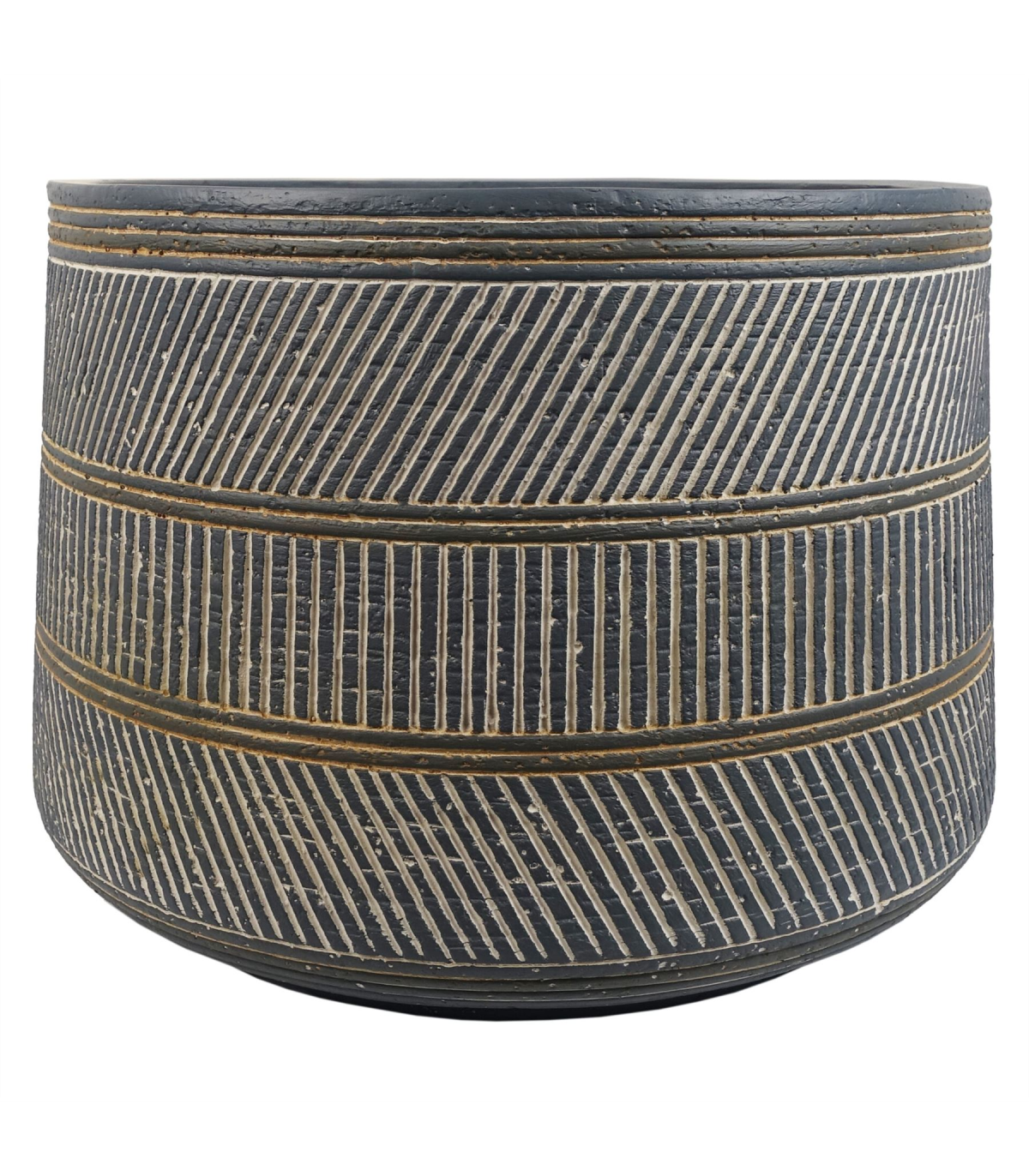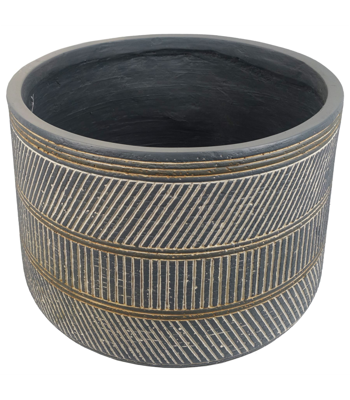 Large fibreglass composite planters, hand finished in a rustic style. Large planter ideal for either artificial plants or real ones. Designed for indoor use but can be used outdoors in a sheltered position, we recommend protecting from extremes of weather. Overall size: 29 x 43cm. The inner hole diameter is 40cm, any of our plants with starter pots smaller than this and all our bare stem plants will fit perfectly inside this planter. Has a drainage hole on the base. Colour is a muted blue and grey. Intentional Rustic finish.