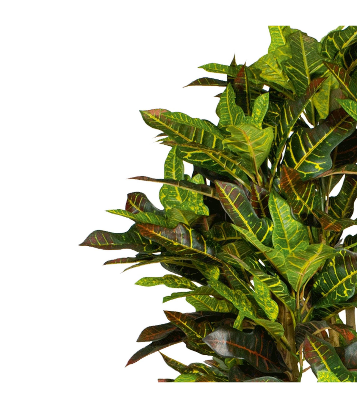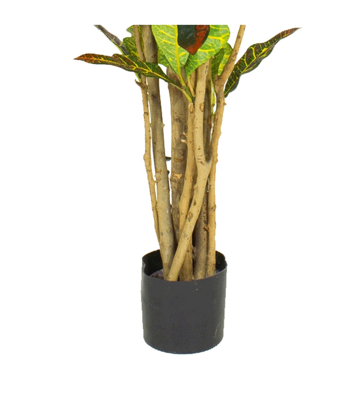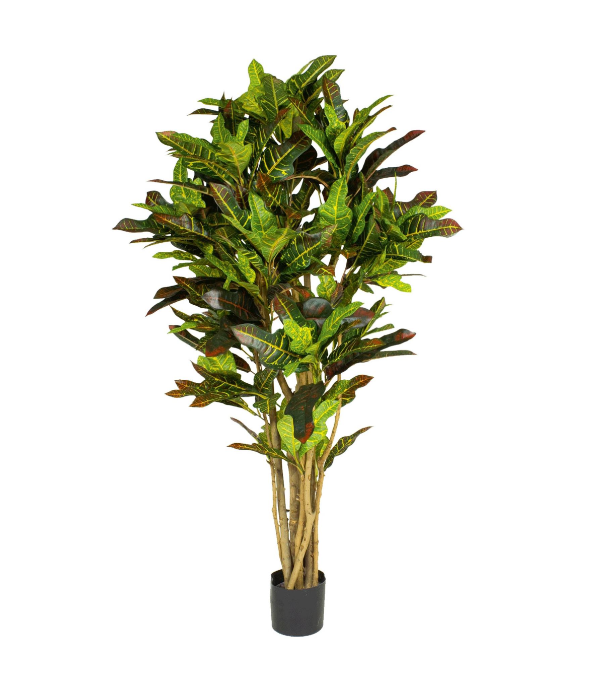 This 150cm Croton Realistic Artificial Tree is a striking décor piece that replicates the bold beauty of the tropical croton plant. Known for their broad, glossy leaves and vivid multicoloured foliage in shades of green, yellow, orange, and red, croton trees are native to Southeast Asia and the Pacific Islands and are cherished for their ornamental appeal. This lifelike artificial version captures the rich colouration and dynamic leaf shapes of a real croton, offering tropical elegance without the need for watering or special care. It comes potted in a plain black plastic pot, ready to be displayed or easily placed inside a decorative planter of your choice (decorative planter not included). With wired stems that can be adjusted for a fuller, more natural shape, this faux croton tree makes a bold, low-maintenance statement in any room, from homes to offices and commercial spaces.