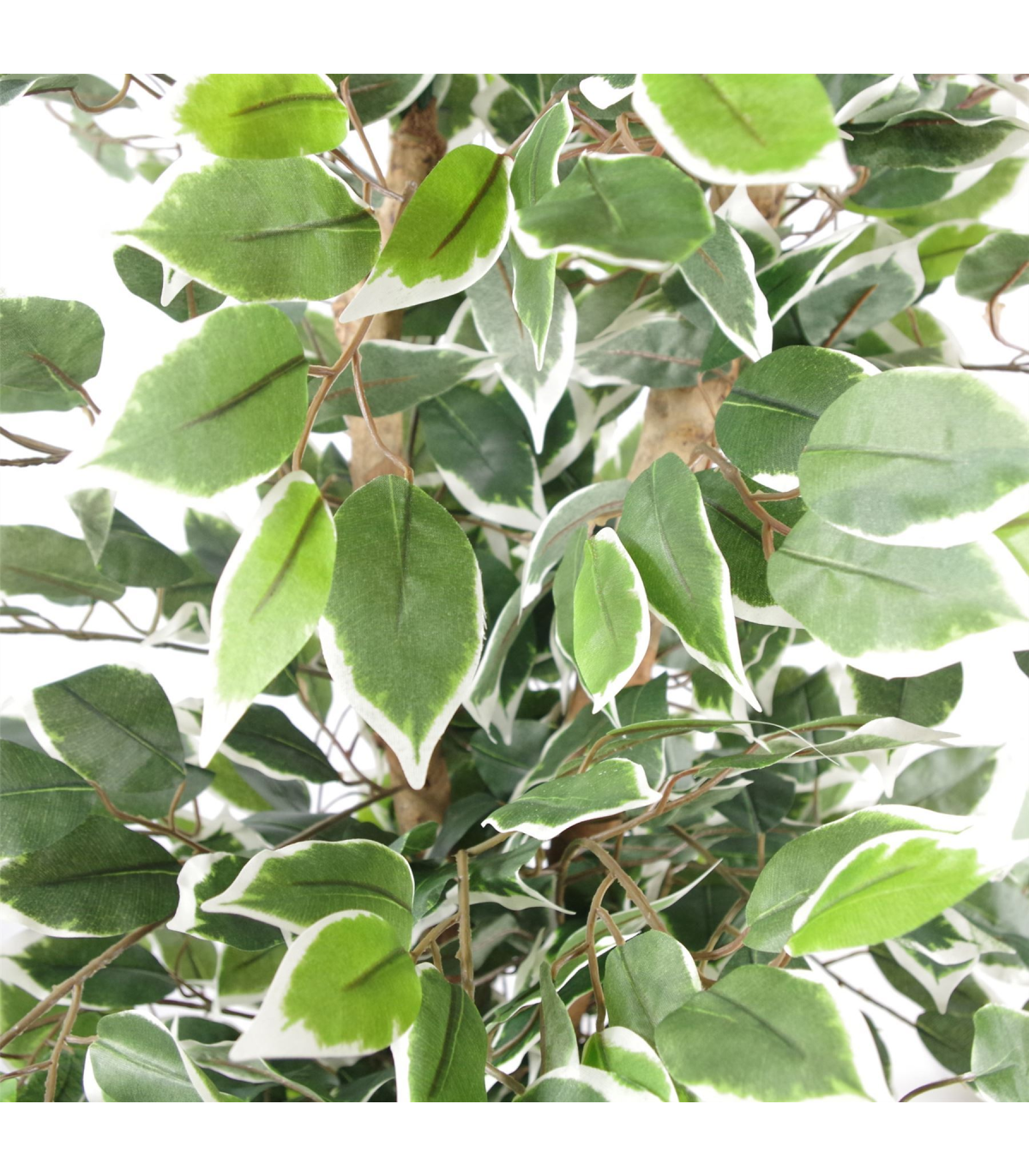 Artificial Ficus trees are extremely popular choices for indoor arrangements. Our ficus trees have extremely realistic shapes and multiple leaf colours. Together with a natural trunk and multiple wired stems This artificial tree is suitable for both residential and commercial applications. This artificial tree stands 130cm (4ft+) high. Silk leaves are variegated (green with white edges). It is highly realistic with botanically accurate foliage. Stems are wired and can be shaped to your requirements. You can easily put this inside a larger planter if you wish. Comes with separate metal planter for display, items can be used together or separately.