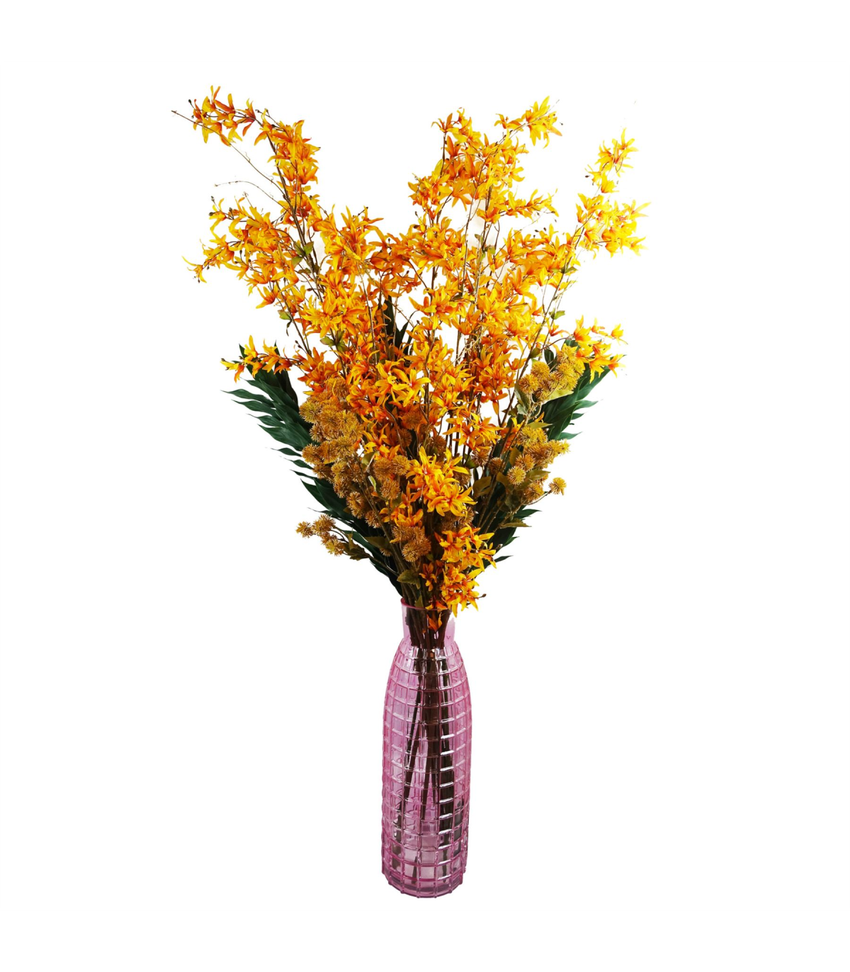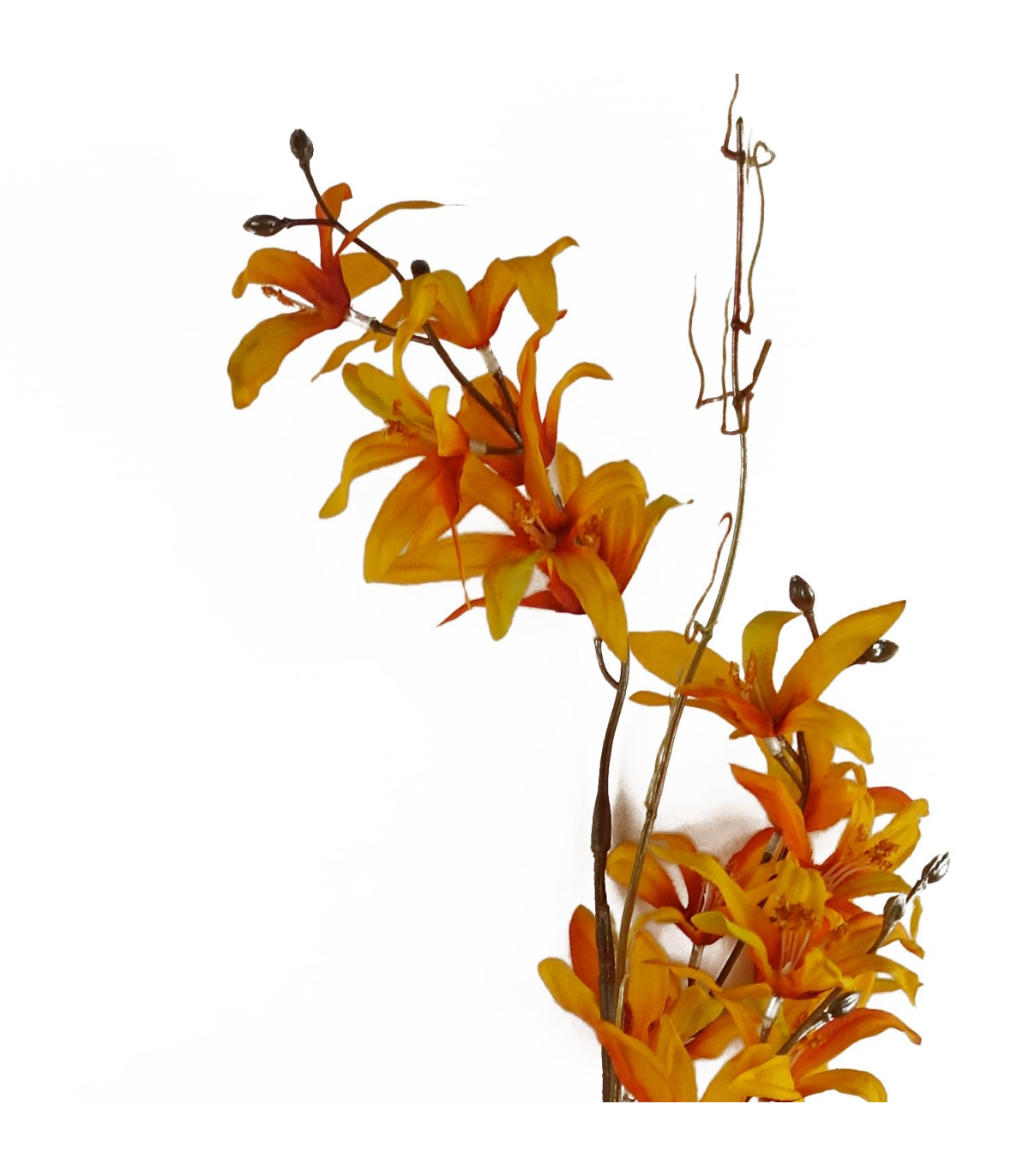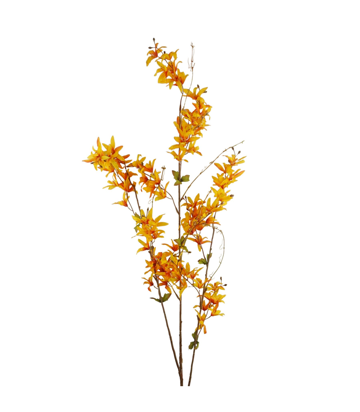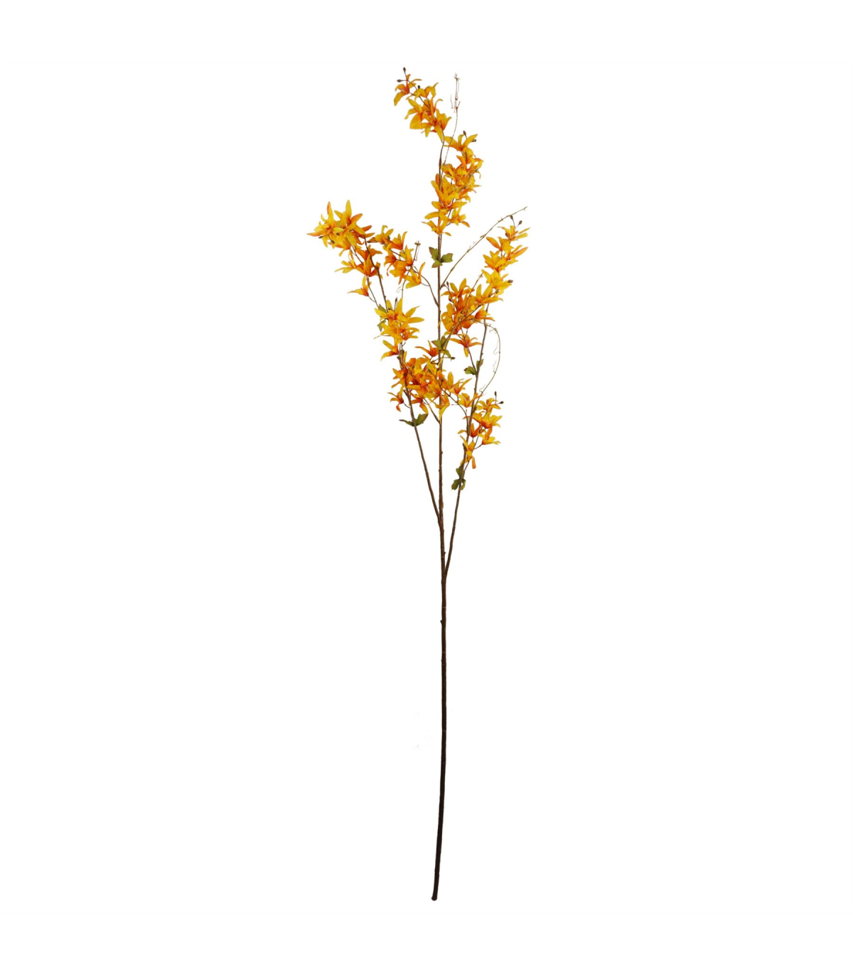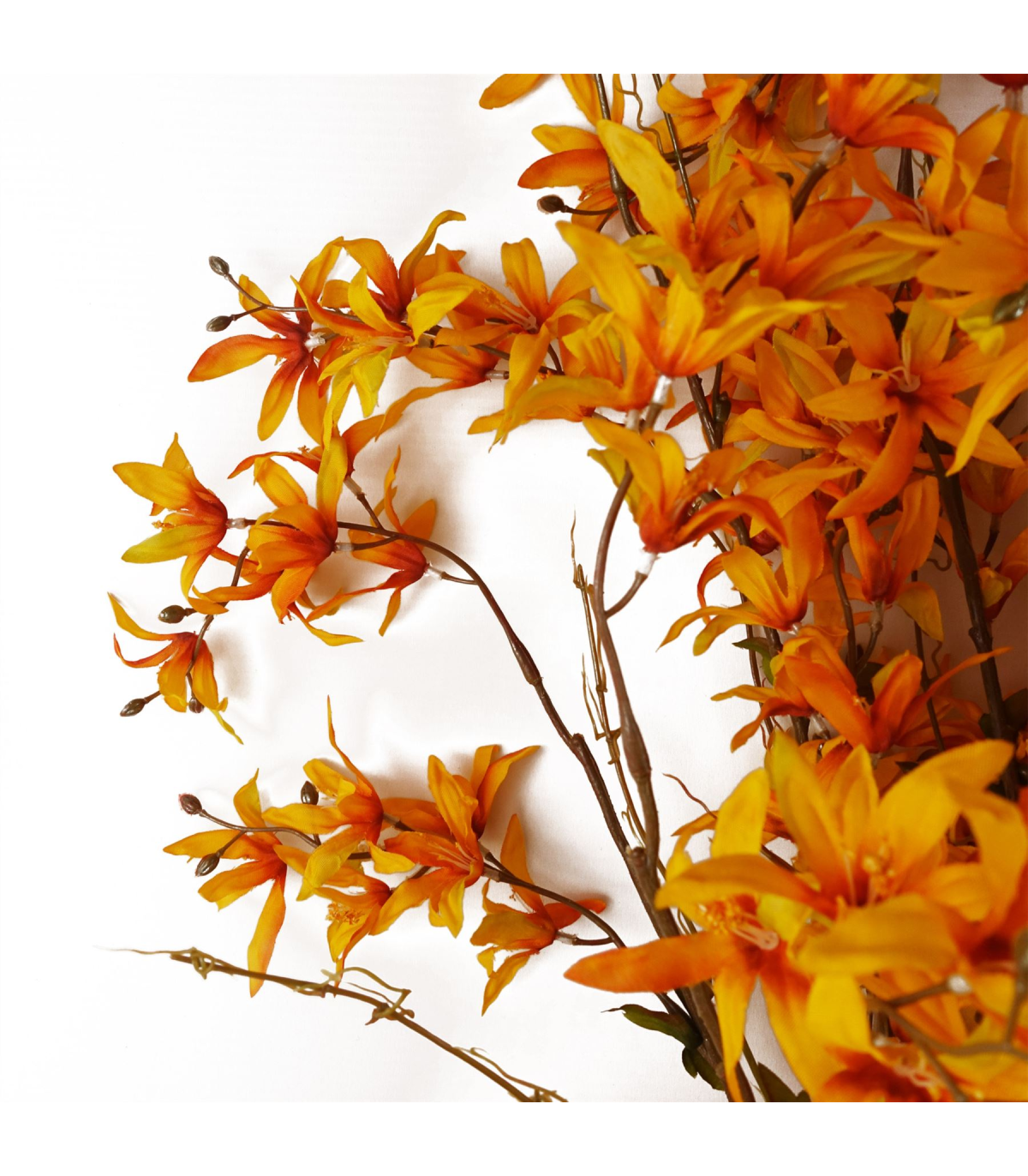 Realistic yellow blossom flower stem. This meticulously crafted piece features lifelike silk leaves and flowers that mimic the natural beauty of blossom and the flowers have a realistic two-tone orange and yellow hue. The wired stems allow for easy shaping and positioning, making it simple to customize the spray to fit your desired aesthetic. Perfect for combining with other artificial stems, this versatile floral spray is ready to enhance your home decor, event arrangements, or seasonal displays, providing a long-lasting and maintenance-free alternative to fresh flowers. Measures 130cm from end to end but can easily be trimmed down to a shorter size with a pair of wire cutters. Silk flowers and leaves. No vase is included with these stems, any pictures shown with vases are for illustration of display only.