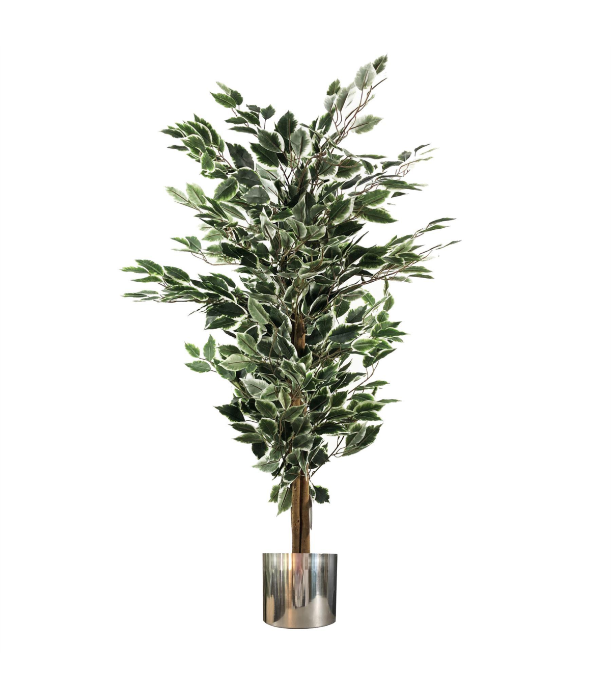Artificial Ficus trees are extremely popular choices for indoor arrangements. Our ficus trees have extremely realistic shapes and multiple leaf colours. Together with a natural trunk and multiple wired stems This artificial tree is suitable for both residential and commercial applications. This artificial tree stands 130cm (4ft+) high. Silk leaves are variegated (green with white edges). It is highly realistic with botanically accurate foliage. Stems are wired and can be shaped to your requirements. You can easily put this inside a larger planter if you wish. Comes with separate metal planter for display, items can be used together or separately.