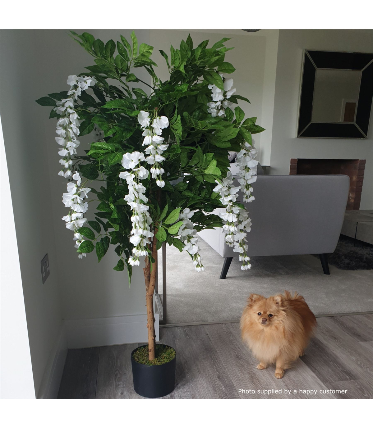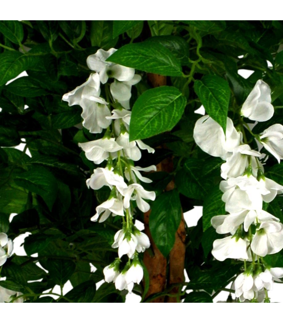 130cm Artificial Wisteria Tree White Flowers - part of our premium range of artificial plants and trees - these ones are virtually indistinguishable from real plants and are some of the nicest products we stock. Plant measures 130cm (h) x 70cm (w) as we have it arranged in our photos. The stems are wired and so this can be adjusted to fit your space perfectly. Real wood trunk- silk flowers and silk leaves. Comes fully potted in a moss covered weighted plastic pot which can either be left as it is or placed inside a decorative planter. The pot measures 18cm (w) x 15cm (h) approx. These plants look particularly impressive if they are put inside a larger planter and covered with bark- gravel or soil to add to the realistic effect. Comes with separate metal planter for display, items can be used together or separately.