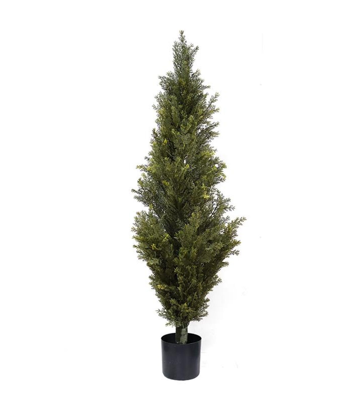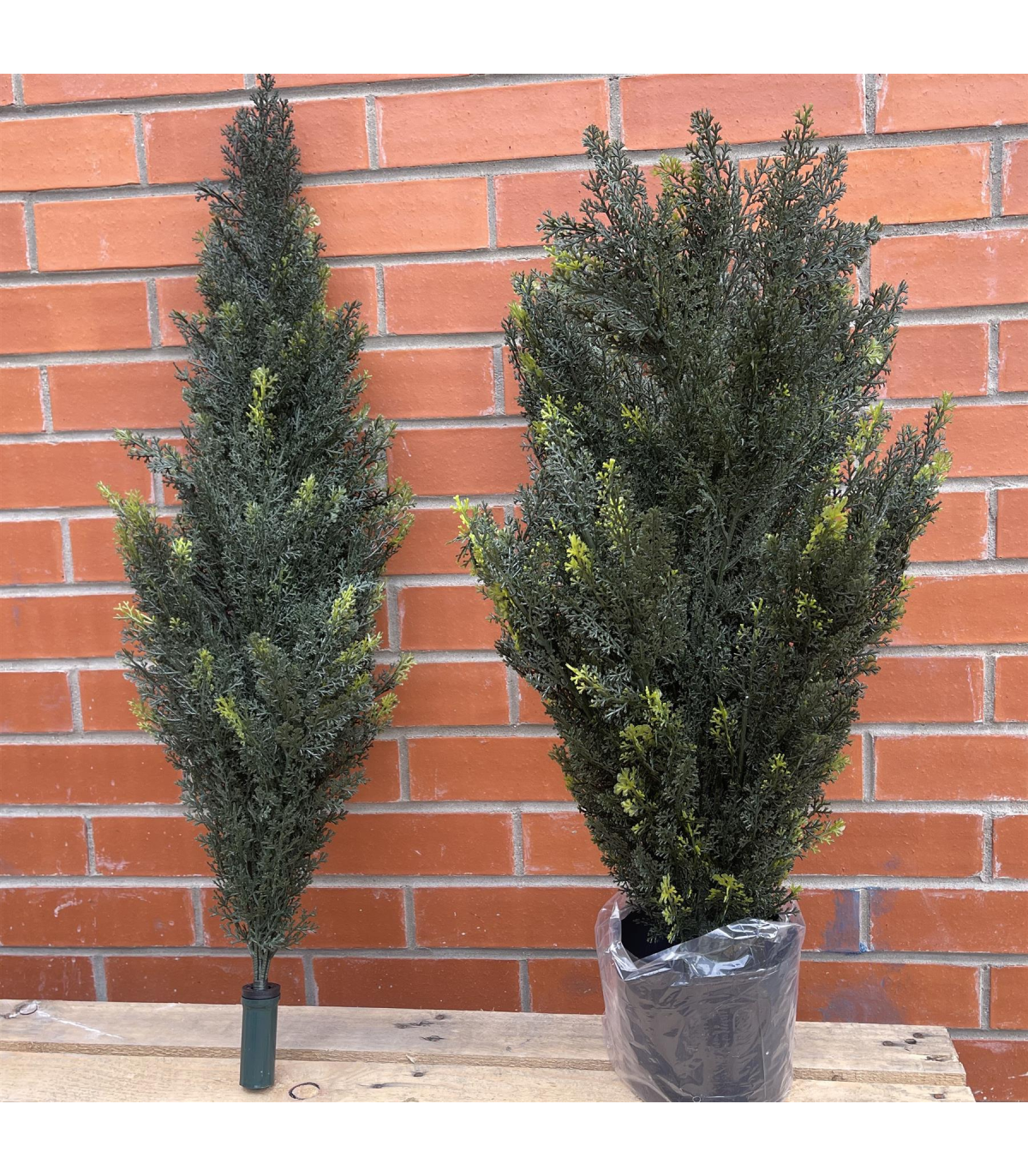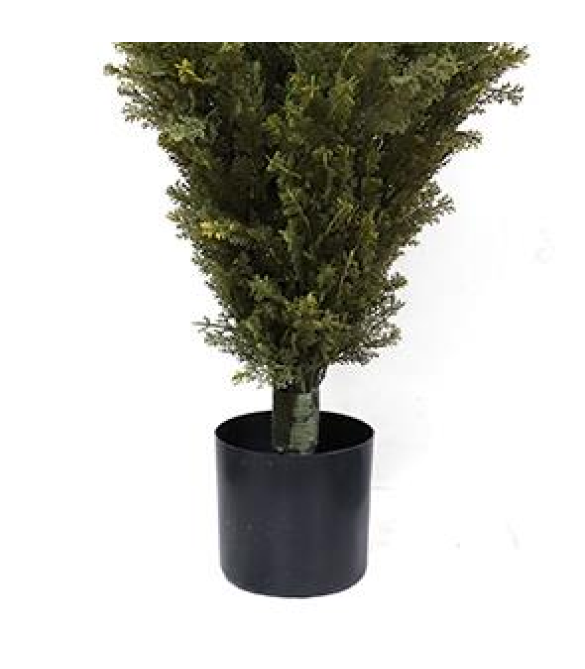 120cm Cypress topiary tree. Crafted to mimic the natural elegance of a real tree, this tall topiary has a full and lifelike appearance. With no need for watering or sunlight, this maintenance-free topiary tree delivers year-round greenery and effortless style. Stems are wired to shape to your requirements. This tree comes in two parts - a top leaf section and a base. The top easily slots into the base to create a sturdy artificial tree.