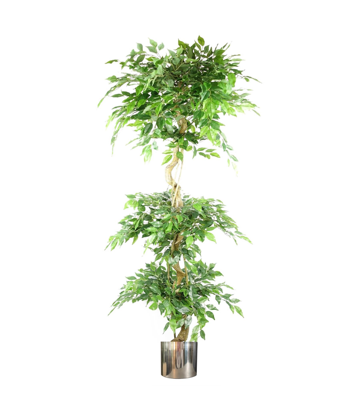 180cm Artificial Twisted Trunk Fruticosa Ficus Tree Triple Ball Topiary 1984 Leaves Silver Metal Planter