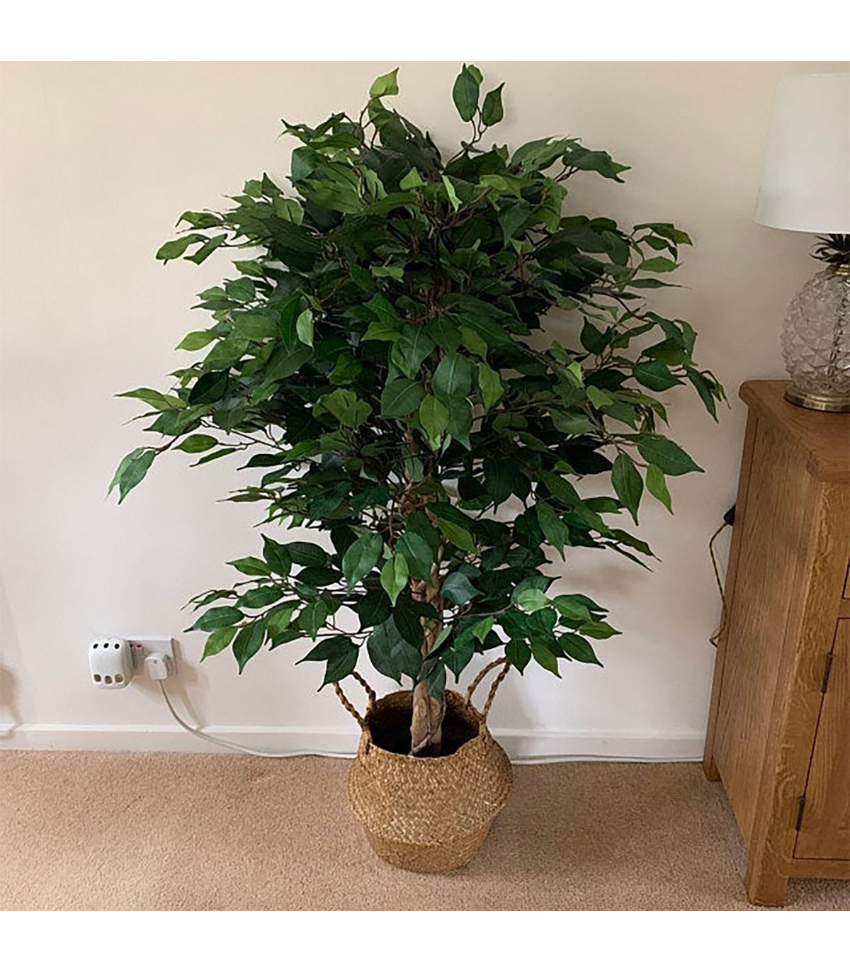 Artificial Ficus trees are extremely popular choices for indoor arrangements. Our ficus trees have extremely realistic shapes and multiple leaf colours. Together with a natural trunk and multiple wired stems This artificial tree is suitable for both residential and commercial applications. This artificial tree stands 120cm (4ft) high. It is highly realistic with botanically accurate foliage. Stems are wired and can be shaped to your requirements. You can easily put this inside a larger planter if you wish. Picture of one of these trees (same design in a slightly smaller 90cm size - this one is larger at 120cm) in a basket kindly supplied by one of our happy customers. Comes with separate metal planter for display, items can be used together or separately.
