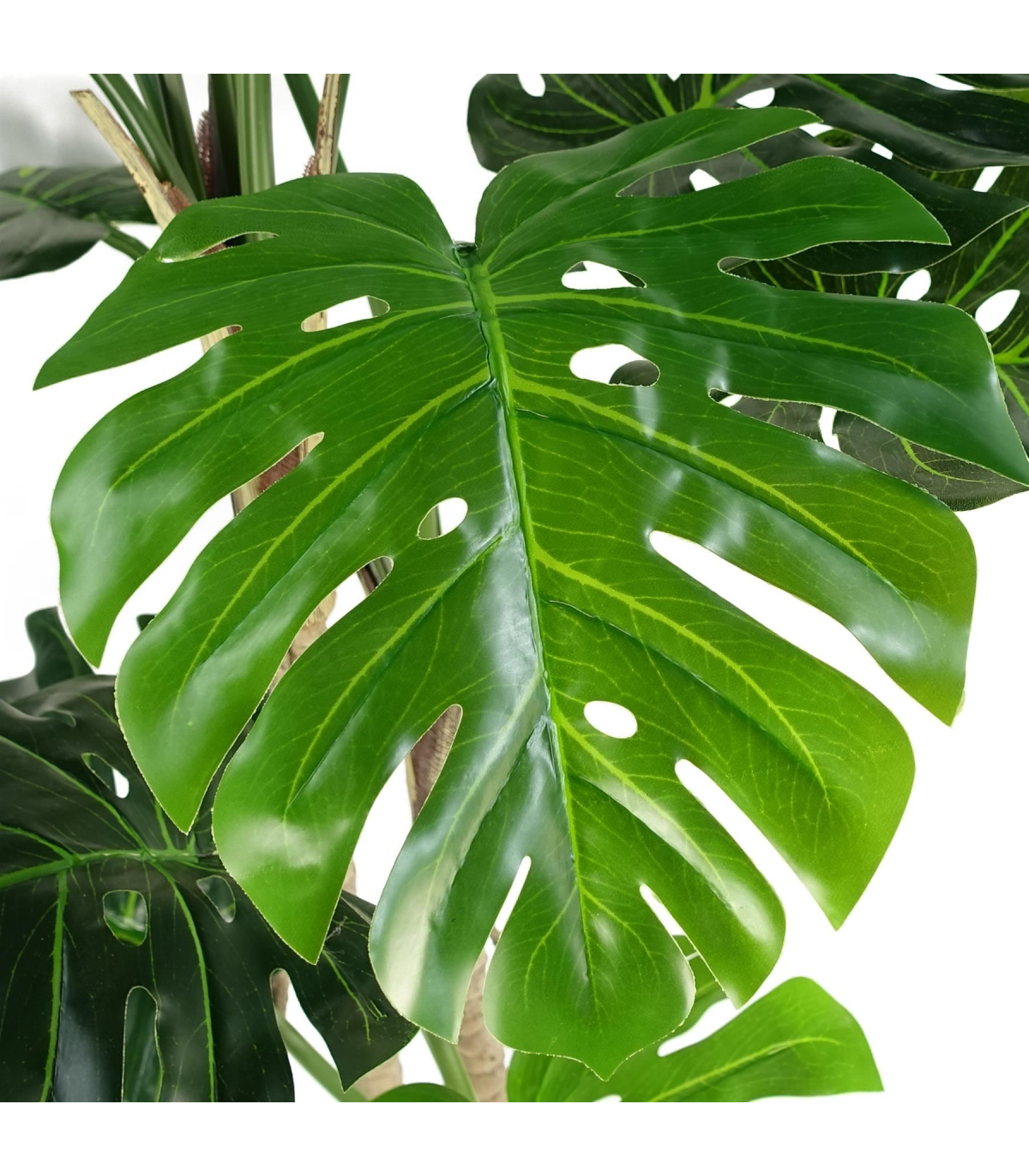 Realistic Monstera plant - 150cm. This particular plant is 150cm x 70cm x 70cm as we have it arranged in our photos. These artificial trees are available in a range of heights. They come potted in plastic black pots (measuring 18cm x 15cm) and are ready to display - just arrange the stems as you wish. It is also very simple to put into a larger planter - just pop inside and cover with gravel or bark. Comes with separate metal planter for display, items can be used together or separately.