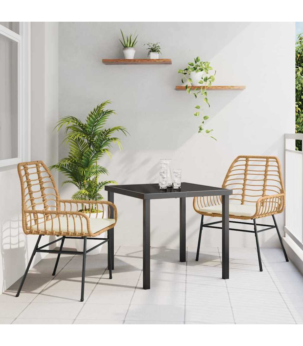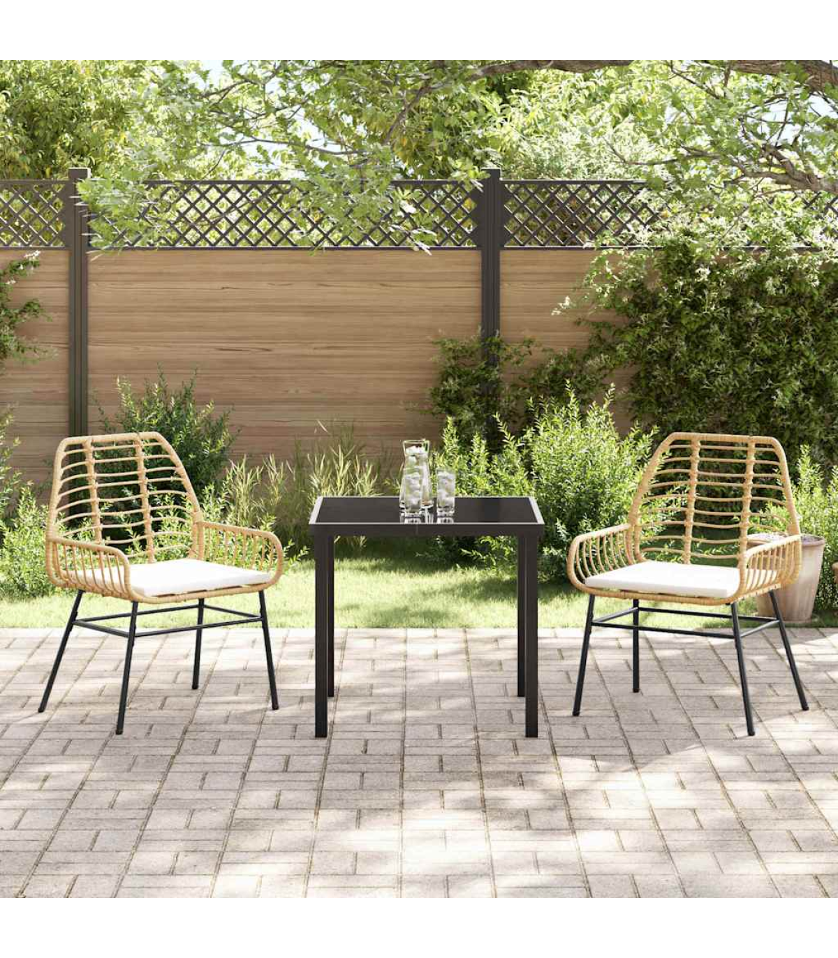 This Modern Garden Dining Set shouts sleek elegance with its tidy lines and minimalist vibe, making it the perfect choice for outdoor dining in the summer. Crafted for those who love style without the fuss, this set meets practical needs while looking fab, blending right in with your garden or terrace. Whether you’re having mates over or enjoying a meal outside, it’s designed to be comfy and easy on the eye. Sturdy Steel Frame: Built to last, this dining set gives you solid support. Steel’s tough and weather-resistant, making it perfect for the outdoors, so it can handle changing temperatures without a hitch. Stylish Glass Top: The glass surface brings a modern touch, shining in the sunlight for a bright dining experience. It’s a breeze to clean too, staying looking smart with hardly any effort, great for daily use or fancy dinners. Comfy Poly Rattan Armrests: Ergonomically shaped for relaxed arms, these poly rattan armrests don’t just look good; they feel good too, providing some extra cushioning while you sit. Summer-Ready Design: Made especially for those sunny days, the materials and build ensure you can chill outside comfortably. It’s perfect for hot weather and fits right in with your summer decorations. Easy Care: To keep it looking lovely for ages, just cover it when you’re not using it. This keeps it safe from the elements, dust, and any potential damage. Maximum 110 kg per seat. Be aware of the risk of open fires and other sources of strong heat in the vicinity of the product.