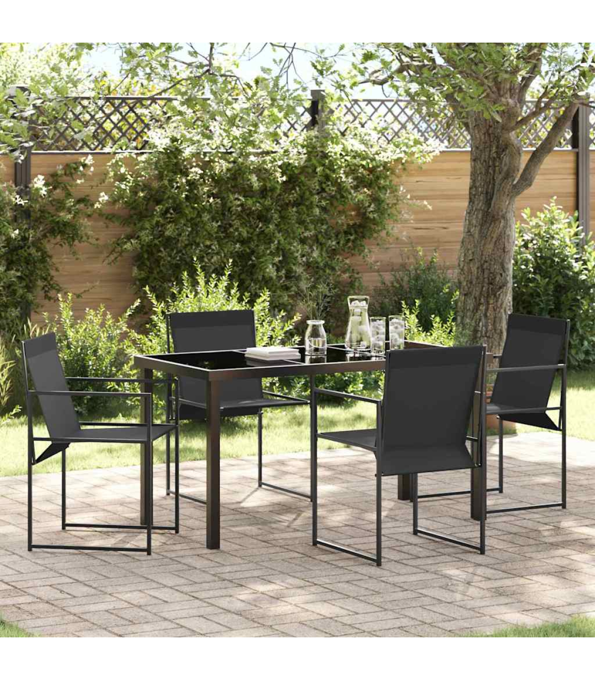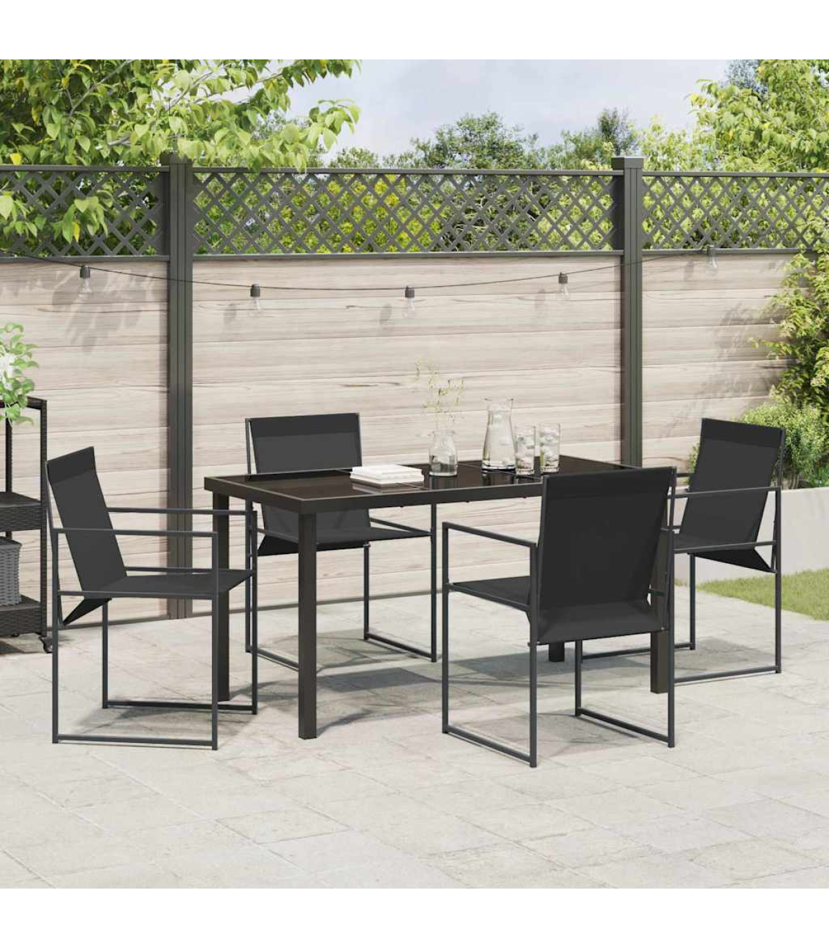 This Modern Garden Dining Set is sure to thrill outdoor lovers with its classy design and practical features. It fits right in with different garden or terrace styles, boasting a wide rectangular table topped with chic tempered glass. It’s the perfect blend of style and function. Set against the bright backdrop of summer gardens, family get-togethers become memorable thanks to this set's good looks and clever design. Materials: This dining set is made with Textilene fabric for the seats and backs, which is UV resistant and super durable for sunny days. The powder-coated steel frames make it last longer and handle the outdoors, looking good while doing it. Included Components: The set has comfy chairs with strong, foldable frames for easy moving and storage. The main table features a tempered glass top, giving you a stylish yet sturdy spot for meals and socialising, creating a seamless outdoor vibe. Features / Function / Design: With a focus on UV resistance, the materials chosen are ideal for outdoor use. Its sleek, clean lines fit right in with a modern aesthetic, making sure the dining set meets your needs and boosts your garden's style. Recommended Uses: Perfect for gardens or terraces, this set fits into outdoor spaces where style and function go hand in hand. It’s fab for laid-back outdoor meals, summer parties, and chilling with your mates. Care & Maintenance: Keep it looking fresh by covering the set when you’re not using it and wiping the surfaces with a soft, dry cloth. Avoid harsh cleaners to keep the powder-coated finish looking good and lasting longer.