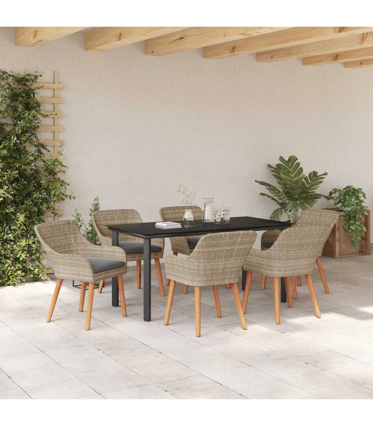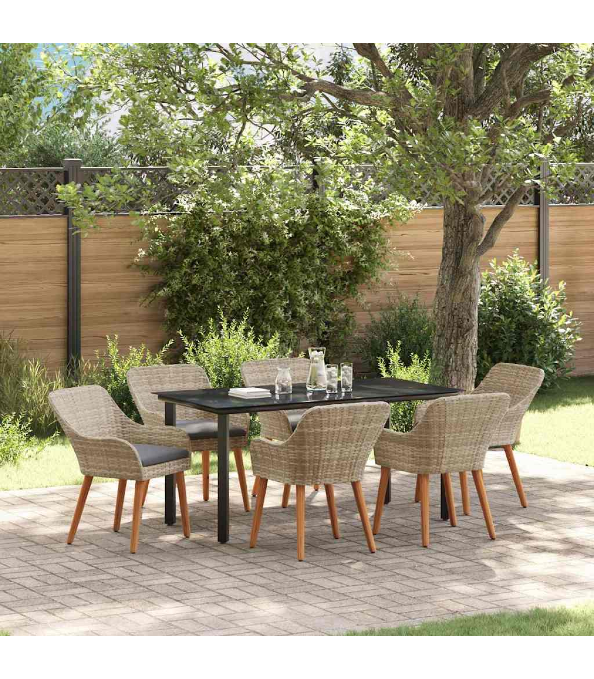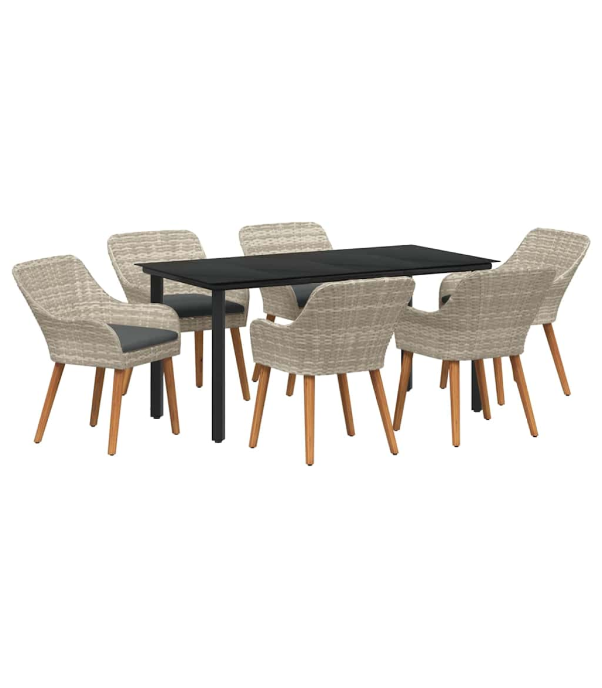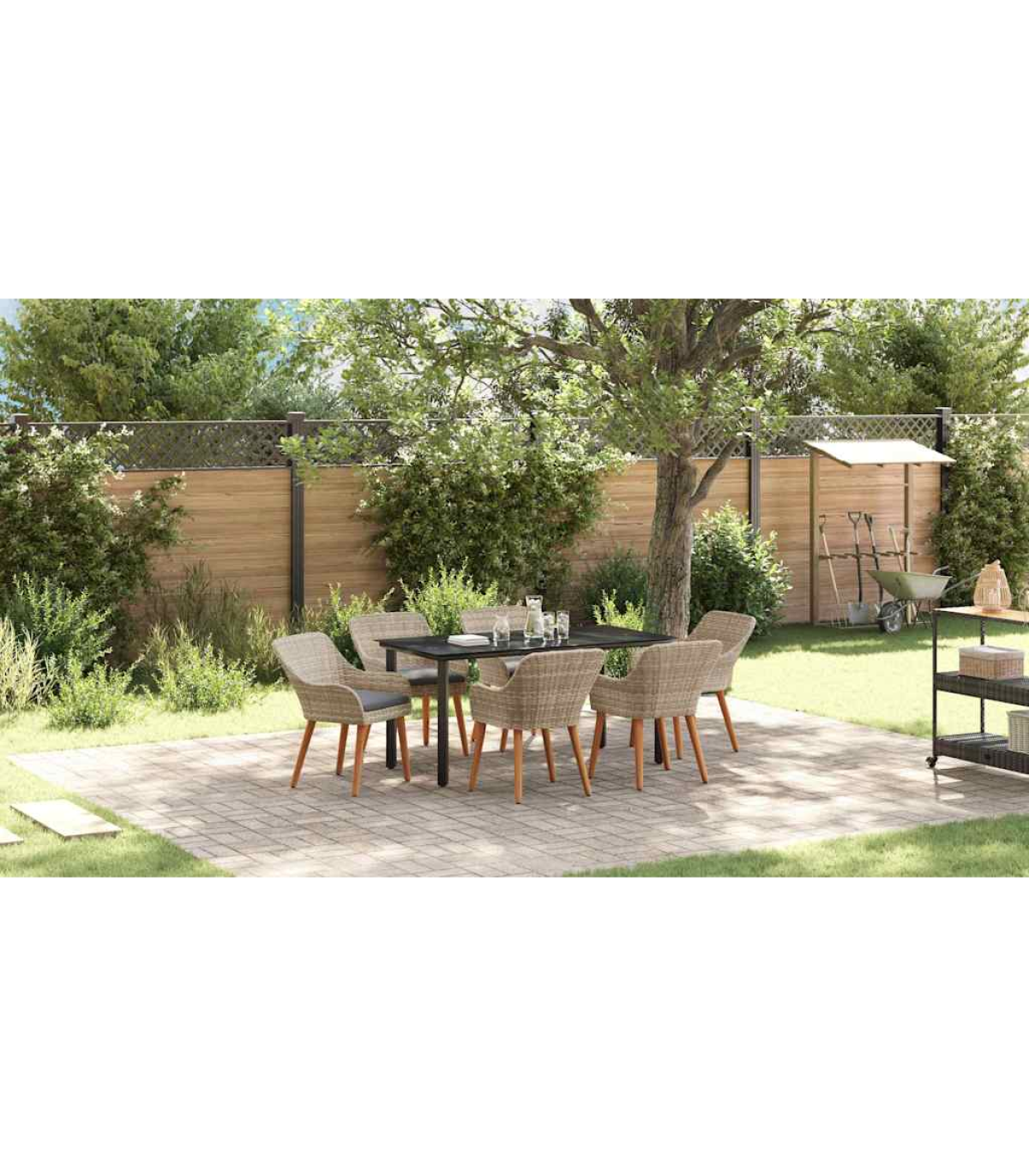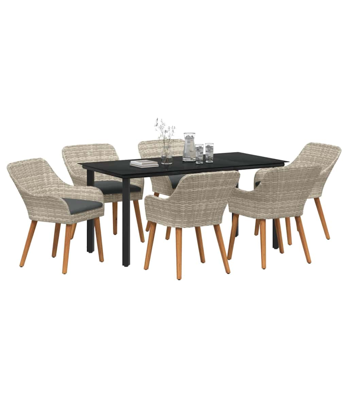 This stylish outdoor dining set is made for folks who love elegance and practicality. It’s spot on for eating alfresco, blending modern style with useful features, making it a top choice for any outdoor area. Its sleek design and comfy seats invite guests to enjoy meals in nature, providing a lovely vibe for get-togethers with friends and family. Materials: Built from high-quality poly rattan, the dining set has a nice texture and finish. The main material is picked for its UV and moisture resistance, giving it lasting power outdoors. The metal frame adds strength and supports the rattan's look and feel, while being easy to keep clean. Included Components: Besides the main dining table and chairs, every piece has smartly designed legs for stability. The seats are comfy and match the table’s size to create a seamless dining experience. Features / Function / Design: As mentioned, the dining set seats several people comfortably, making it great for gatherings and parties. What makes it special is the blend of style and durability, making it an appealing option in modern gardens and outdoor spaces. Recommended Uses: Perfect for patios, gardens, and other outdoor spots, this set fits well in various social settings. Whether it’s a family BBQ or a classy dinner under the stars, it adapts easily to different occasions. Care & Maintenance: To keep it looking fab, cover the dining set when you’re not using it, protecting it from the weather. A quick wipe down to remove dust will keep it looking great and ensure it remains a beloved part of your outdoor decor.