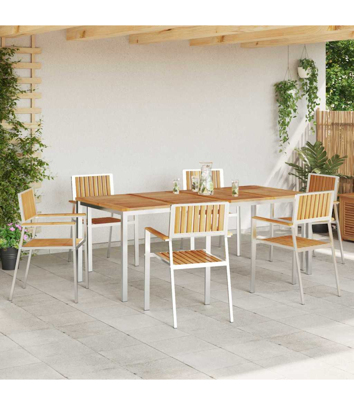 This eye-catching Modern Outdoor Dining Set creates a chic seating area in your garden or terrace, crafted to make your outdoor living more enjoyable. Its sleek design focuses on simplicity and functionality with smooth lines and minimal detail, making it a top choice for modern homeowners who want both practicality and style outdoors. Whether you’re hosting your next alfresco dinner or garden party, this set comfortably suits gatherings in a contemporary way, soaking up the sun and nature around you. Materials: Built with top-quality stainless steel, this dining set is super tough and resistant to wear and tear, standing strong against outdoor elements. Its shiny finish gives off a stylish, modern vibe that fits right into any garden, looking good season after season. Included Components: The set boasts strong stainless steel arms and legs, delivering a solid base alongside its robust frame. The practical design makes it comfy for multiple guests, with armrests that enhance the outdoor dining experience. Features / Function / Design: This dining set showcases high-quality construction, meant to last under heavy use and outdoor conditions. Crafted with care, it not only ensures durability but also invites outdoor fun regardless of the weather. Recommended Uses: Tailored solely for outdoor use, it's perfect for gardens and terraces, welcoming brunches or festive dinners in a modern setting. Whether you're sharing a meal with family or entertaining friends, it adapts easily to all sorts of occasions. Care & Maintenance: To keep it looking and functioning at its best, you might want to use a cover when it's not in use. Just a quick wipe down with a gentle cloth will clear away any marks or spills, ensuring it stays the star of your gatherings for years to come.