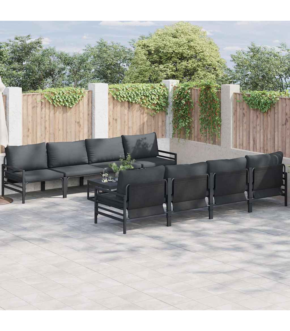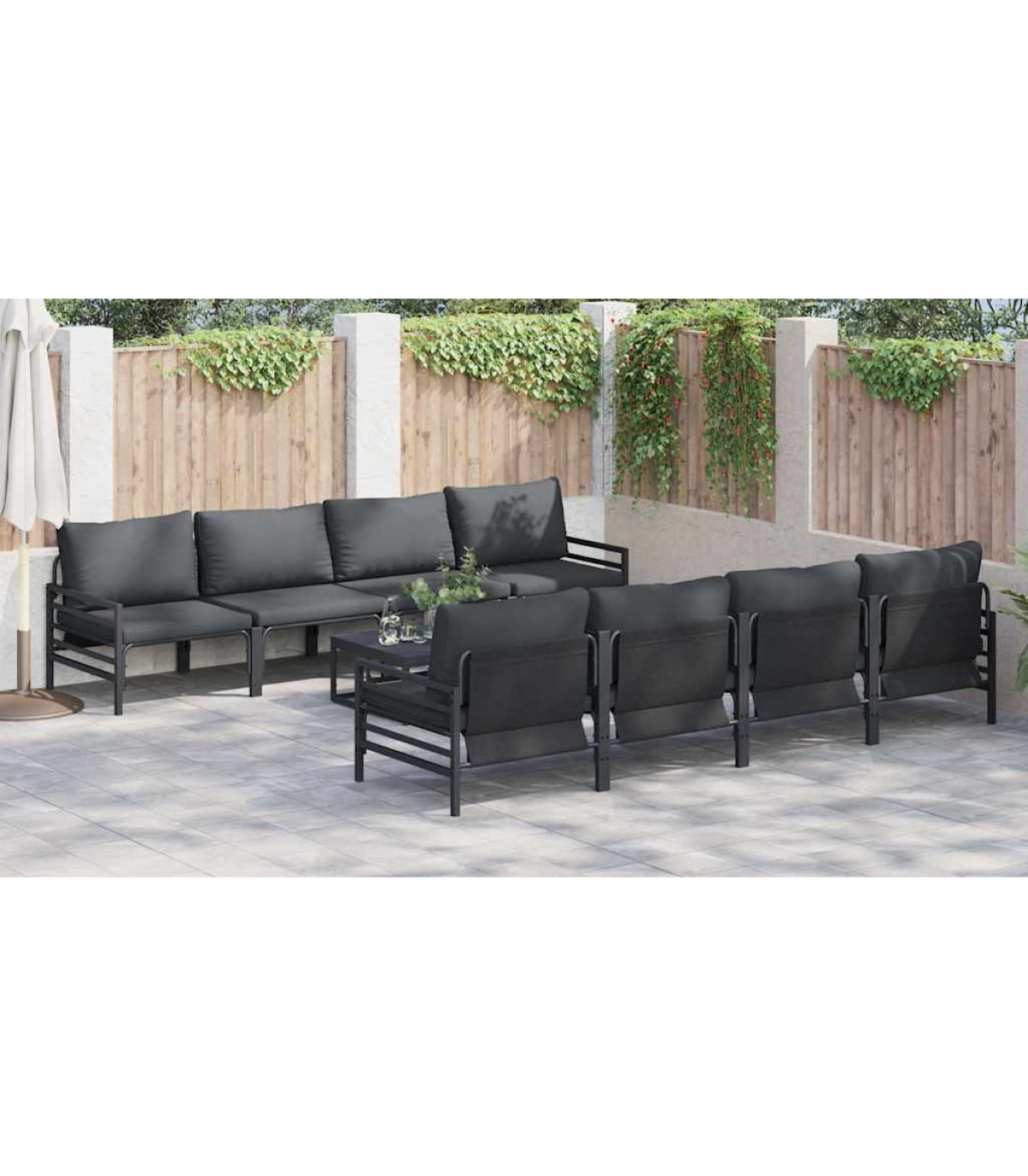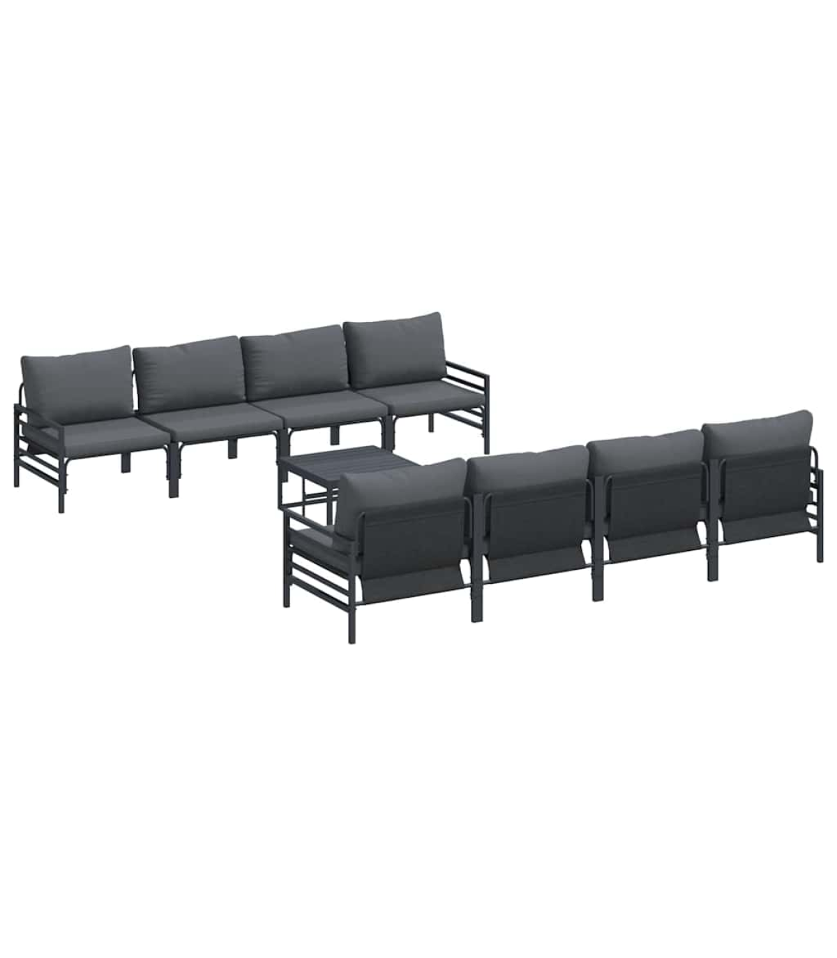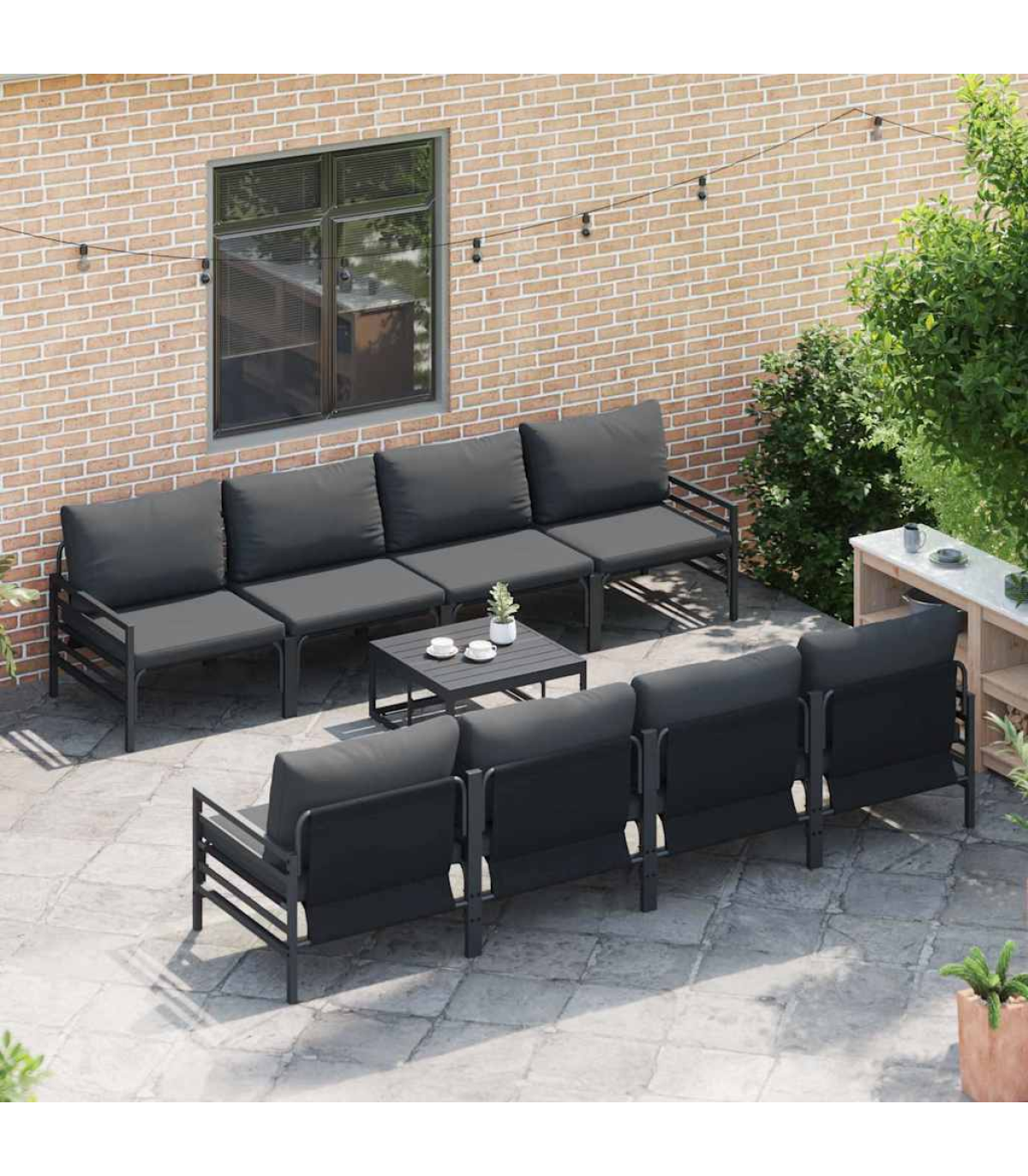 This outdoor modular furniture set nails it by mixing style with practicality, boasting a modern design that's just right for gardens and terraces. With its slick look, this set creates a warm vibe for hangouts and chilling out. It’s for those who love a clean and elegant touch, fitting into any outdoor space and bringing a contemporary feel that encourages family and friends to enjoy some fresh air. Materials: The strong steel frame has a powder-coated finish, which keeps it safe from rough weather. The anthracite frame colour gives it a chic and modern vibe. The cushions are made from durable polyester for comfort and longevity. Included Components: The set comes with four arm sofas, four middle sofas, and one table, giving you a complete outdoor seating solution. Each piece adds flexibility and comfort to any garden or terrace. Features / Function / Design: Thanks to its modular design, you can mix and match pieces or expand it as you please. Cushions have a zip closure for easy cleaning, while the minimalist style keeps things looking sharp and tidy. Recommended Uses: Great for gardens and terraces, it's perfect for social gatherings, quiet reading, or soaking up some sun. Its sturdy build means it's a must-have for outdoor relaxation. Care & Maintenance: Use a waterproof cover when it’s not in use to keep it looking good. The cushions are easy to remove with the zip closure, making cleaning straightforward and quick.
