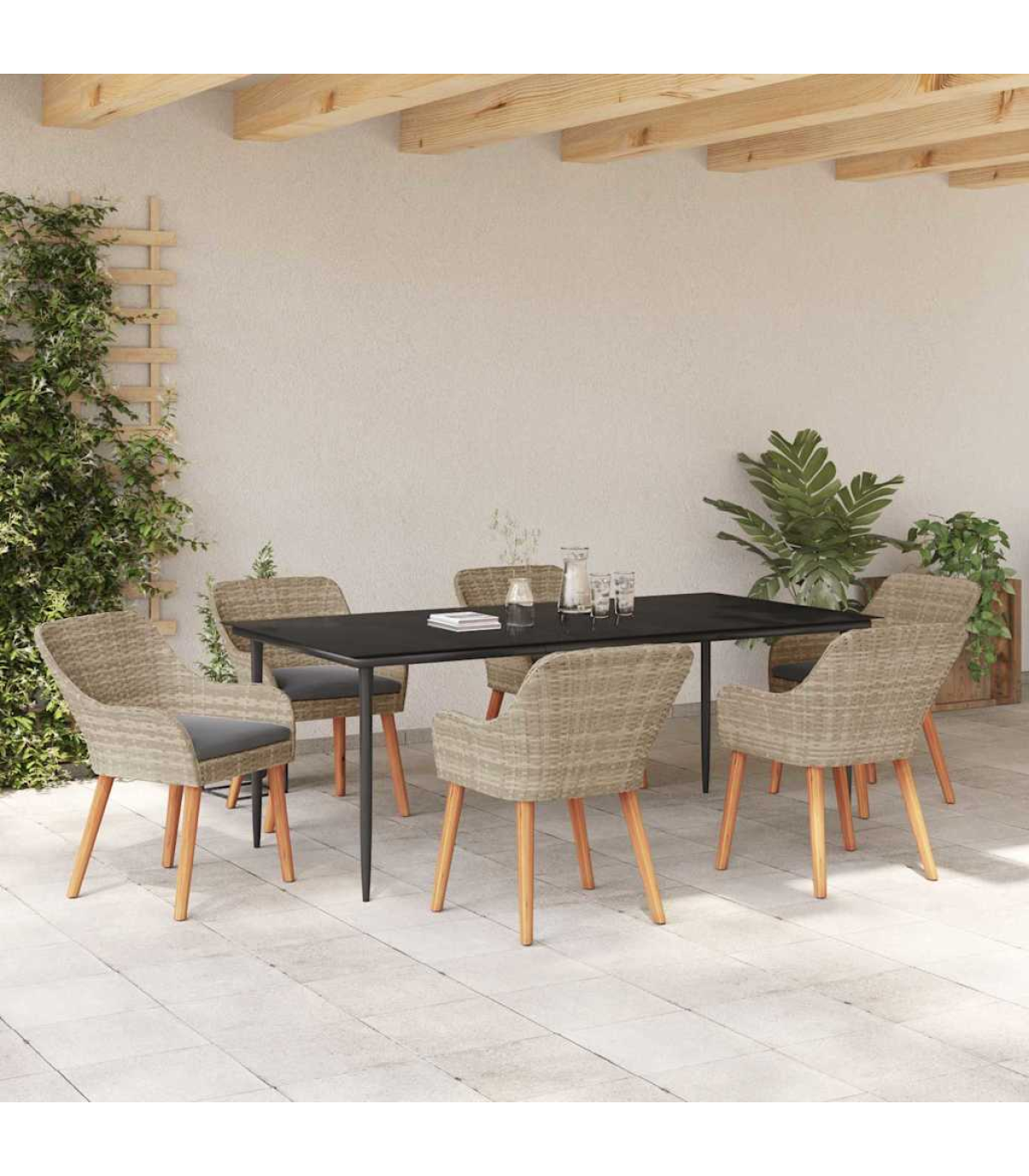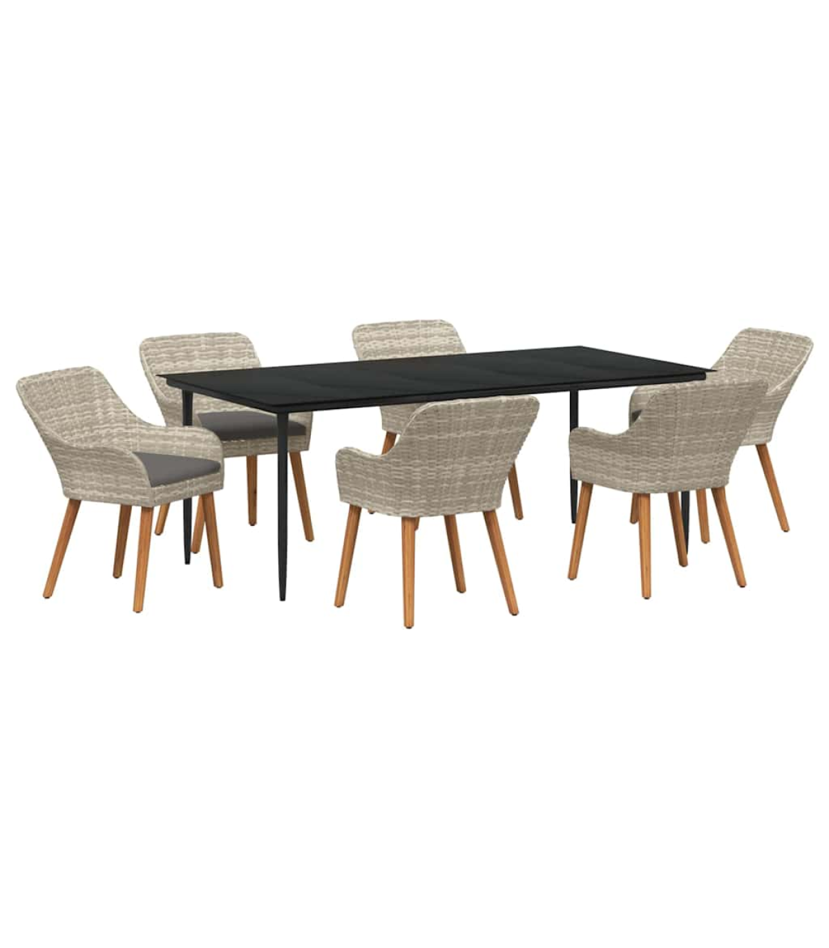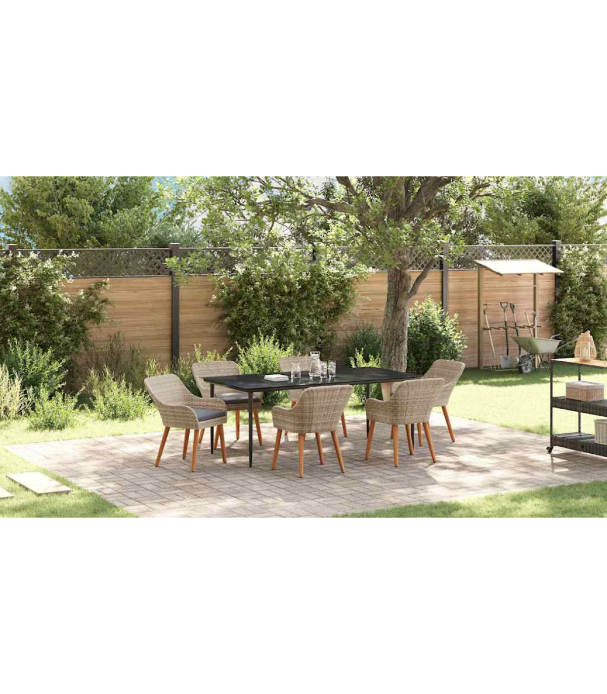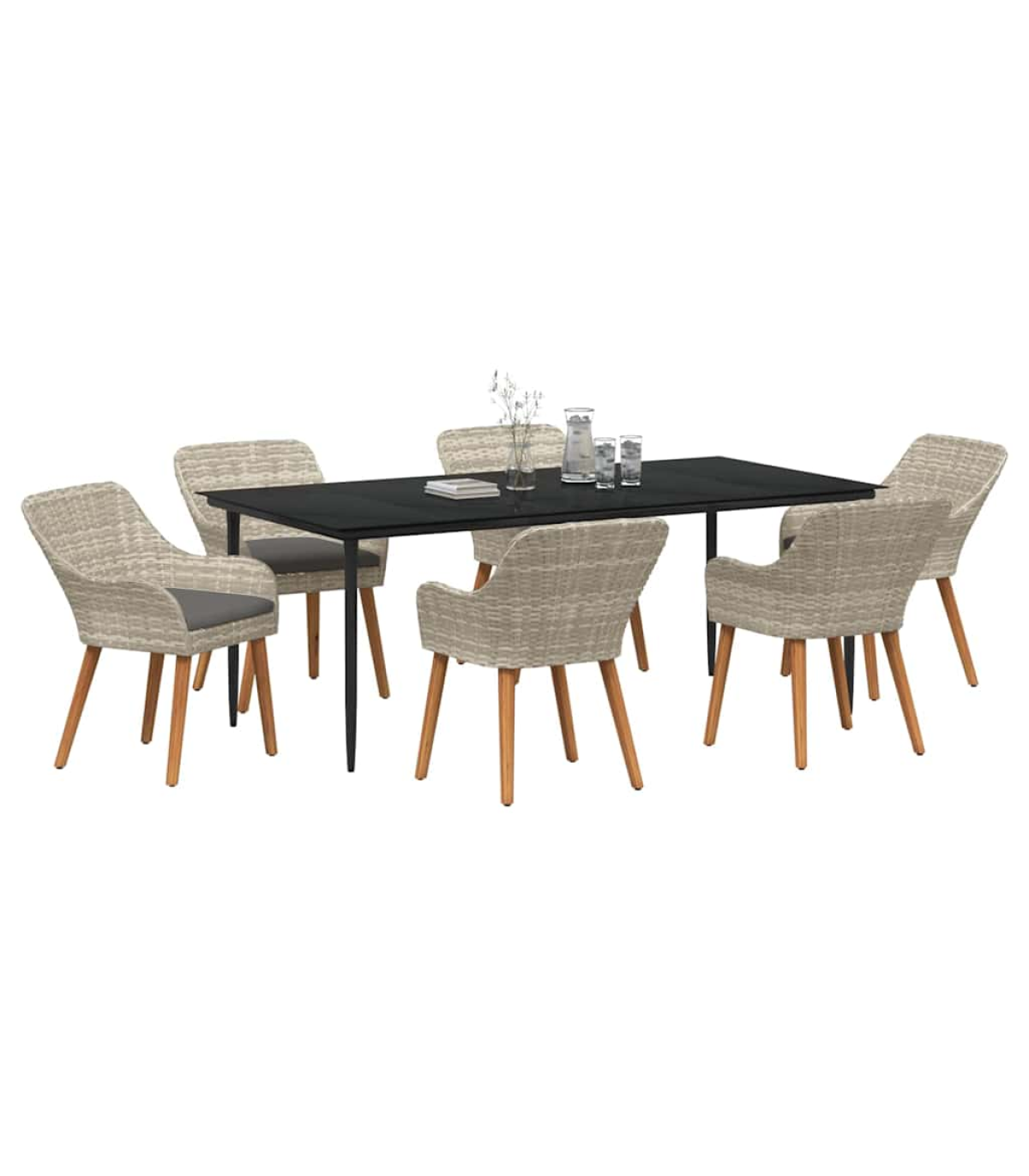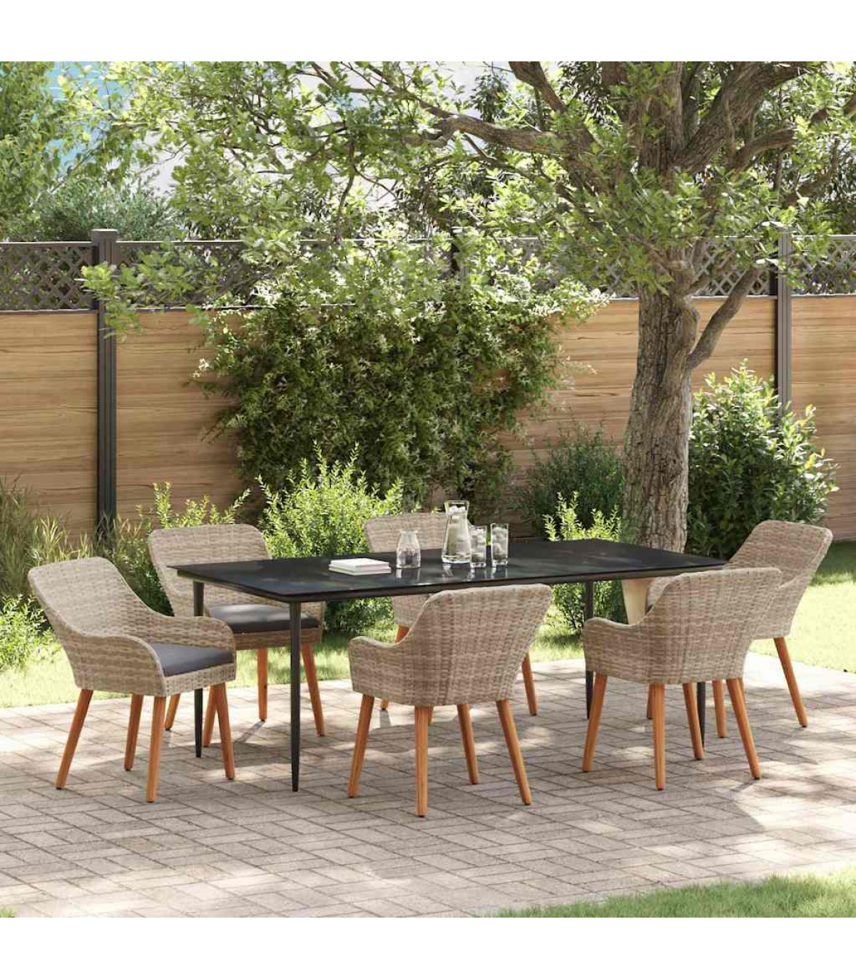 This stylish outdoor dining set is made for folks who love elegance and practicality. It’s spot on for eating alfresco, blending modern style with useful features, making it a top choice for any outdoor area. Its sleek design and comfy seats invite guests to enjoy meals in nature, providing a lovely vibe for get-togethers with friends and family. Materials: Built from high-quality poly rattan, the dining set has a nice texture and finish. The main material is picked for its UV and moisture resistance, giving it lasting power outdoors. The metal frame adds strength and supports the rattan's look and feel, while being easy to keep clean. Included Components: Besides the main dining table and chairs, every piece has smartly designed legs for stability. The seats are comfy and match the table’s size to create a seamless dining experience. Features / Function / Design: As mentioned, the dining set seats several people comfortably, making it great for gatherings and parties. What makes it special is the blend of style and durability, making it an appealing option in modern gardens and outdoor spaces. Recommended Uses: Perfect for patios, gardens, and other outdoor spots, this set fits well in various social settings. Whether it’s a family BBQ or a classy dinner under the stars, it adapts easily to different occasions. Care & Maintenance: To keep it looking fab, cover the dining set when you’re not using it, protecting it from the weather. A quick wipe down to remove dust will keep it looking great and ensure it remains a beloved part of your outdoor decor.