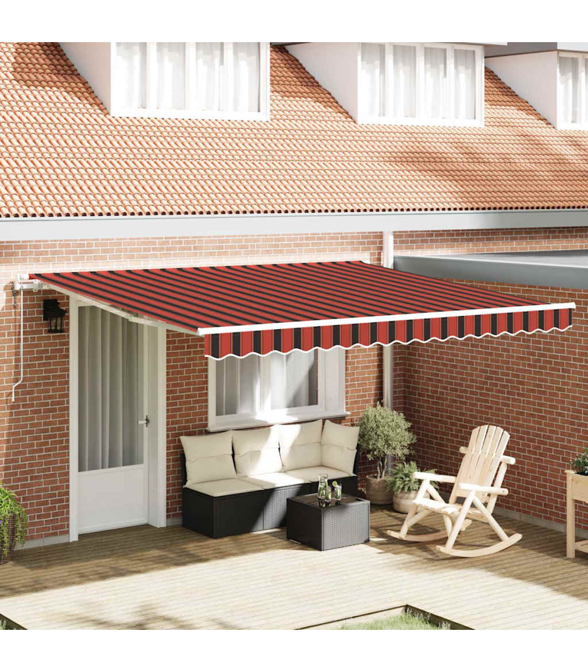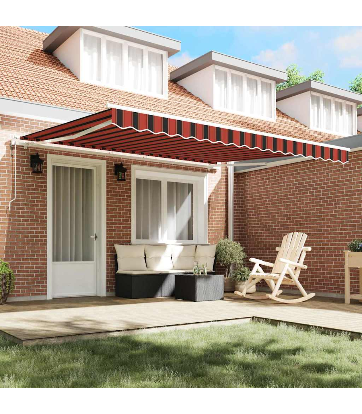 This retractable awning isn't just stylish; it's also super practical for your outdoor spaces like balconies and gardens. Designed for a modern look, it fits in perfectly with its sleek finish, making it a top choice for different outdoor spots. The combination of opaque orange and brown stripes gives it a unique look, boosting the overall vibe while keeping you shaded and protected from the sun. Material: Made from quality fabric made for the outdoors, ensuring it can handle the weather. The fabric resists fading, keeping it looking fresh even after long sun exposure. This makes it reliable for anyone wanting long-lasting outdoor furniture, fitting right into gardens, terraces, or balconies. Features: The awning’s UV and water-resistant materials give double protection against sun and rain. You can enjoy your space no matter the weather, making it perfect for hosting parties or chilling outside, knowing you're well covered. Included Components: The awning comes with a remote, so you can easily adjust it to suit your shade needs. An awning frame supports the structure, keeping it steady and allowing you to change its position or angle when the sun shifts. Style & Design: With a matte finish and a striped pattern, it’s a real eye-catcher, enhancing modern outdoor decor. The brown and orange colours match lots of exterior styles, creating a welcoming vibe for guests and family. Care Instructions: To keep it looking great, treat the fabric with a waterproofing spray for heavy rain. This helps reduce the risk of water damage and keeps it fresh and vibrant with minimal effort. Danger! Strong spring when opens. DO NOT remove this rope unless you have finished all of the assembly steps with all bolts are fastened and the item is attached to the wall! Warning! Take care when loosening the arms, because they are under tension! A sudden release of the arm of a folding arm awning can cause injury. Warning: The operator’s instruction shall be read before the use of the product. Warning: The operation in frosty conditions may damage the product. External use in buildings and other construction works. Do not allow children to play with the control device of the blind. Keep remote control away from children. Children should be supervised to ensure that they do not play with the appliance. Keep children away from the assembly area. Attention: Reading the instructions carefully before use and keep it for further reference.