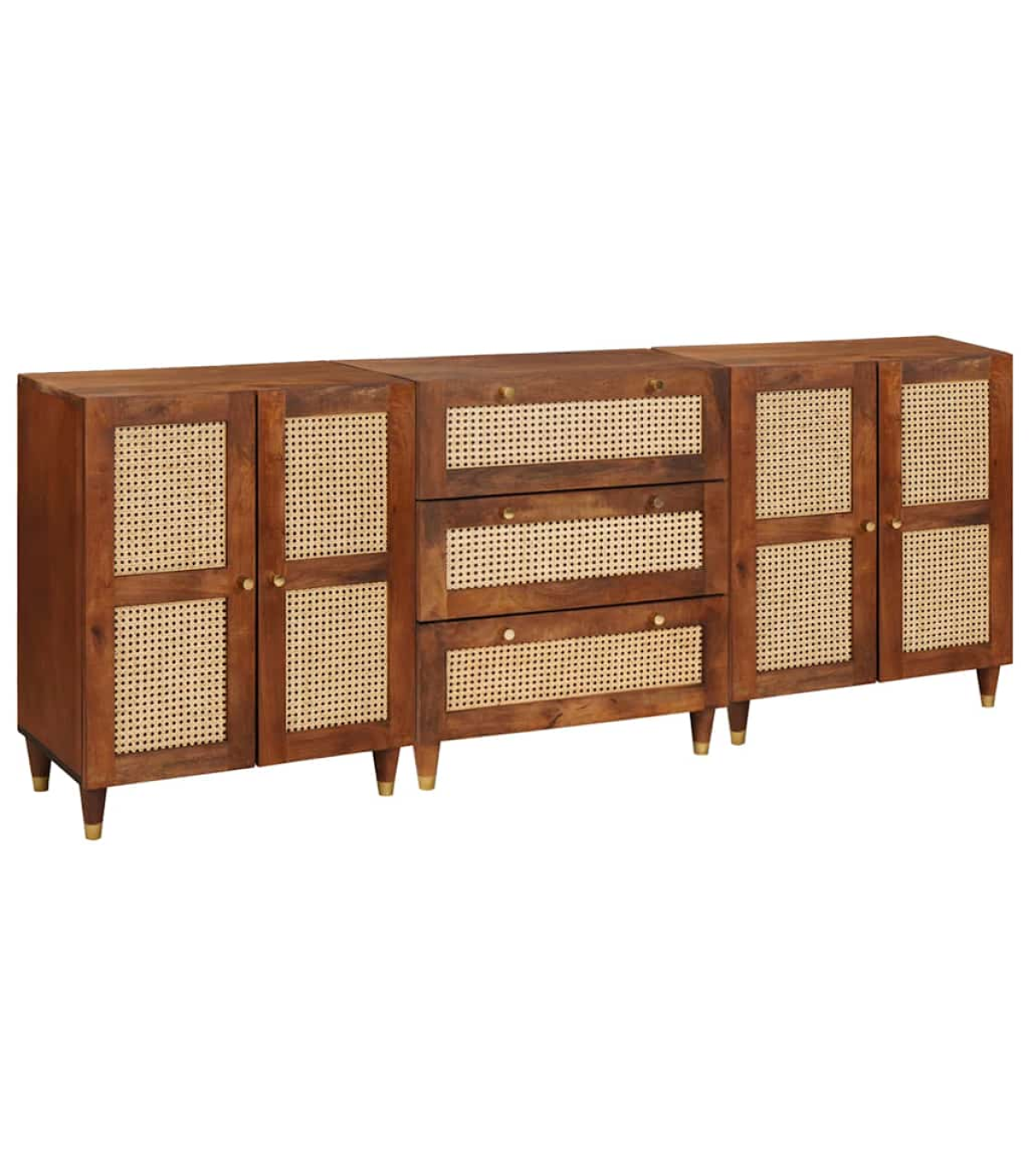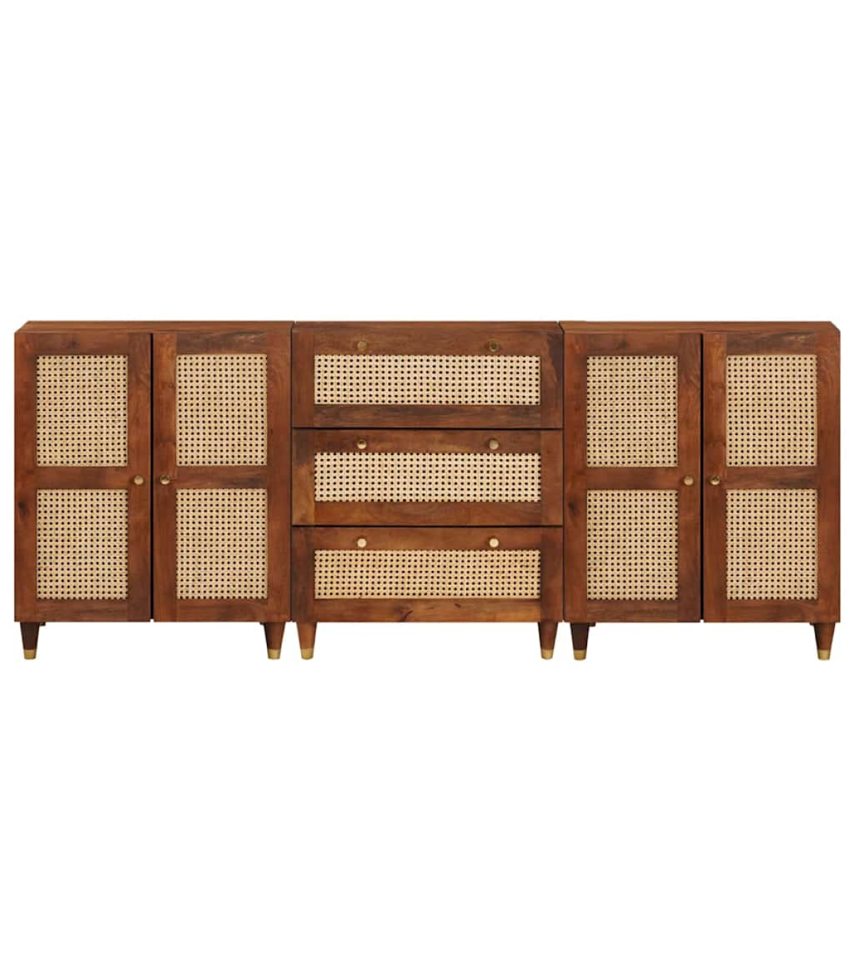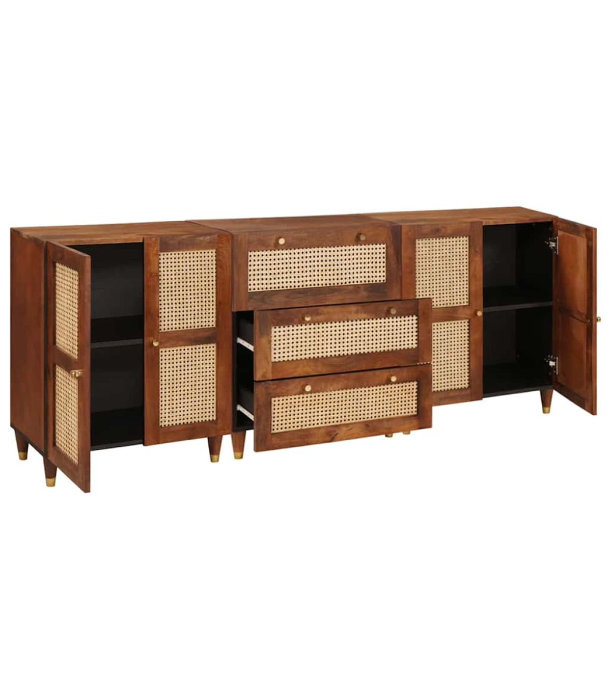 This Traditional Sideboard Set is a real showstopper for any living room, blending classic elegance with top-notch practicality. It's crafted to perfection, providing lots of storage wrapped in a rich brown colour, guaranteed to spruce up your decor while keeping things tidy. Great for homes that value both style and organisation, this sideboard lets you neatly arrange dining ware, books, or decorative bits, making a statement in any space. Solid Mango Wood: This sideboard is made from solid mango wood, well-known for its strength and lovely texture. It's built to last and adds a lush look to your room. The natural grain and texture give it a beautiful finish that’s both eye-catching and durable. This material ensures your sideboard stays sturdy and stylish for years. Included Components: The set comes with big storage drawers, hinged doors, and sturdy shelves, using solid mango wood throughout. The doors open easily, revealing a generous space perfect for tucking away items you want to keep handy yet out of sight. The shelves are great for showing off decor or storing dinnerware within easy reach. Functionality: With practicality in mind, the sideboard has storage drawers that slide open effortlessly, providing a handy solution for organising smaller bits. It combines open shelves and closed cupboards for a nice mix of display and storage, giving you flexibility in how you arrange and present your items. Use Scenarios: Whether in a living room or dining area, this versatile piece fits perfectly in different spots, making it ideal for storing everything from linens to books or keeping your dining essentials neat and organised. Its rectangular shape works well in both compact and spacious rooms. Care & Maintenance: Keeping it looking great is a breeze—just wipe it down with a damp cloth! The simple care instructions mean this sideboard will be a trusty part of your home for years to come.