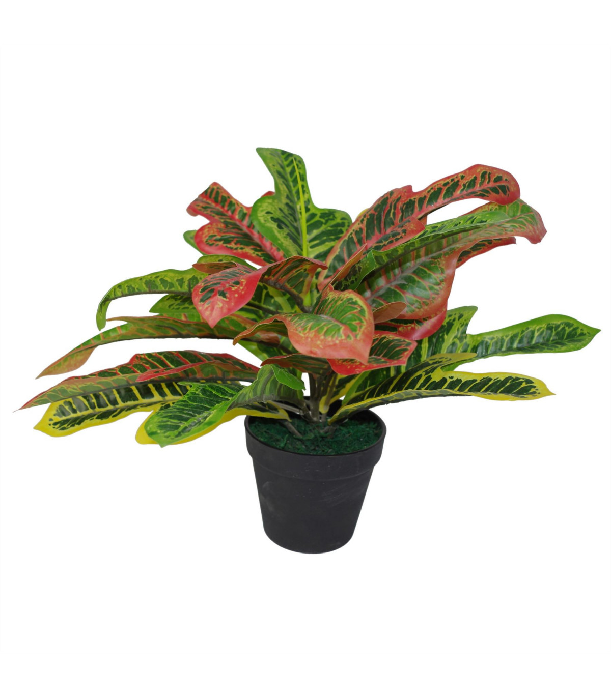 Codiaeum Variegatum (also known as Variegated Croton- Garden Croton and Joseph's Coat) is a plant native to Australia and Indonesia. With its beautiful variegated leaves it is easy to see why this is a popular houseplant. Real Codiaeum Variegatum plants are not only poisonous but are also extremely tricky to grow and maintain indoors making an artificial Codiaeum Variegatum plant the ideal alternative! This artificial plant stands 40cm high when arranged as shown in the pictures. The width will vary depending on how you arrange the leaves. Our artificial version is extremely realistic and totally safe (real Codiaeum is both poisonous and irritant!) The stems are wired and can be rearranged to suit your requirements. It comes potted in a plastic pot and is ready to display - just arrange the stems as you wish. Ceramic planters pictured are for illustration only and are not included. This plant comes in a plain black plastic pot.