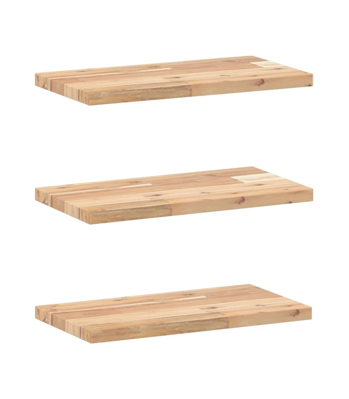Transform your bare wall into a design accent and a practical, space-efficient storage area for your living space with these wooden floating shelves! Robust and stable material: Solid acacia wood is known for its strength and durability. Its diverse colours and unique grain patterns give it an attractive appearance. With excellent stability and resistance to weathering, it is ideal for crafting indoor and outdoor furniture.Untreated surface: This shelf board is made of untreated acacia wood, and you can keep its natural colour or customise it with paint or lacquer to suit your preference.Randomly DIY: You can arrange the shelves in a random pattern, like right-left, upper-down, or in a ladder-like design. By using more wall shelves, you can create unique and personalised patterns.Space saving: This floating shelf maximises unused wall space, converting it into a compact and efficient storage area.Wide applications: This versatile wall-mounted shelf can be used in various settings, such as kitchen, bathroom, living room, bedroom, study, garage, etc. Good to know:Each item is unique with variations in colours and grains. The delivery is random, ensuring the exclusivity and individuality of your product.The delivery includes wall shelves only. Screws and brackets are not included in the delivery.