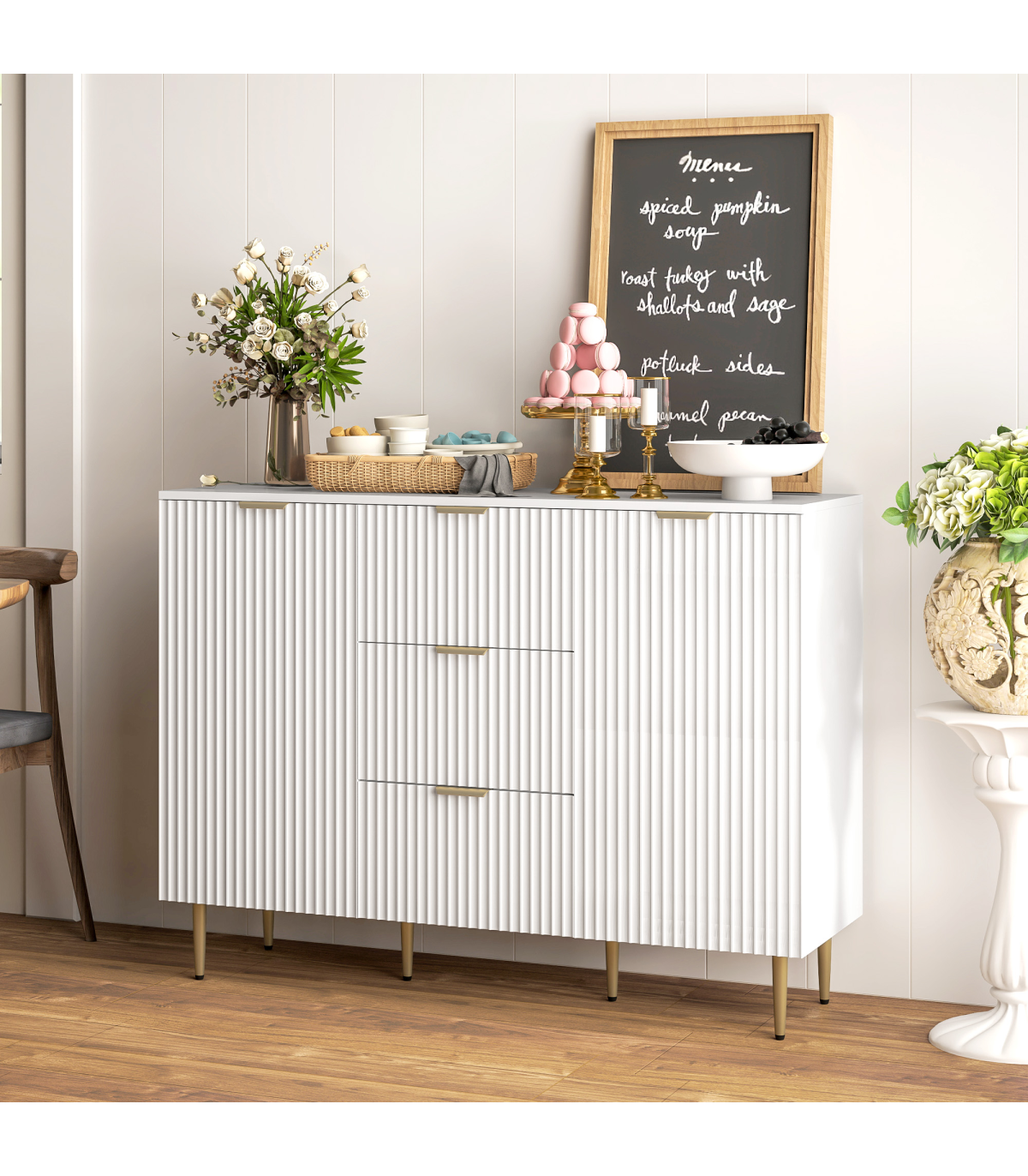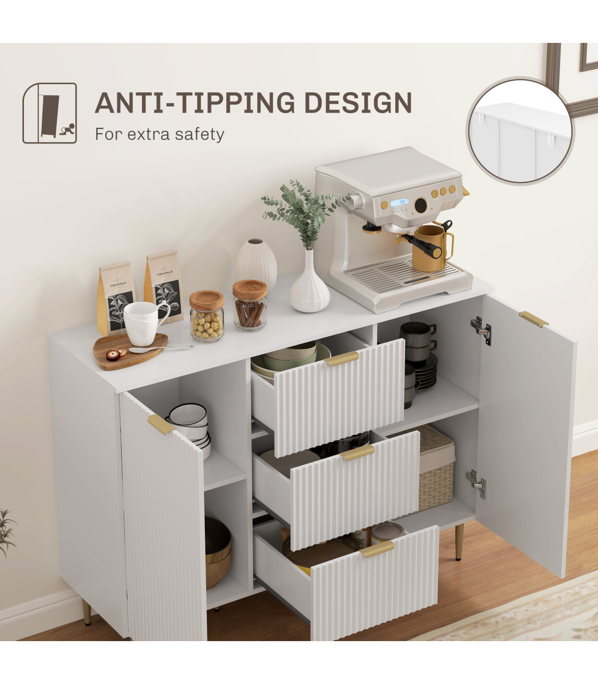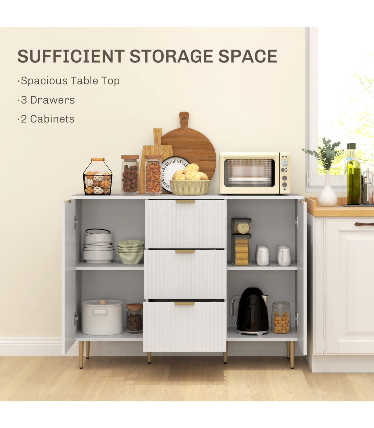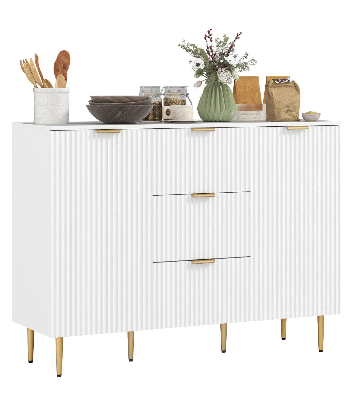 This stylish white storage cabinet provides a versatile solution for all your organisation needs. With three drawers and two cabinets, it is perfect for storing utensils or displaying your television, making it a practical addition to any living space.