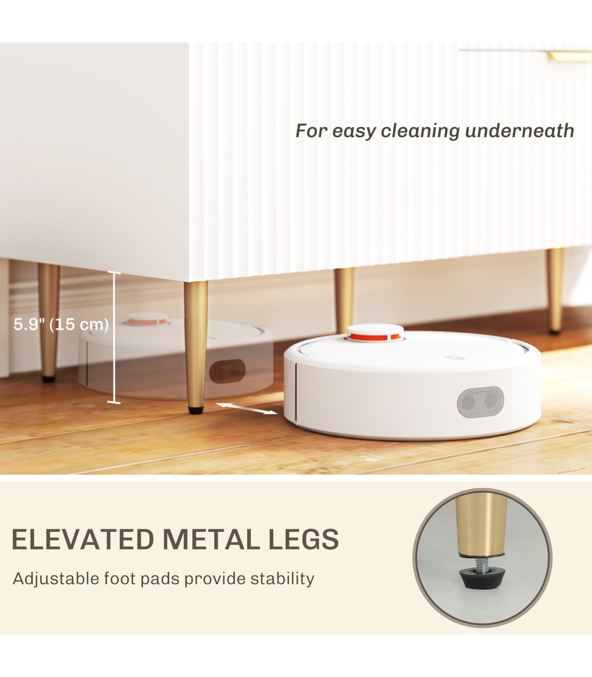 - Easy Cleaning: Elevated metal legs allow for simple cleaning underneath the cabinet.