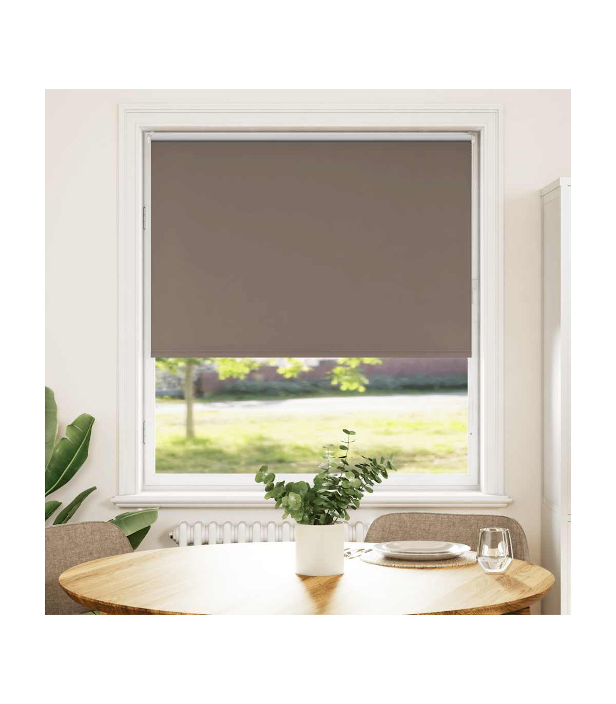Elevate your room's style and functionality with this roller blind, providing privacy, light control, and heat regulation. Durable and low maintenance: Made from 100% polyester, the roller blind is built to last and resist wear and tear. They are also easy to clean, typically requiring light dusting or wiping with a damp cloth.Privacy and light control: Thanks to the blackout design, this roller blind provides privacy and partially blocks direct sunlight so that you can regulate the indoor temperature according to your needs.Multiple mounting methods: You can attach the roller blind to the wall or window with screws or without drilling using clamping brackets, depending on your needs. Clamping brackets for window frame rebate thickness between 1,6 and 2,5 cm.Child safety and adjustability: The roller blind includes a chain connector that makes it easy to adjust the height according to your needs, and it also has a cord clip to add child safety.Wide applications: This versatile roller blind is suitable for homes, offices, cafes, office buildings, and so on. Warning: Keep cords out of the reach of young children. Cords may become wrapped around a child’s neck. Good to know:Before buying blinds, start by measuring your window glass. Just a friendly tip: the fabric is a bit narrower than the total width, including the brackets.To make sure your new blinds provide complete coverage, just add 4,3 cm to the width of the window glass when calculating what to order.