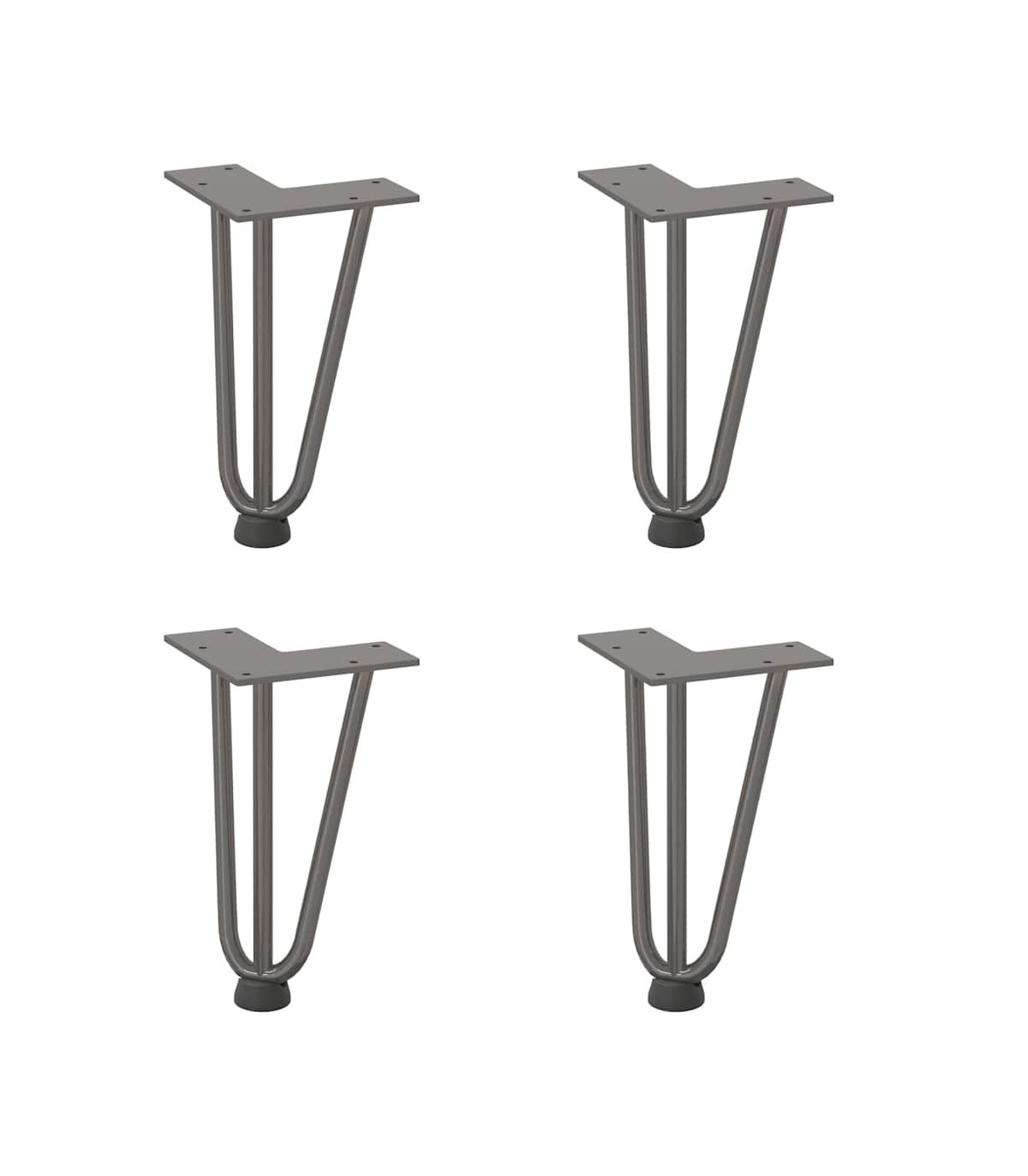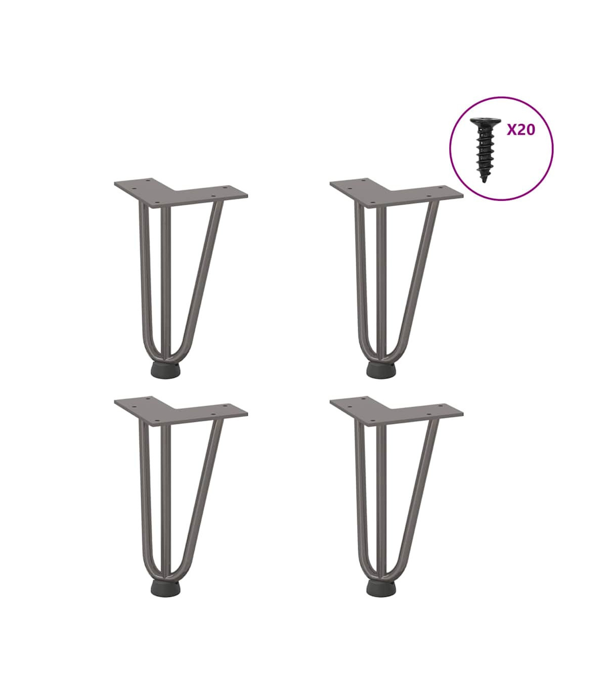 These hairpin table legs combine form and function. It's an ideal choice for customising your coffee table. Durable material: This hairpin table leg is made of solid powder-coated steel, making it sturdy and long-lasting enough to support a heavy tabletop.Practical design: This hairpin table leg includes adjustable foot levellers, ensuring stability even on uneven floors and minimising floor scratches. Furthermore, the bracket incorporates pre-drilled holes and delivery-included screws for attaching the leg to the tabletop (not included), simplifying the assembly process.Modern aesthetics: The hairpin table leg offers a sleek and contemporary look. Its clean lines and geometric design enhance the overall appearance of the furniture. Good to know:The delivery only contains table legs, the tabletop is not included.