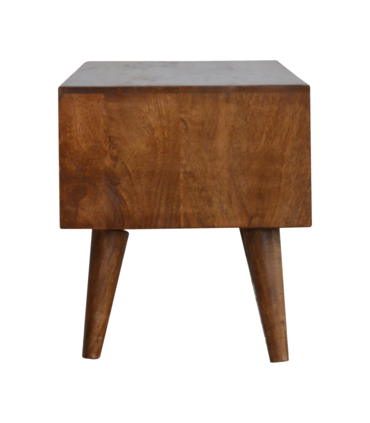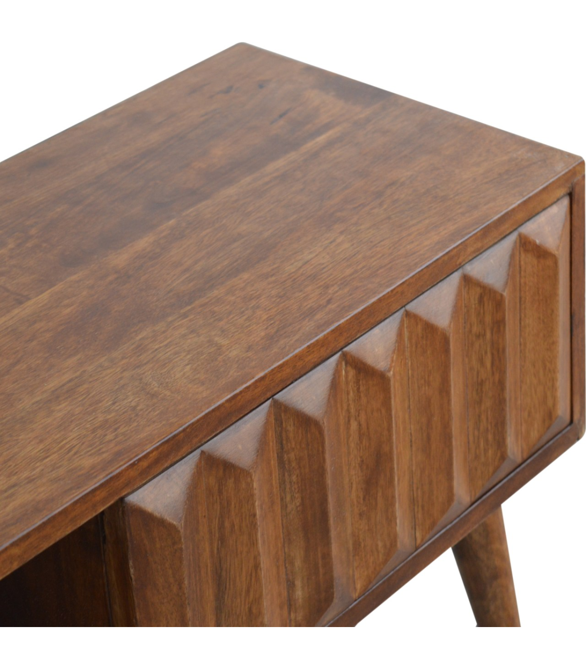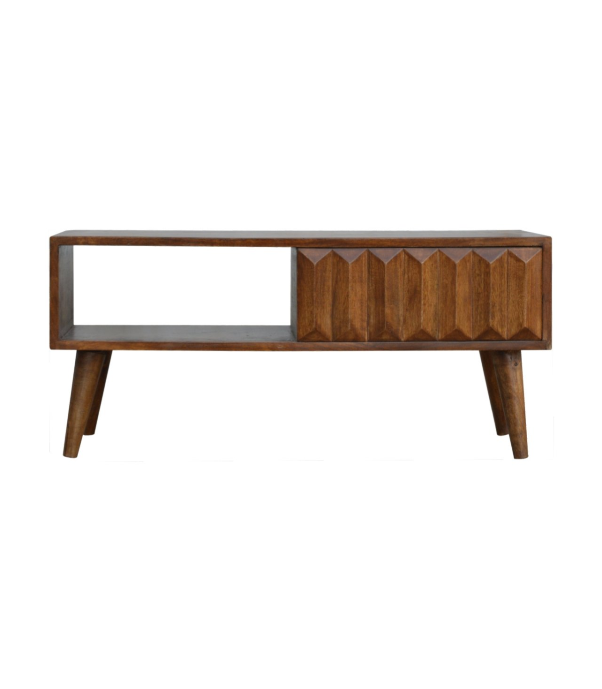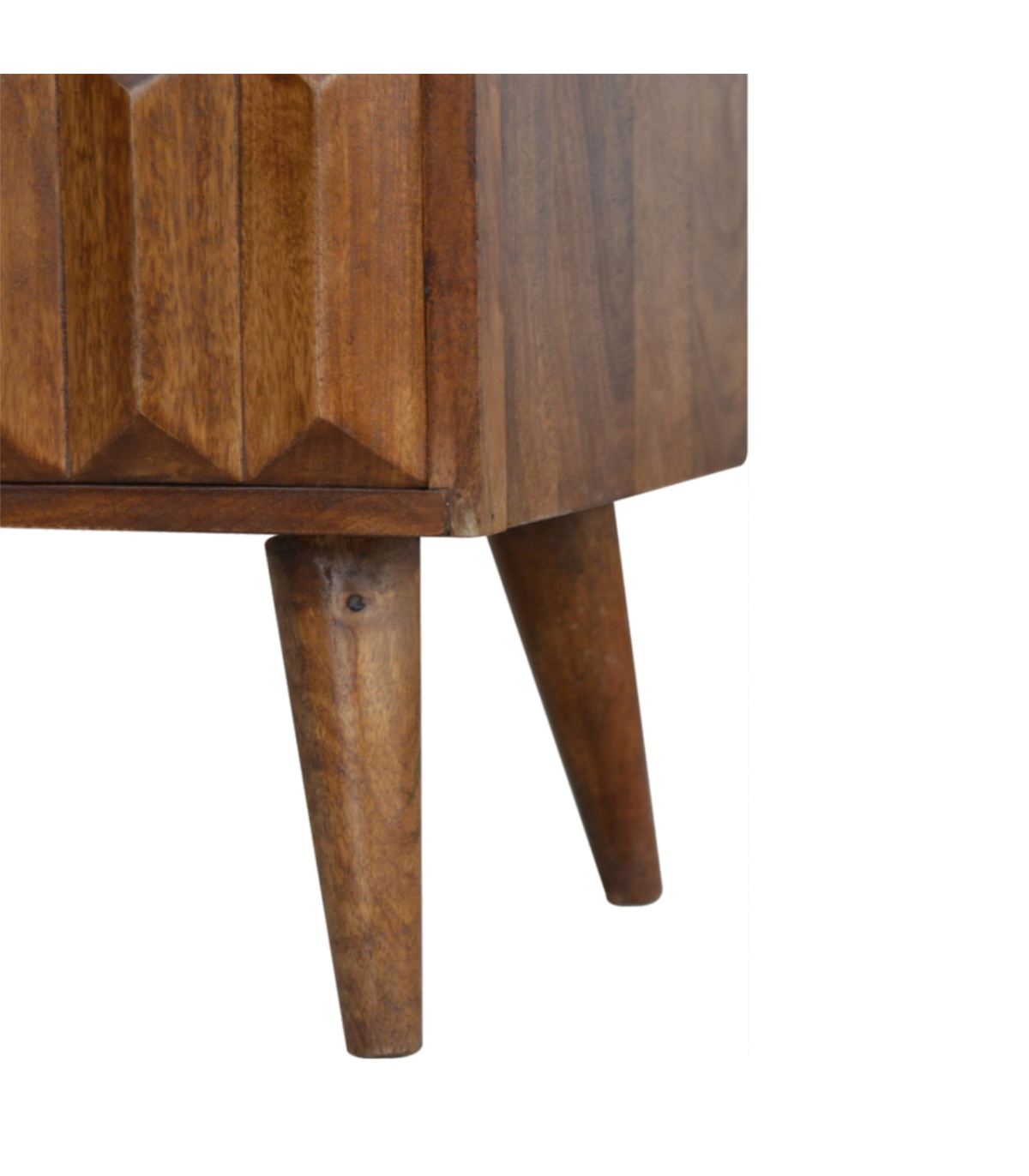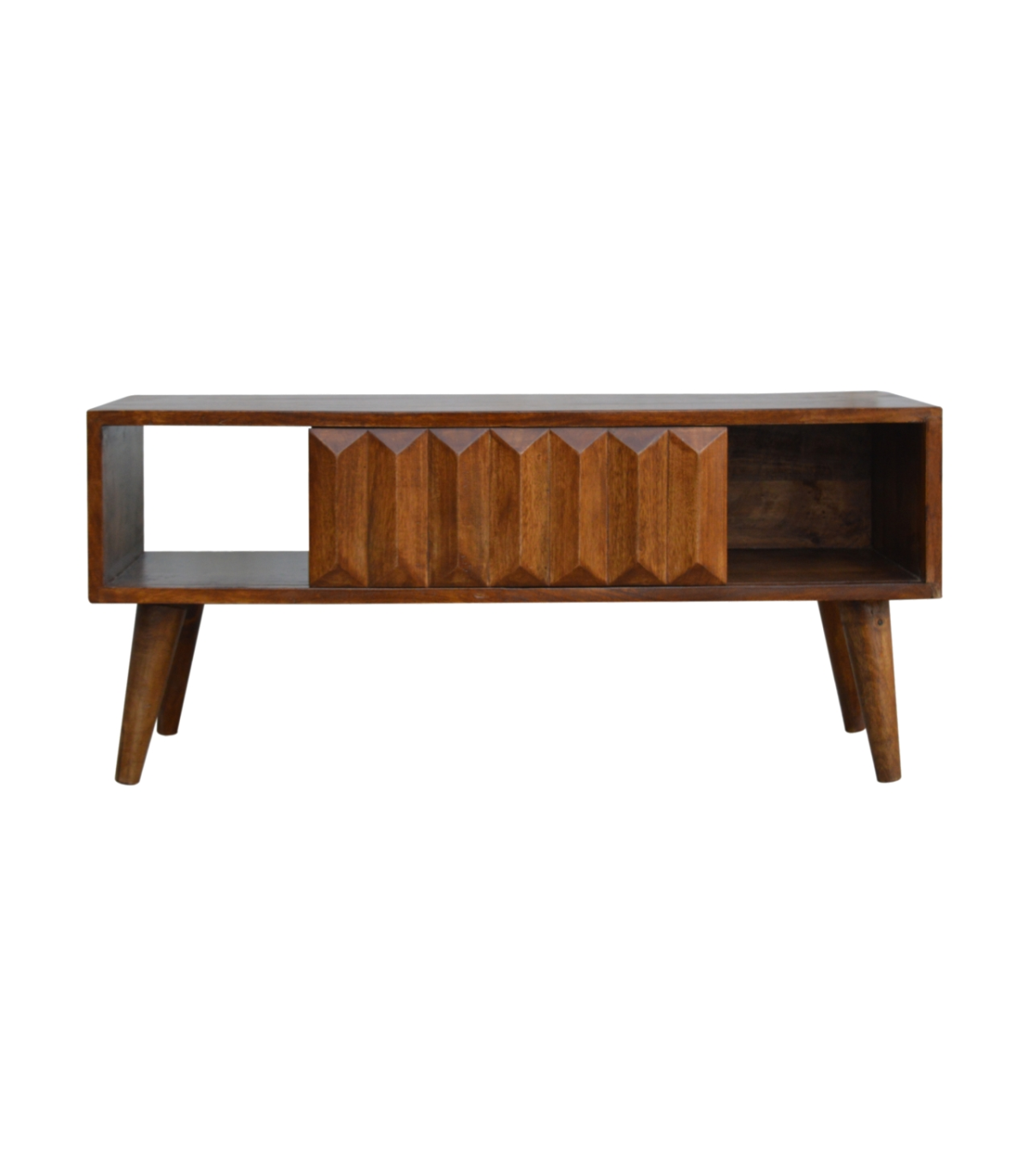 This media unit brings together traditional craftsmanship and modern design, constructed from 100% solid mango wood in a smooth chestnut finish. It includes one open slot for electronics or books, and a standout hand-carved sliding door featuring a raised prism design. The unique door adds artistic flair and texture while providing concealed storage. Supported by four Nordic-style legs, this unit stands firmly while offering a clean, minimal look. Its balanced design makes it ideal for both decorative and functional purposes. A great addition to living rooms, bedrooms, or media spaces. This table fits seamlessly into both contemporary and eclectic interiors. A practical and eye-catching piece for any stylish home.