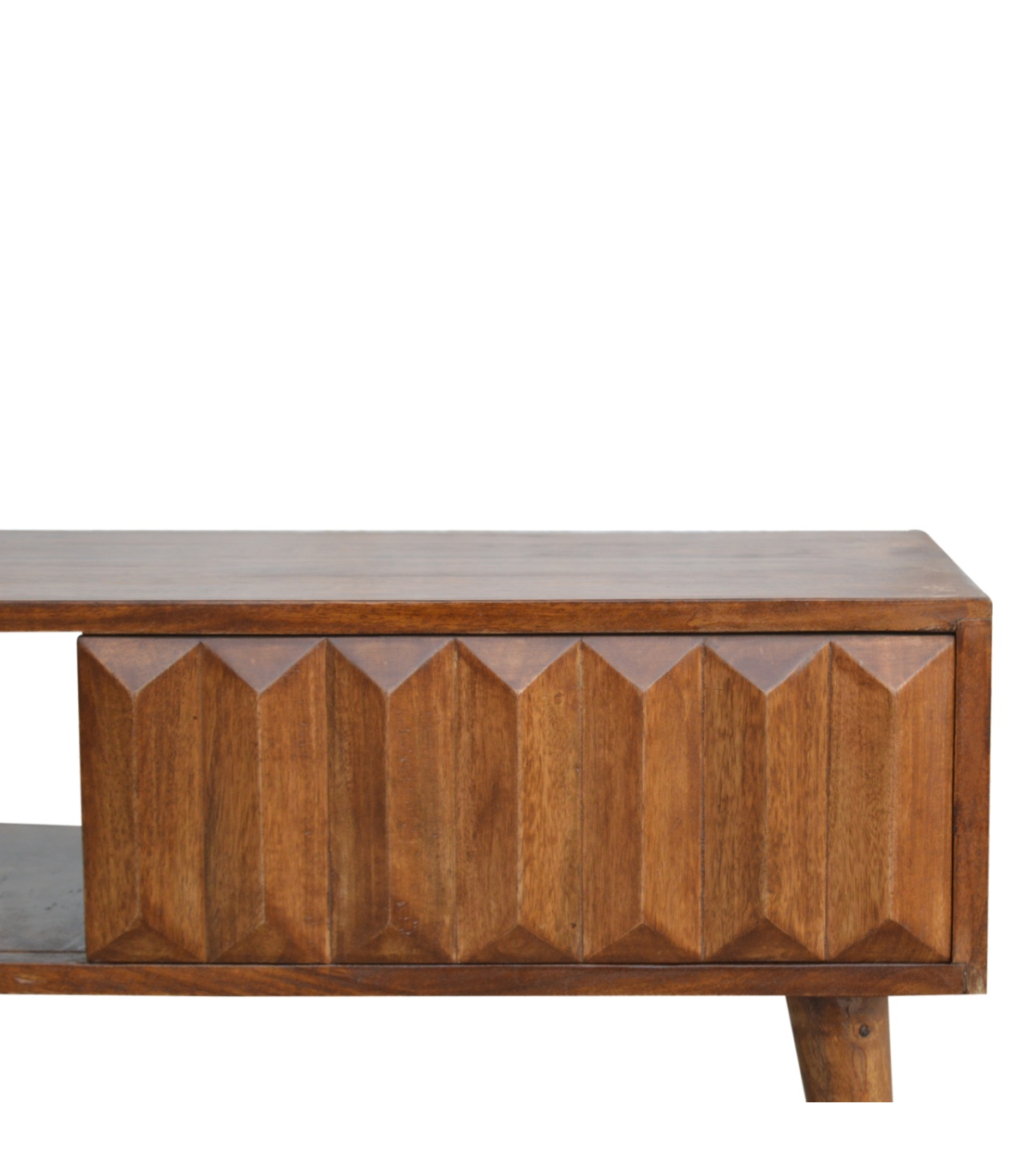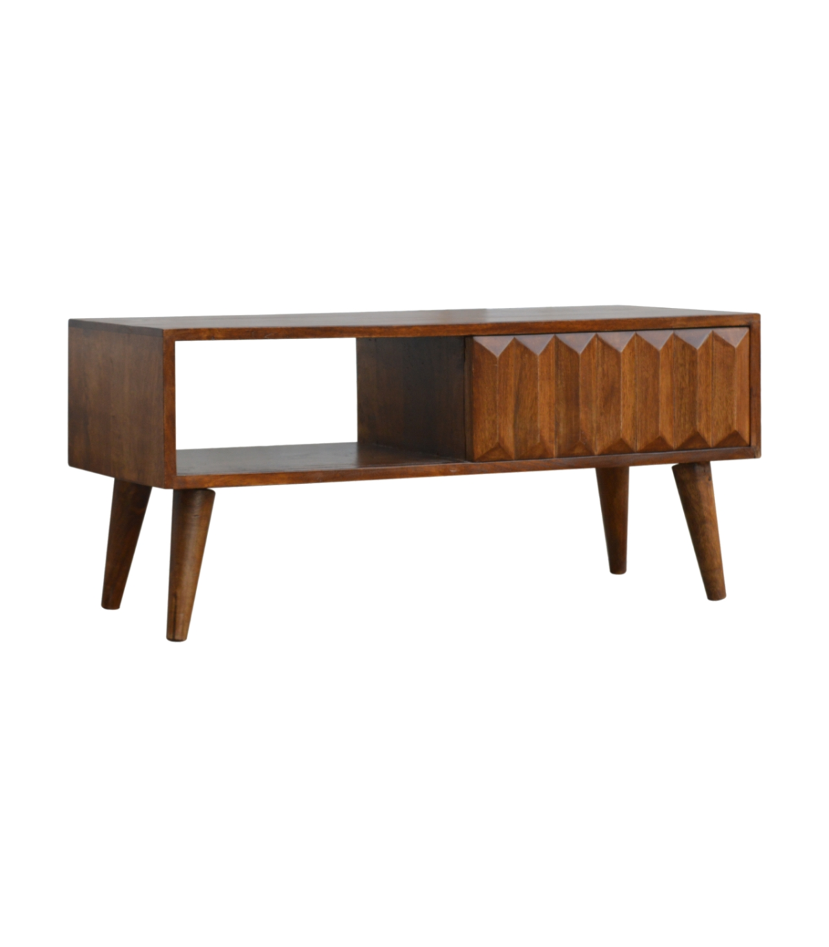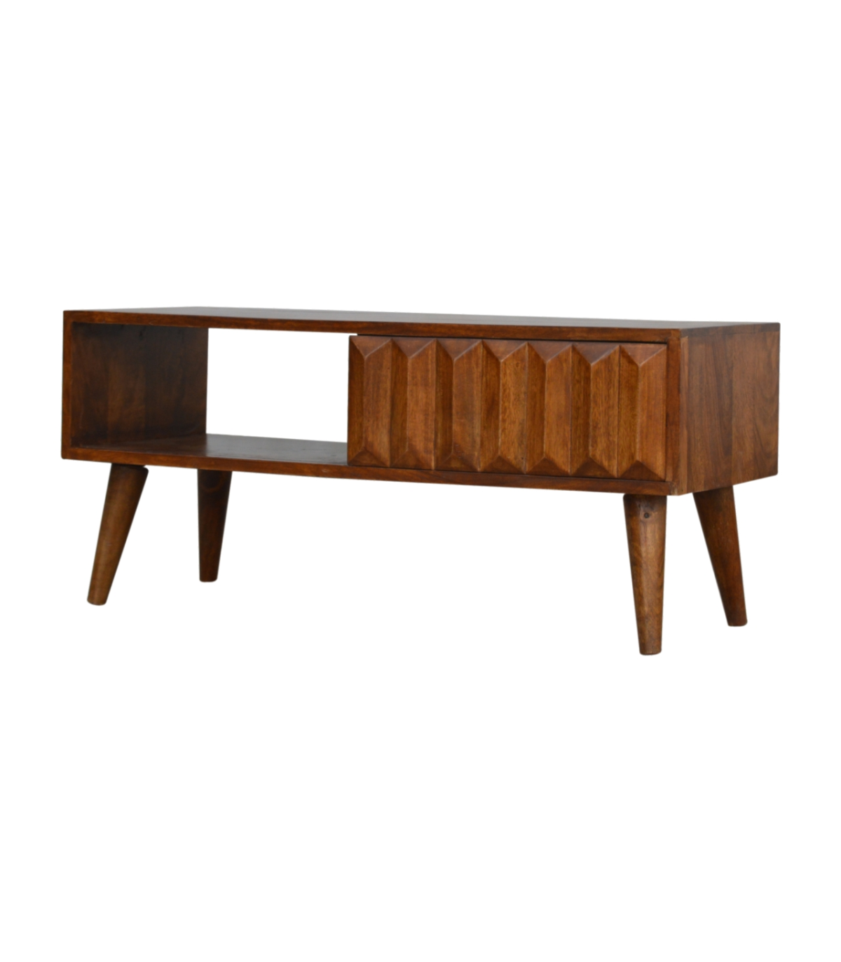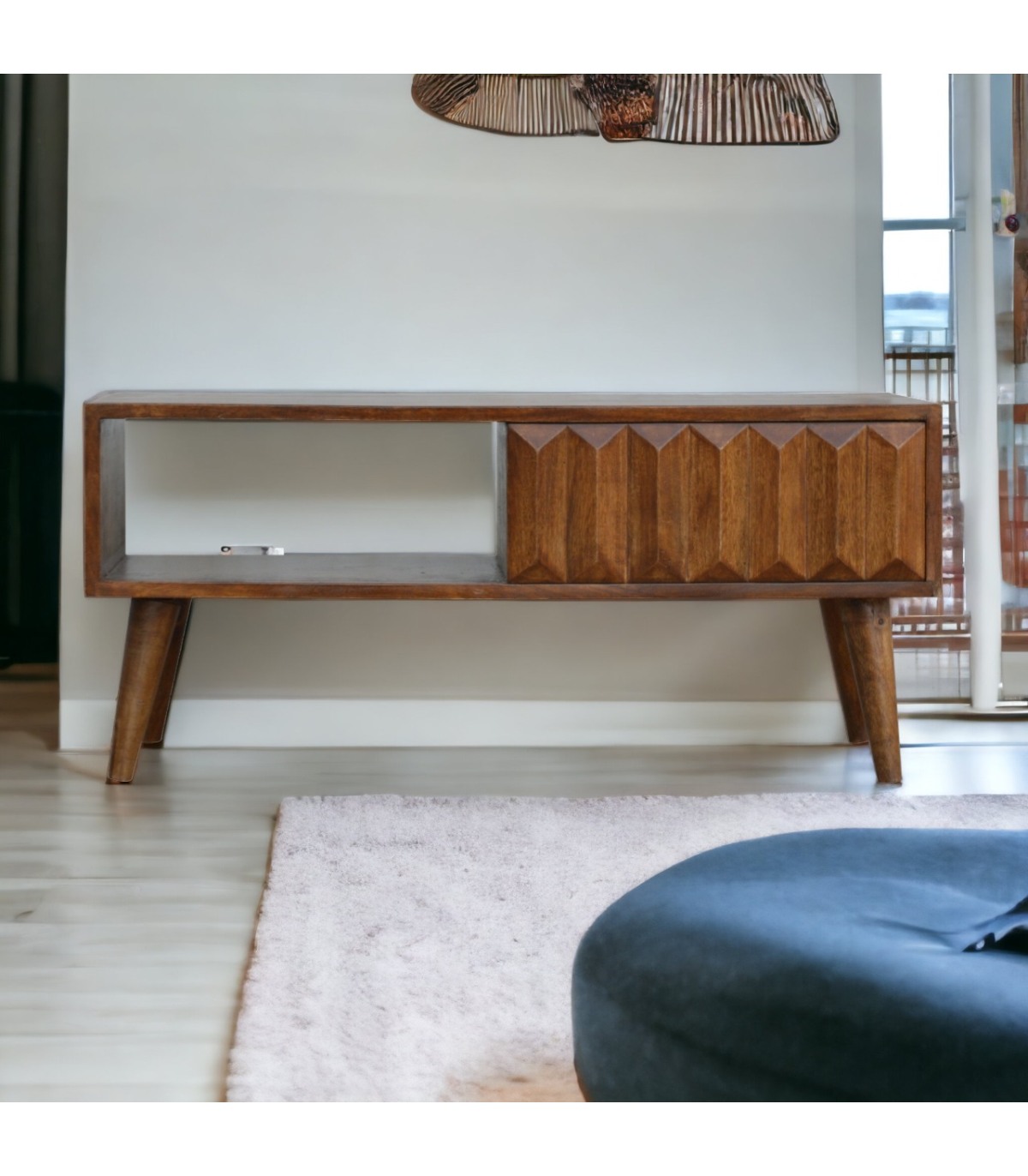 This media unit has been constructed from 100% solid mango wood in a chestnut finish and features 1 open slot and 1 hand-carved sliding door which features a raised prism design. It also features 4 Nordic-style legs which complement the body nicely and give the entire piece a contemporary look. The perfect addition to the home.