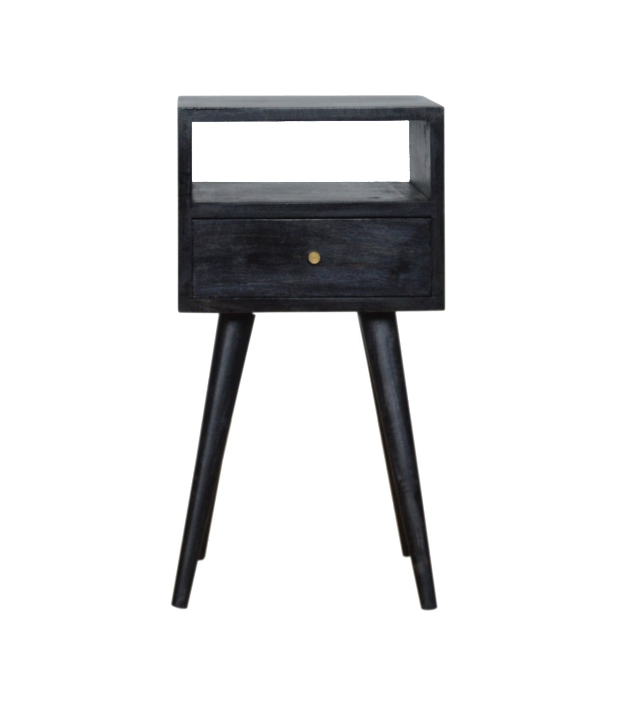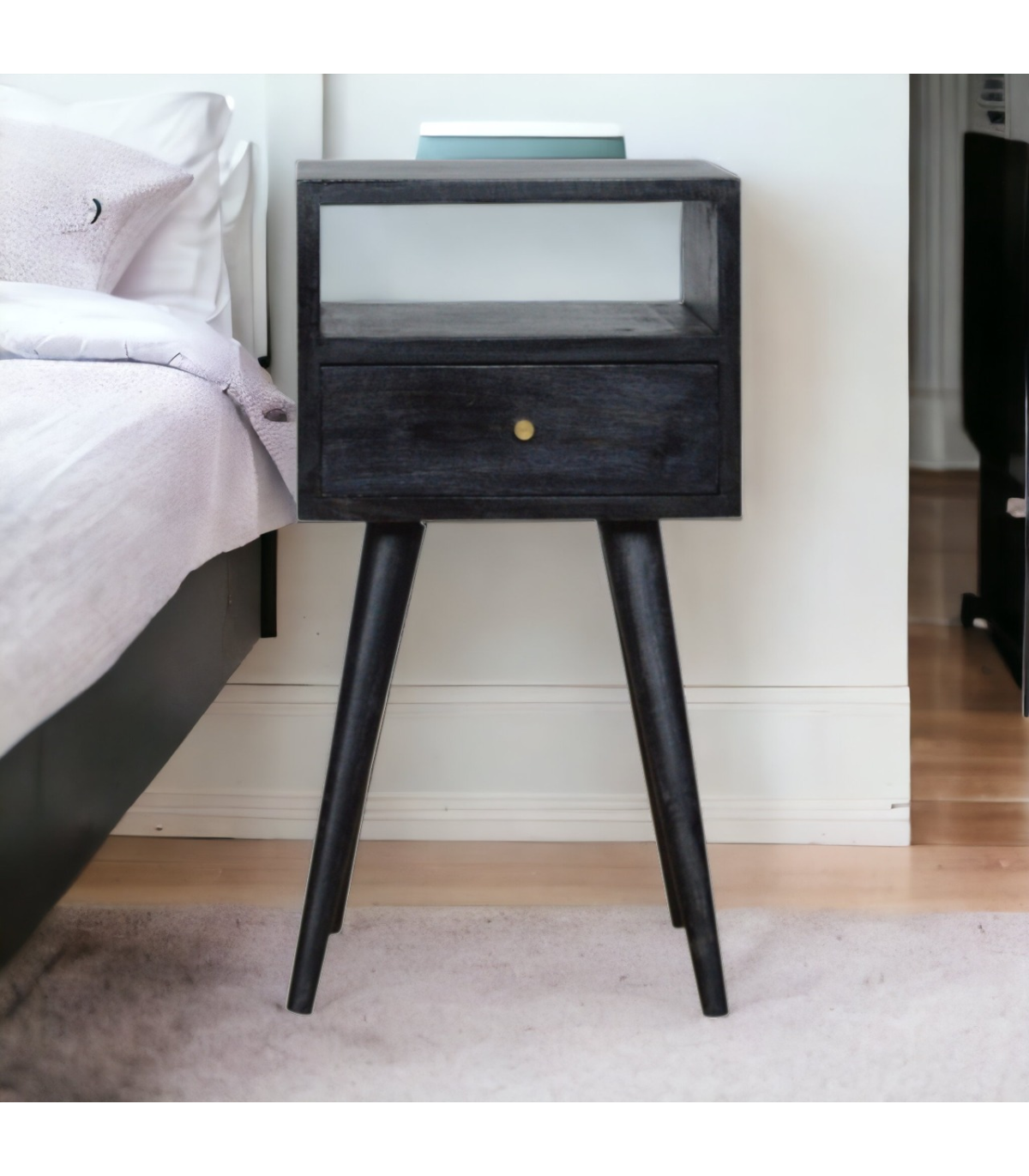 This beautifully designed bedside table is constructed from 100% solid mango wood and finished in a rich ash black tone. It features a spacious drawer and open shelf for organized storage of bedtime essentials. The smooth tabletop is ideal for d?or, books, or a reading lamp. Pull-out drawer access and four Scandinavian-style legs add Nordic charm and modern flair. A perfect balance between bold color and elegant design. This versatile piece fits seamlessly into both minimalist and eclectic bedroom interiors.