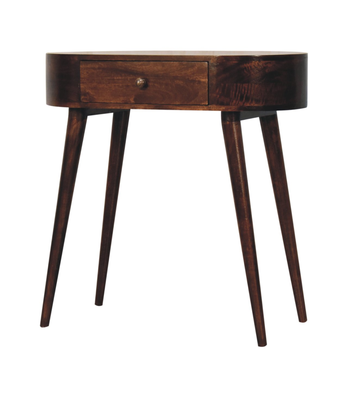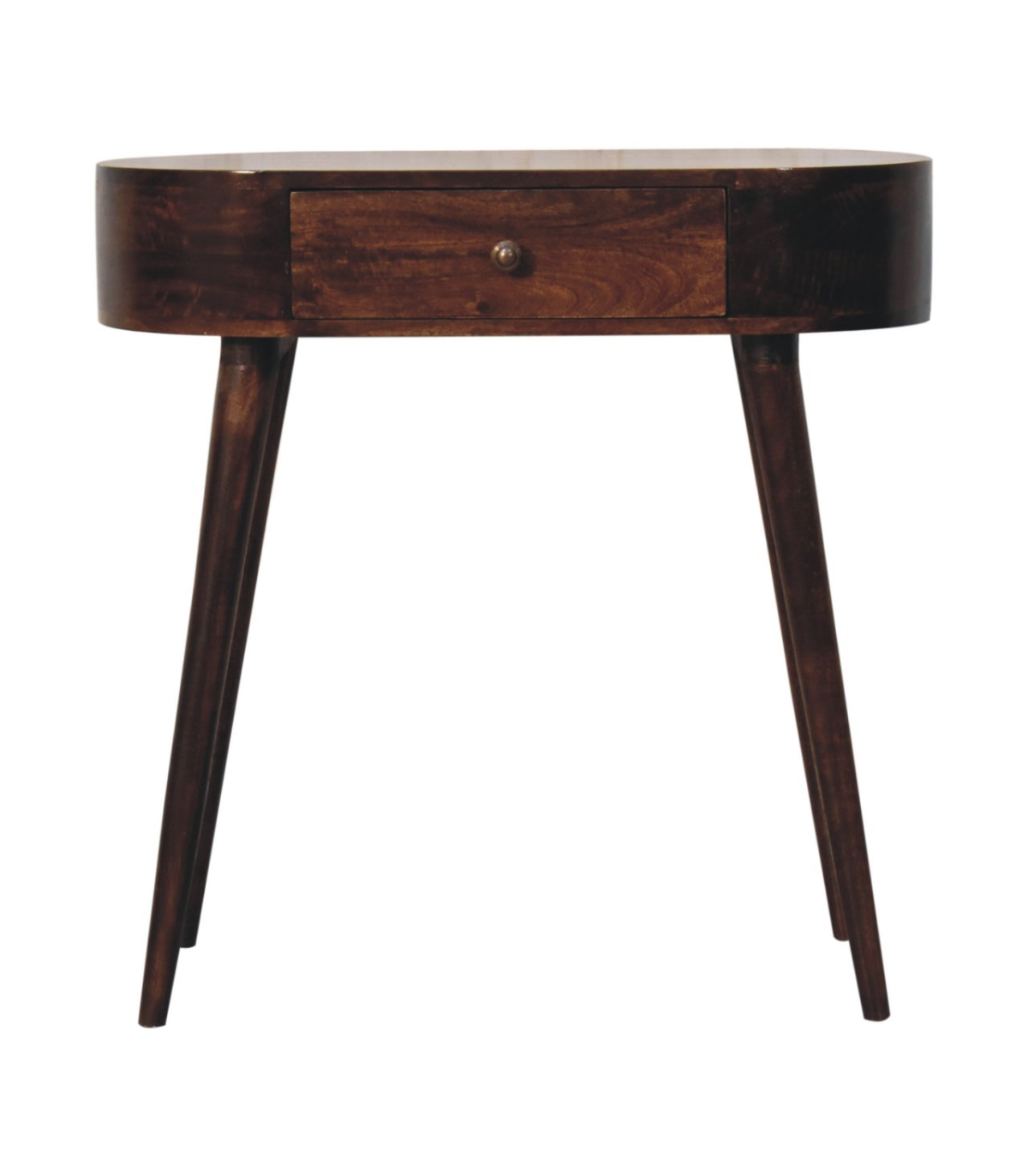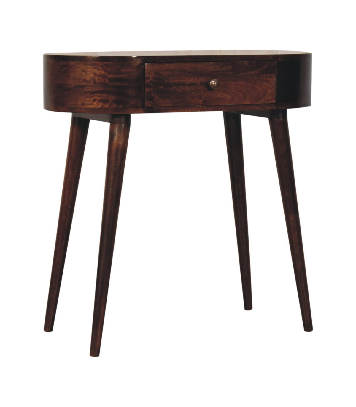 This solid wood console table has been constructed from 100% solid mango wood in a california walnut finish and offers a unique shaped design with rounded edges. It features one small drawer with a shiny knob and Nordic style legs. A great, simple addition to the home.