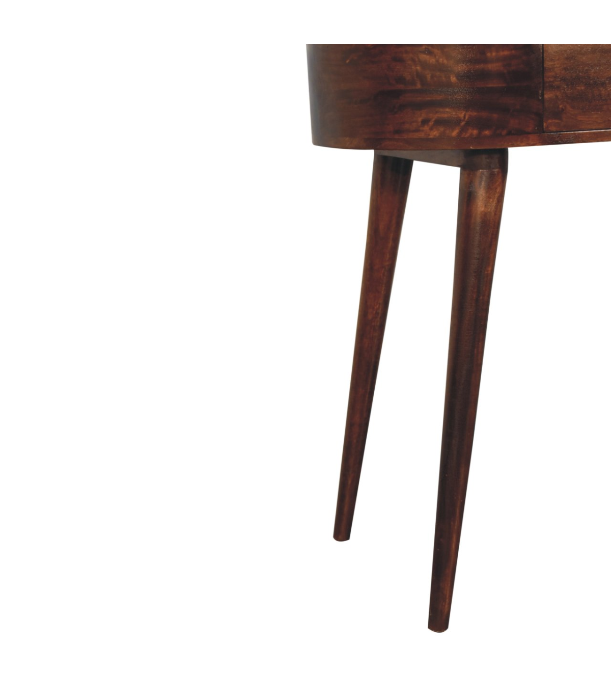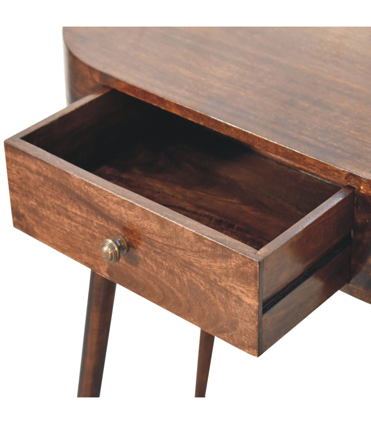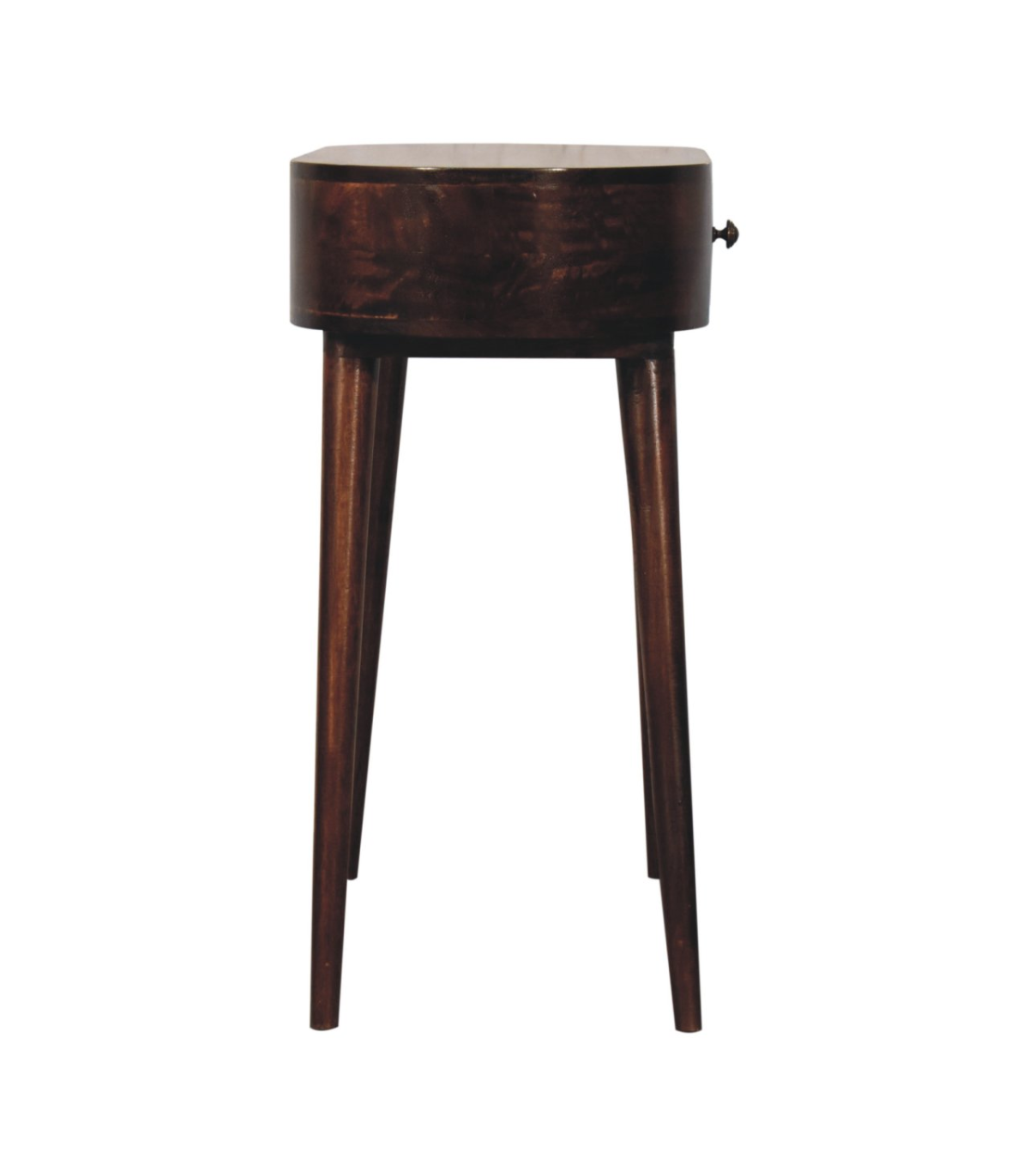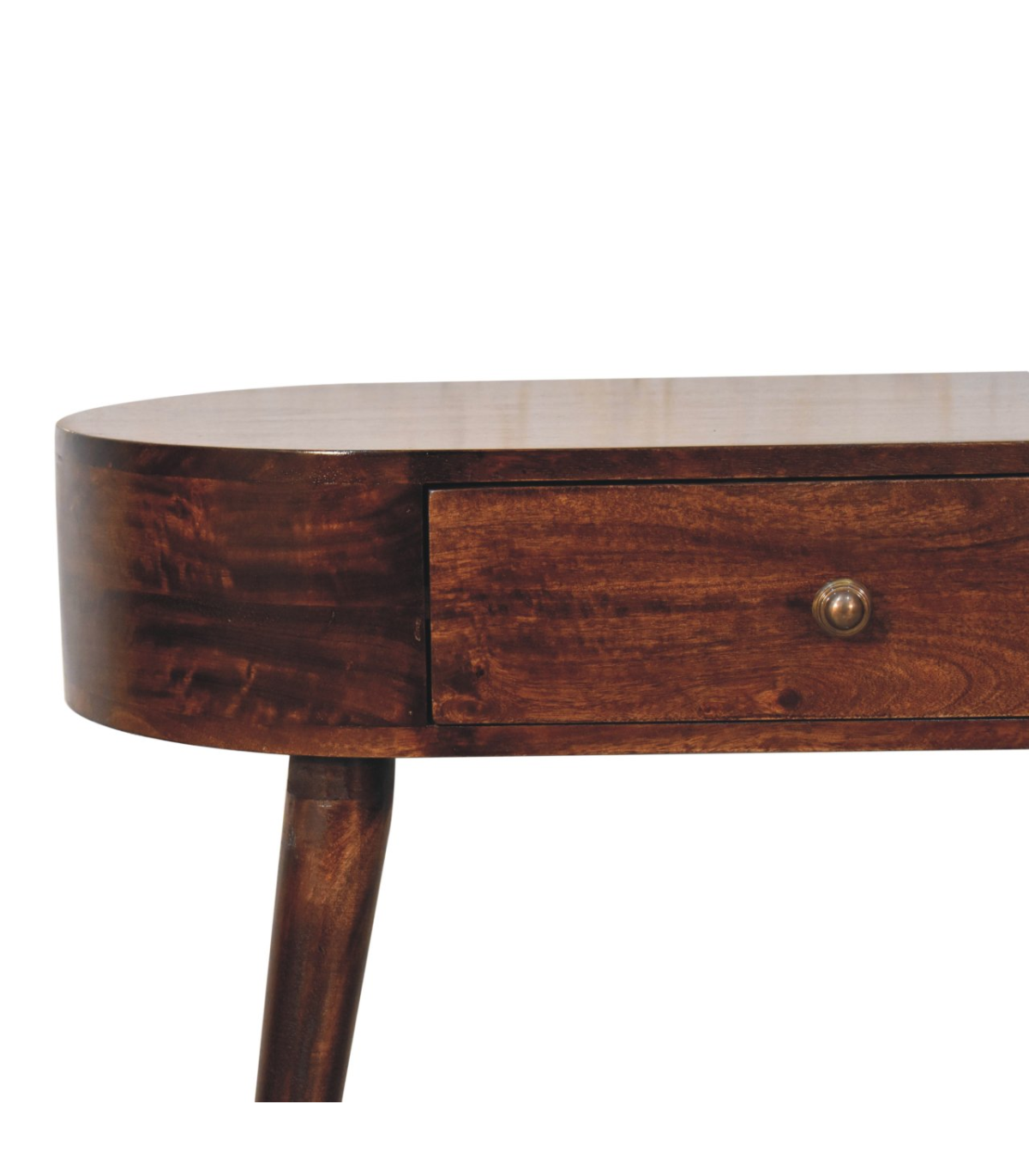 This solid wood console table has been constructed from 100% solid mango wood in a california walnut finish and offers a unique shaped design with rounded edges. It features one small drawer with a shiny knob and Nordic style legs. A great, simple addition to the home.