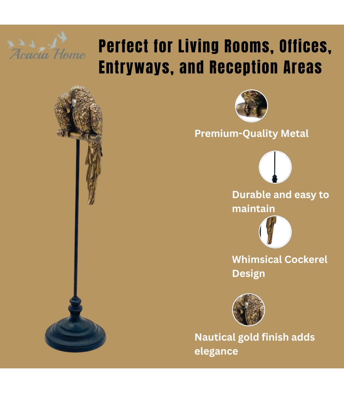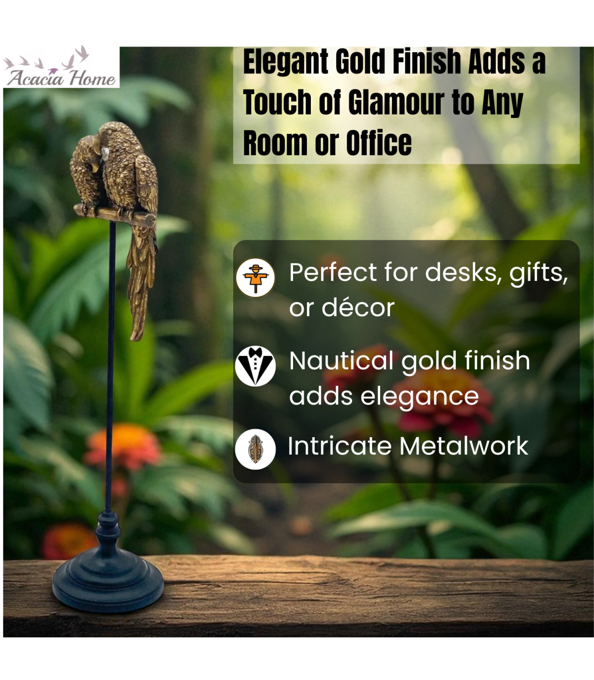 It never flies away. This figurine is large, exotic, and decorative, with a realistic representation of a parrot., Hand FinshedRecycled content