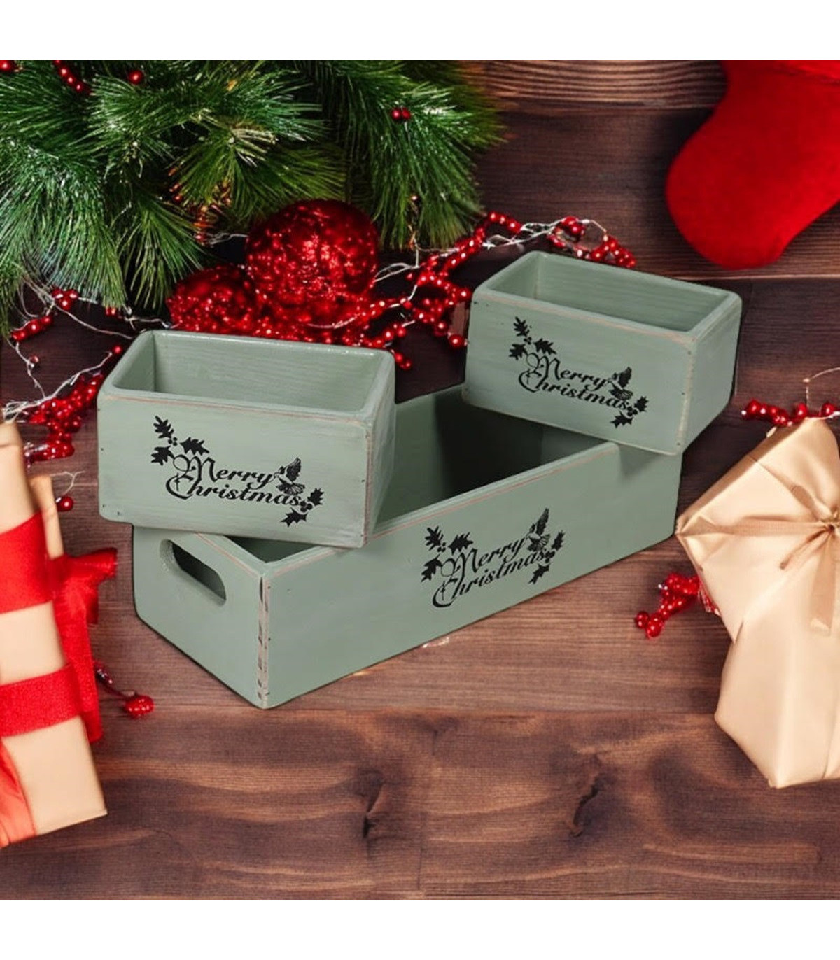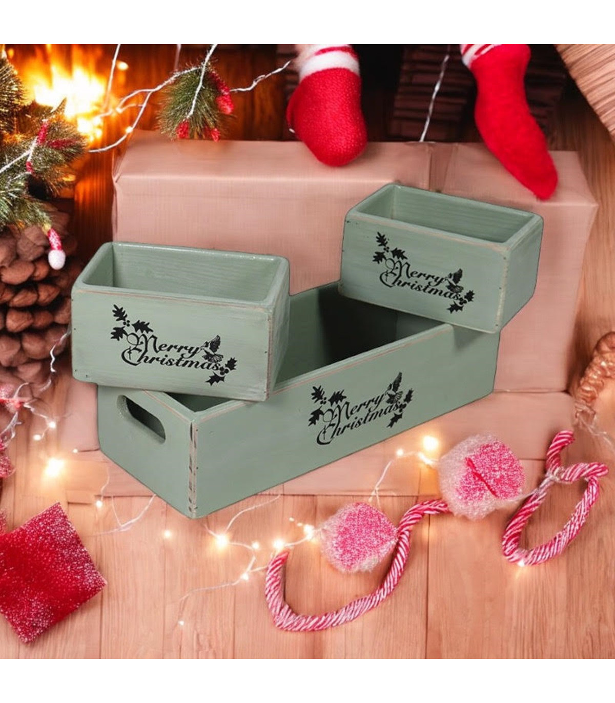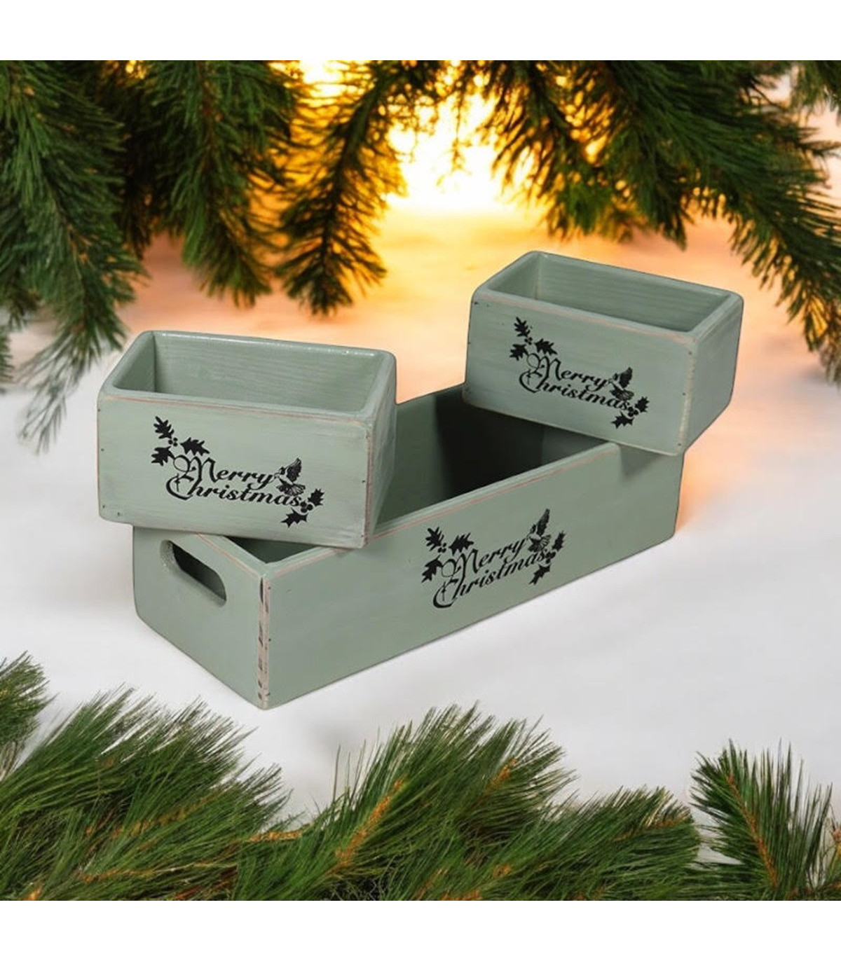 34/15/15CM SET 3 RUSTIC GREEN WOODEN BOXES
