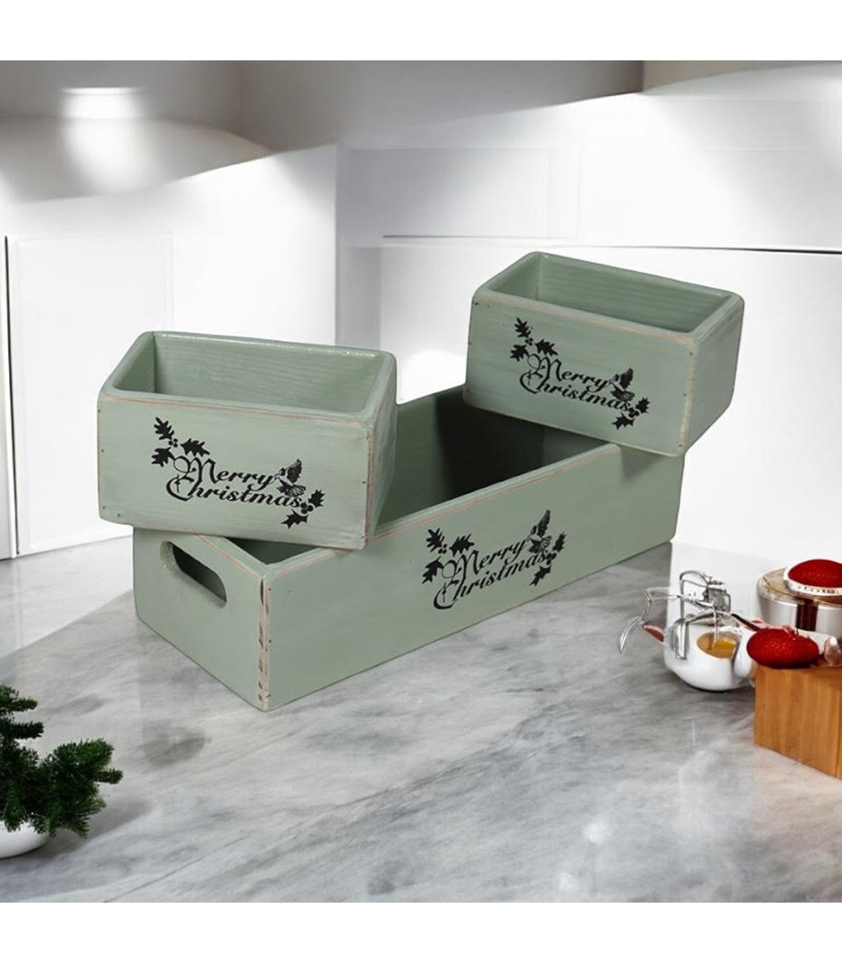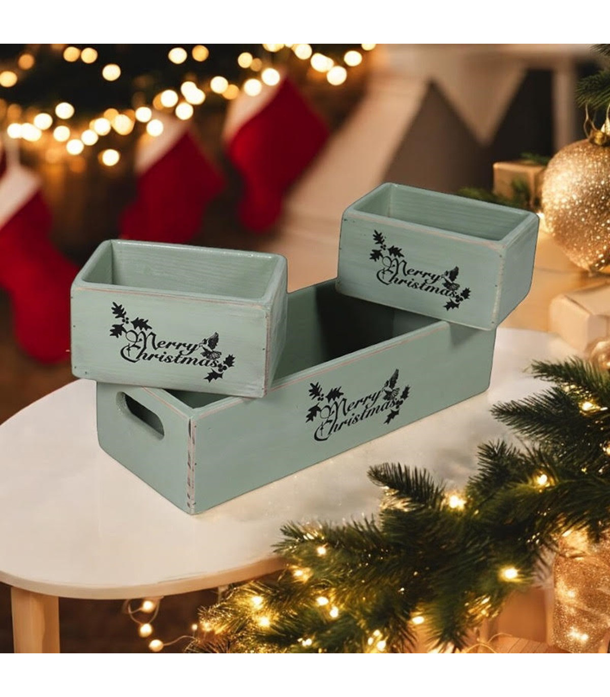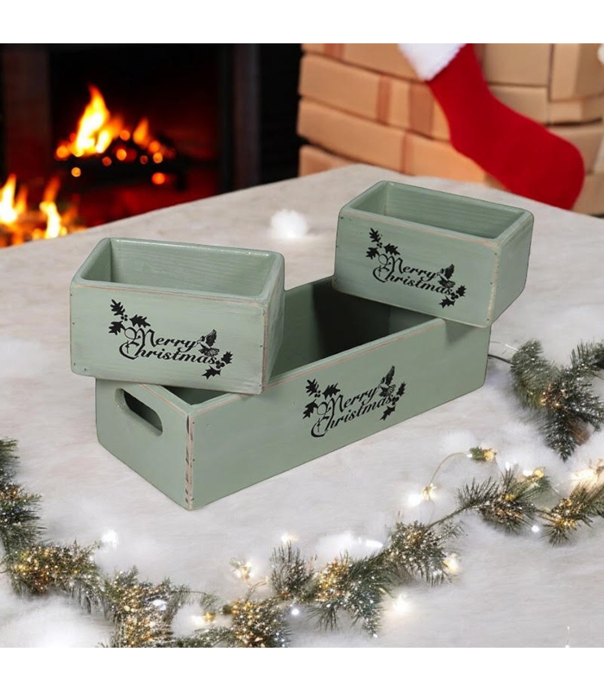 34/15/15CM SET 3 RUSTIC GREEN WOODEN BOXES