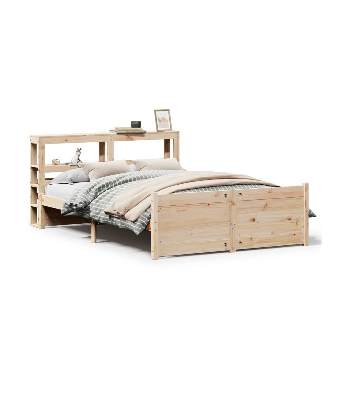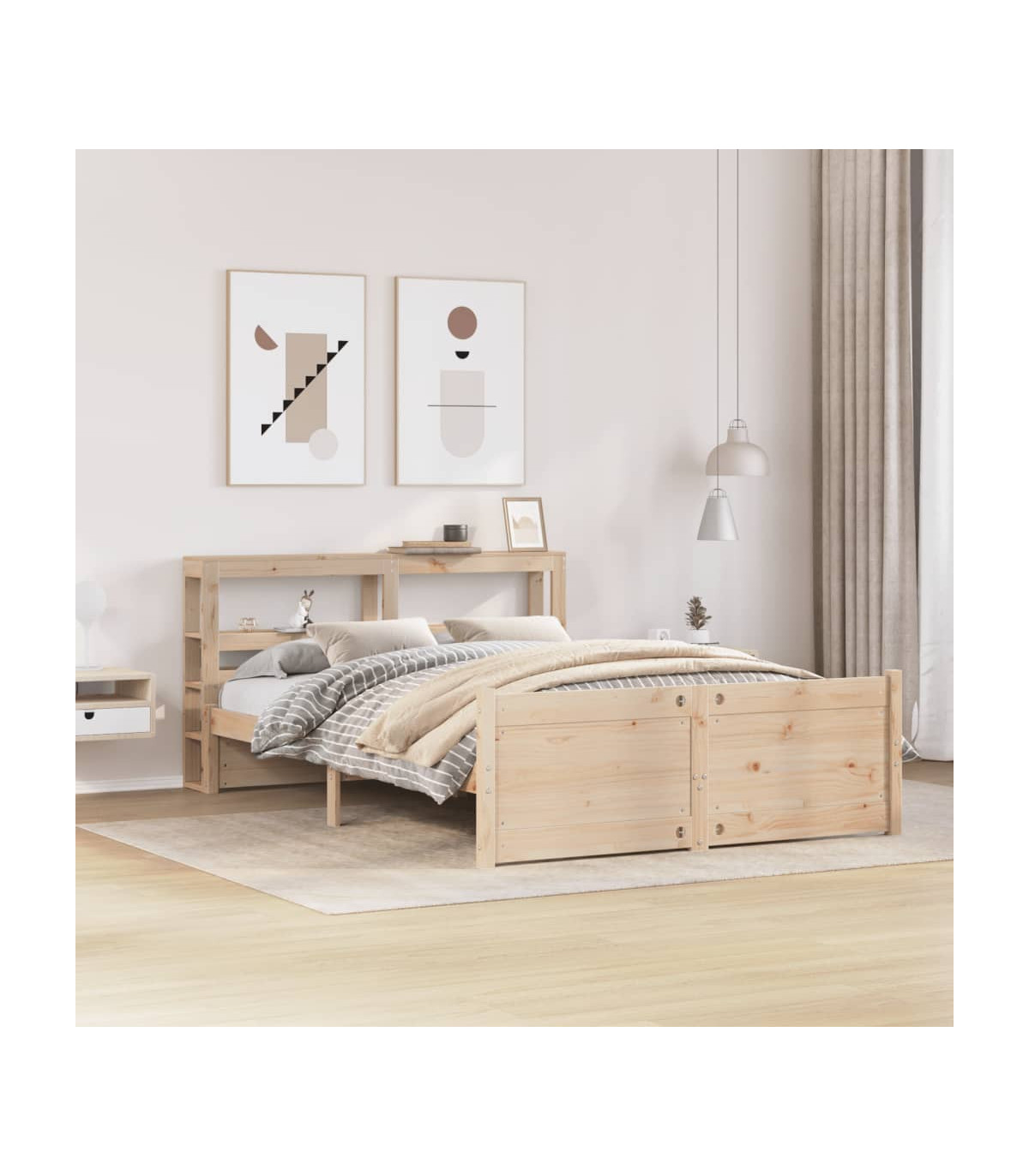 Enjoy a good night's sleep in this wooden bed frame! It makes a practical and decorative addition to your interior. Solid pine wood: Solid pine wood is a beautiful natural material. Pine wood has a straight grain, and the knots give the material its signature, rustic look.Sturdy bed frame: The wooden frame ensures sturdiness and stability. The plywood slats provide good weight distribution, ensuring that the mattress stays in place with every twist and turn of your body during sleep.Functional headboard and footboard: The headboard and footboard of the wooden bed can keep your mattress in place. Also, the headboard provides you with excellent back support when you sit up in bed to read or watch TV.Ample storage space: This sleek headboard features two convenient shelves, offering ample storage space to keep all your nighttime essentials within easy reach. Good to know:A mattress is not included with this bed. We do offer a various selection of mattresses. You can check our shop for a matching mattress.