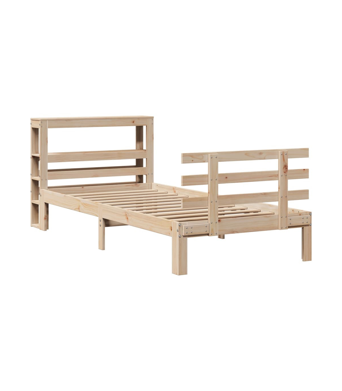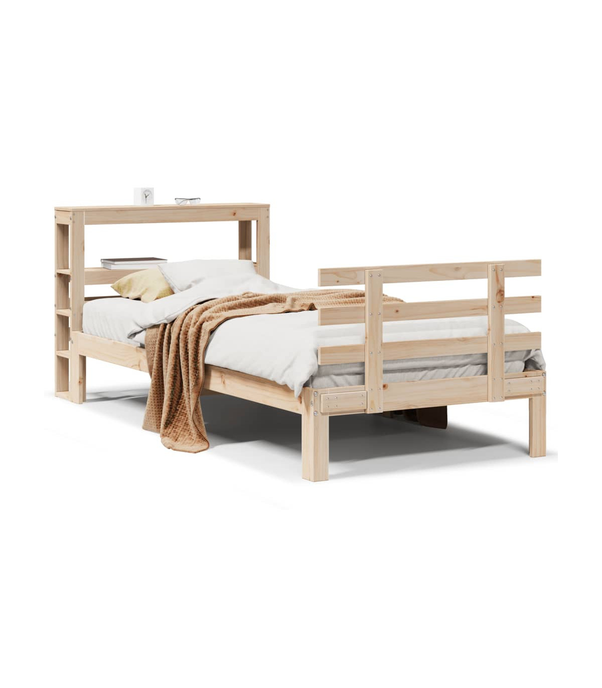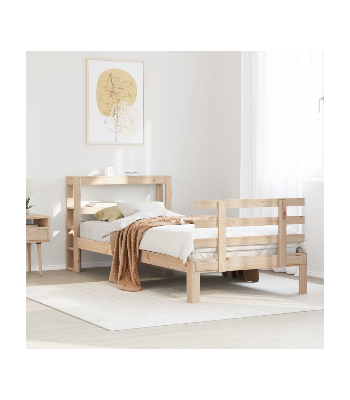Enjoy a good night's sleep in this wooden bed frame! It makes a practical and decorative addition to your interior. Solid pine wood: Solid pine wood is a beautiful natural material. Pine wood has a straight grain, and the knots give the material its signature, rustic look.Sturdy bed frame: The wooden frame ensures sturdiness and stability. The plywood slats provide good weight distribution, ensuring that the mattress stays in place with every twist and turn of your body during sleep.Functional headboard and footboard: The headboard and footboard of the wooden bed can keep your mattress in place. Also, the headboard provides you with excellent back support when you sit up in bed to read or watch TV.Ample storage space: This sleek headboard features two convenient shelves, offering ample storage space to keep all your nighttime essentials within easy reach. Good to know:A mattress is not included with this bed. We do offer a various selection of mattresses. You can check our shop for a matching mattress.