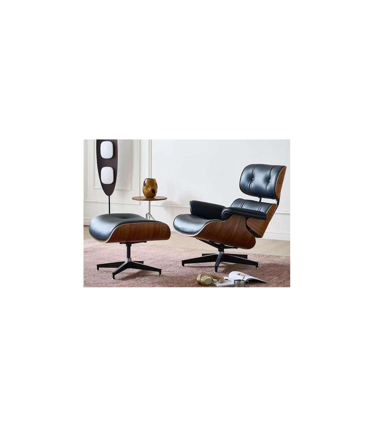 EAMES REPLICA BLACK LEATHER CHAIR & STOOL