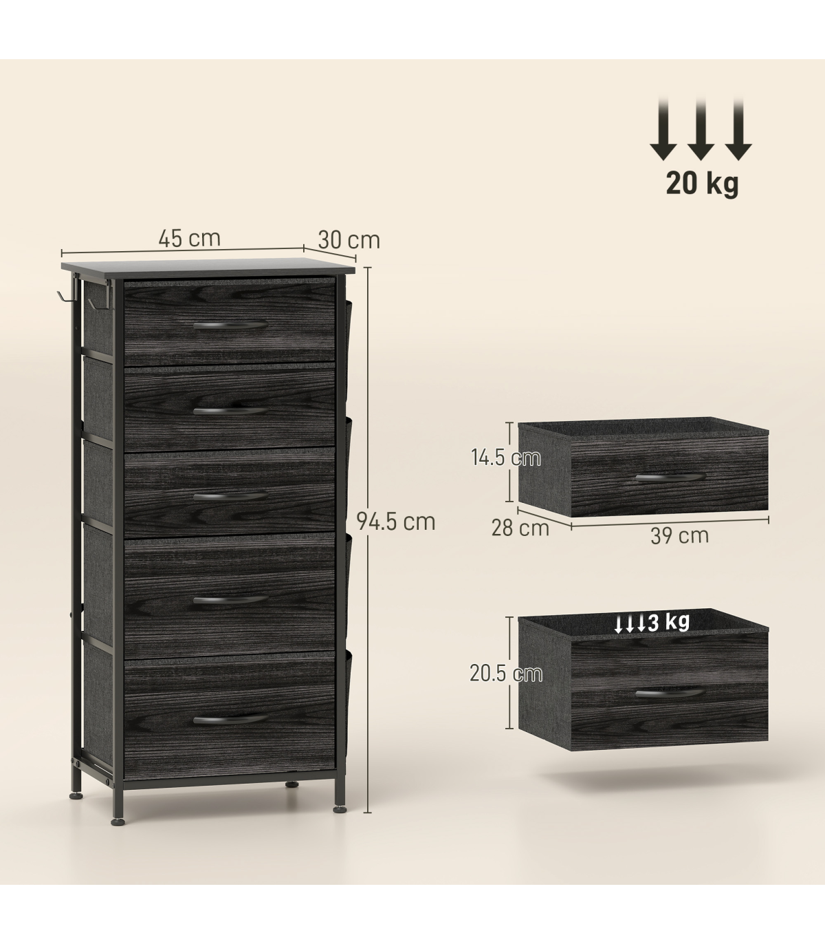 - Maximum Load: 10 kg (Top), 3 kg (Each Drawer), 20 kg (Total)