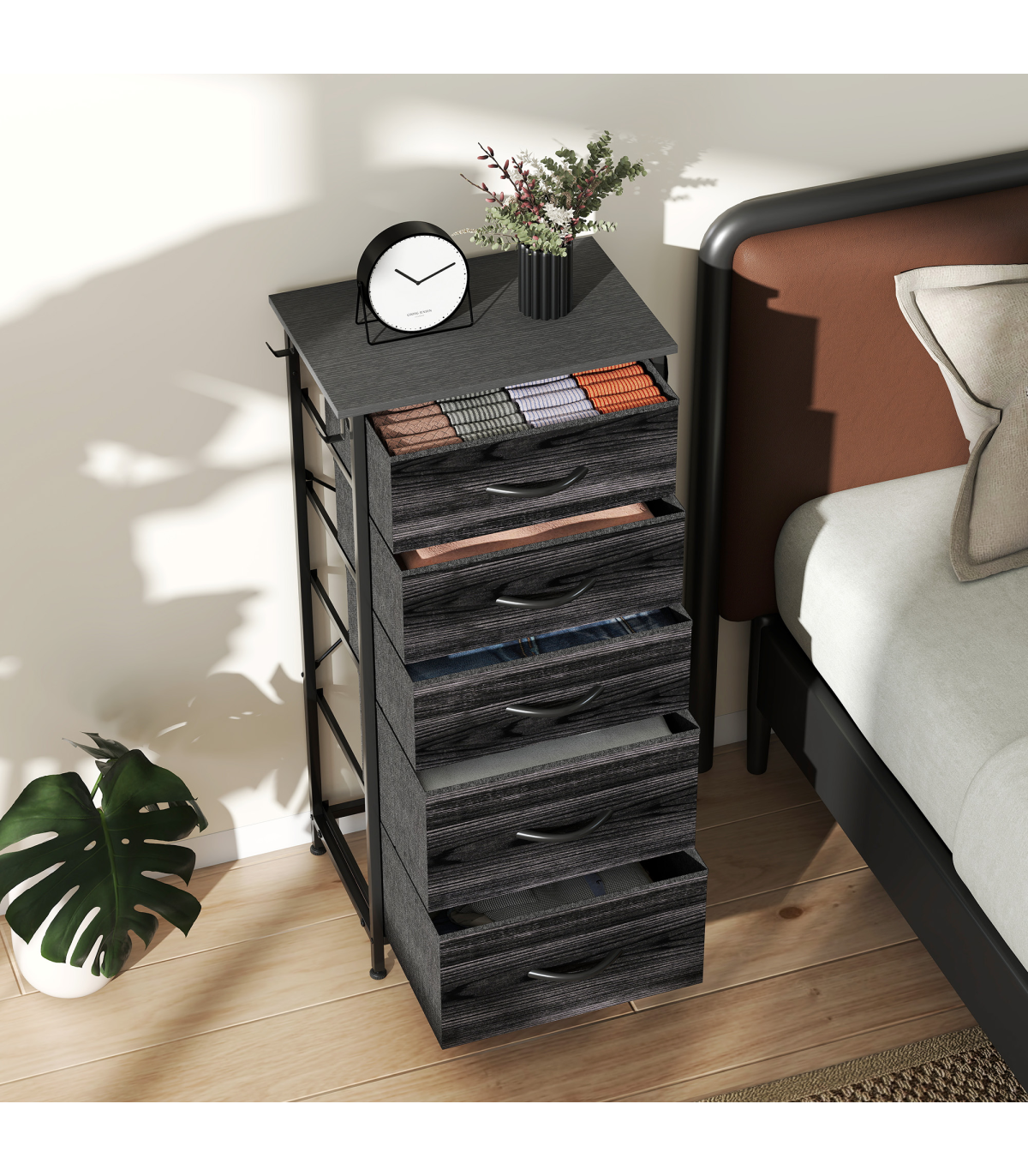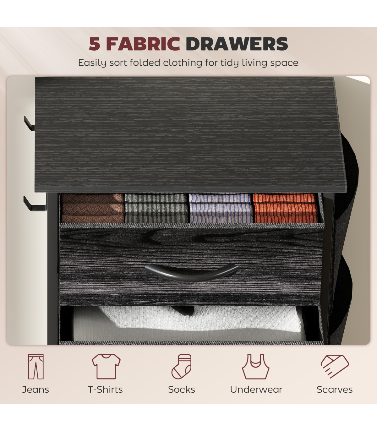 - Three small and two large drawers: plenty of room for storing and organising clothes