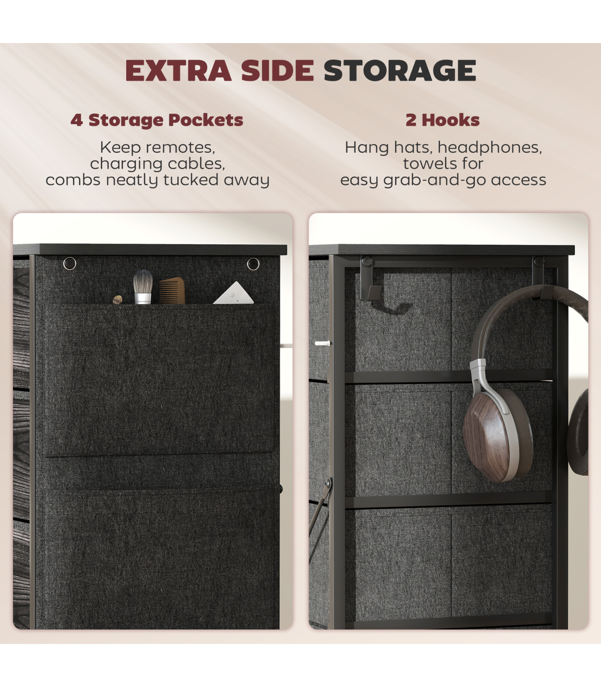 - Soft fabric drawers fitted with handles to open/close easily