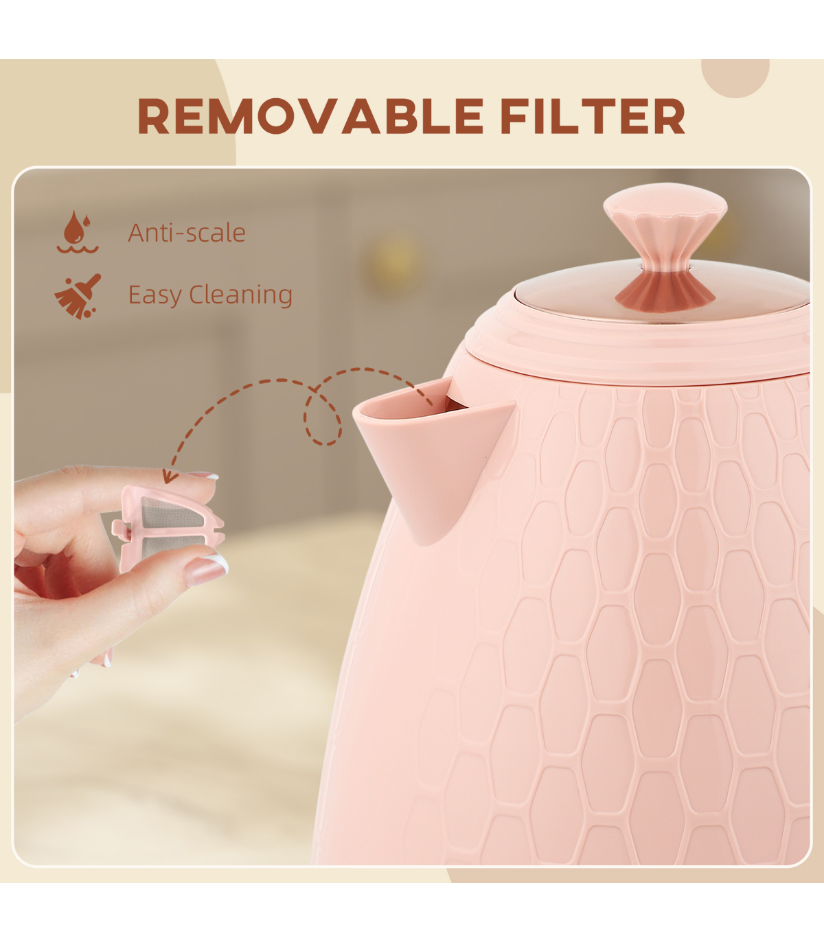 - Removable spout filter helps prevents limescale build-up
